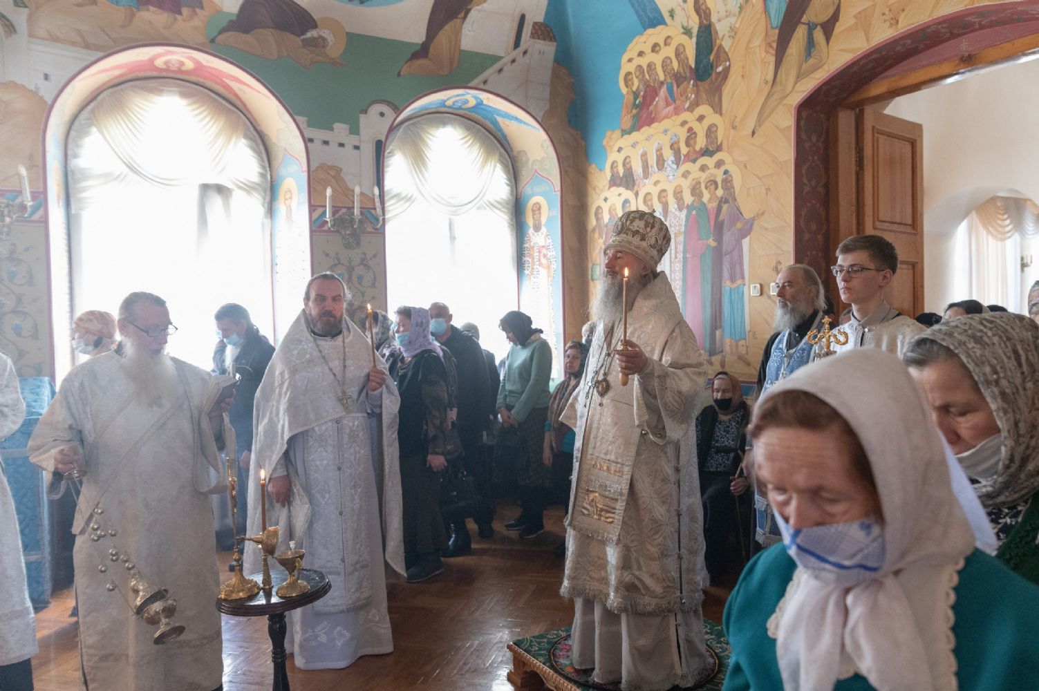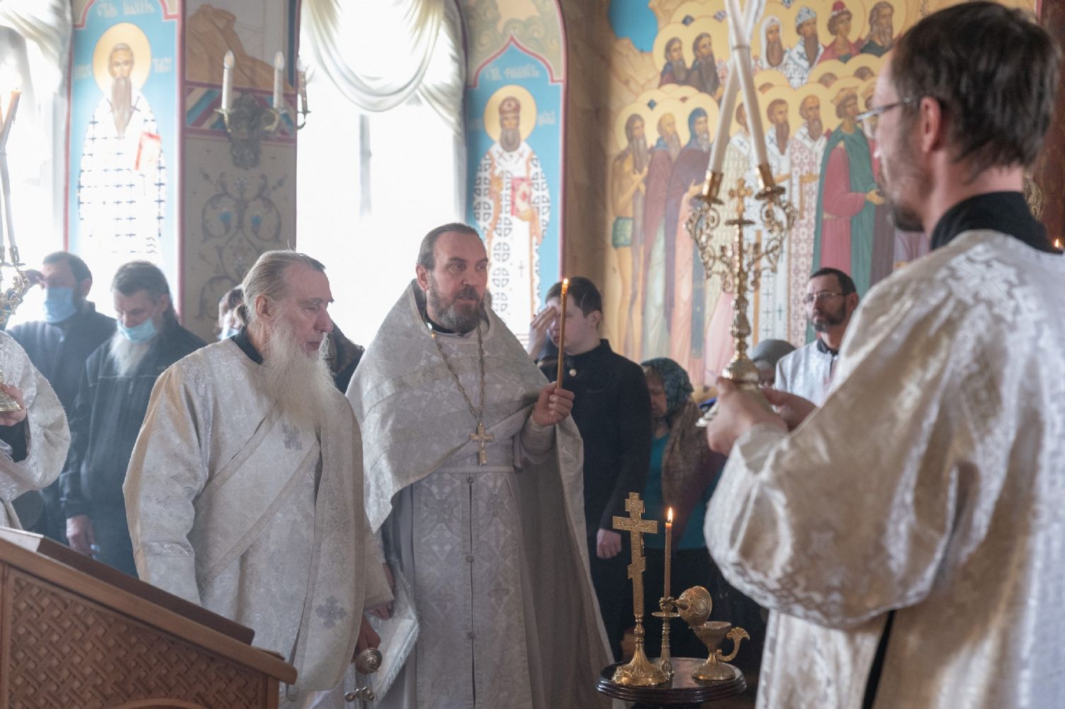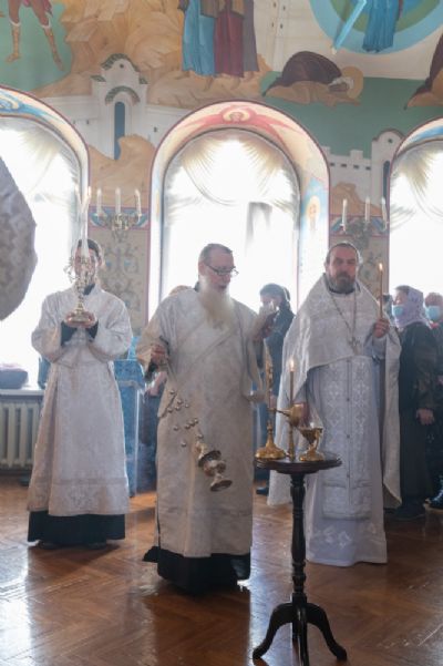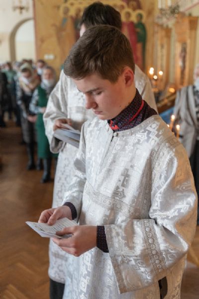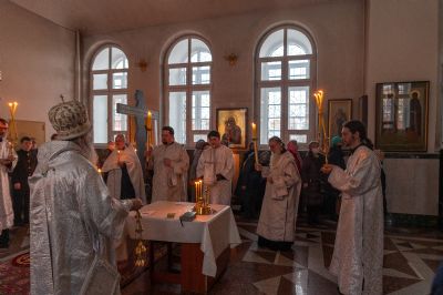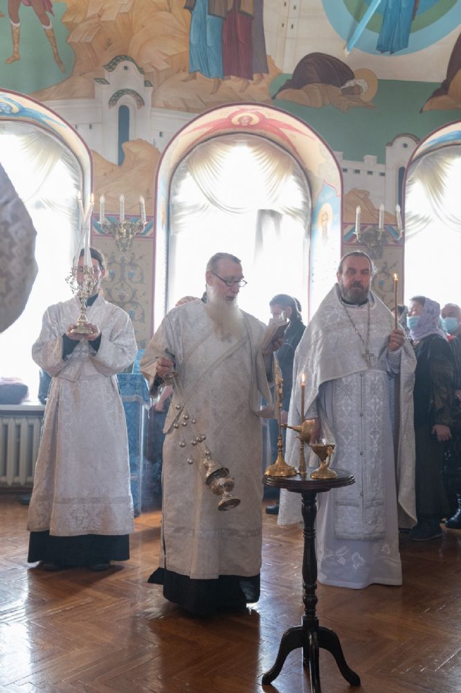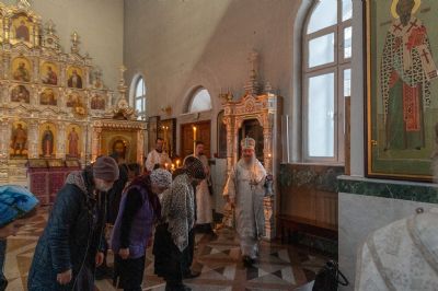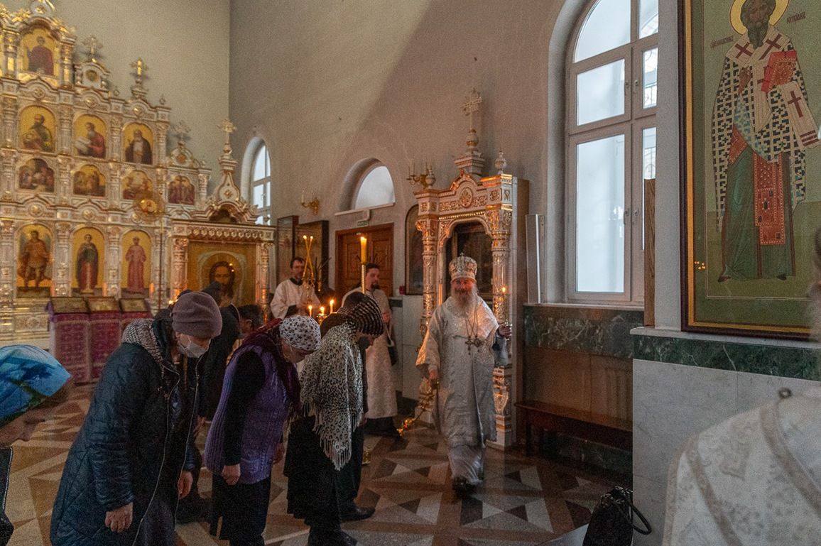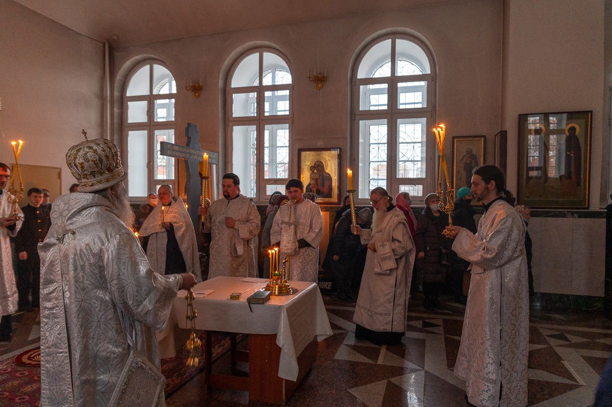 В Воскресенском соборе архипастырю сослужили настоятель собора иерей Алексий Кирюшкин, клирики собора иереи Леонид Вылекжанин, Андрей Кочаков, Димитрий Лукьянов, диакон Алексий Кузнецов и клирик храма Рождества Пресвятой Богородицы с. Семеновка протодиакон Михаил Козловский. Песнопения исполнял хор под управлением Анастасии Полозовой.