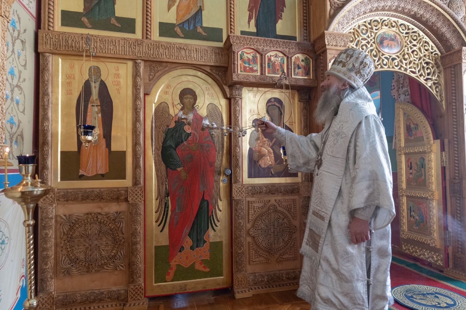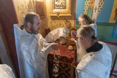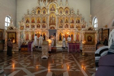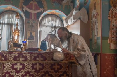 На Литургии Его Высокопреосвященству сослужили секретарь епархиального управления иеромонах Серафим (Пасанаев) и клирик храма Рождества Пресвятой Богородицы с. Семёновка протодиакон Михаил Козловский. Песнопения исполнял хор «Благовест» под управлением Татьяны Черновой.