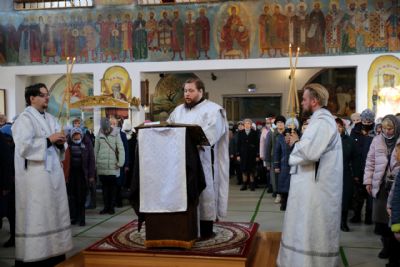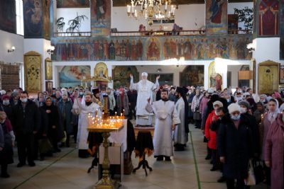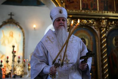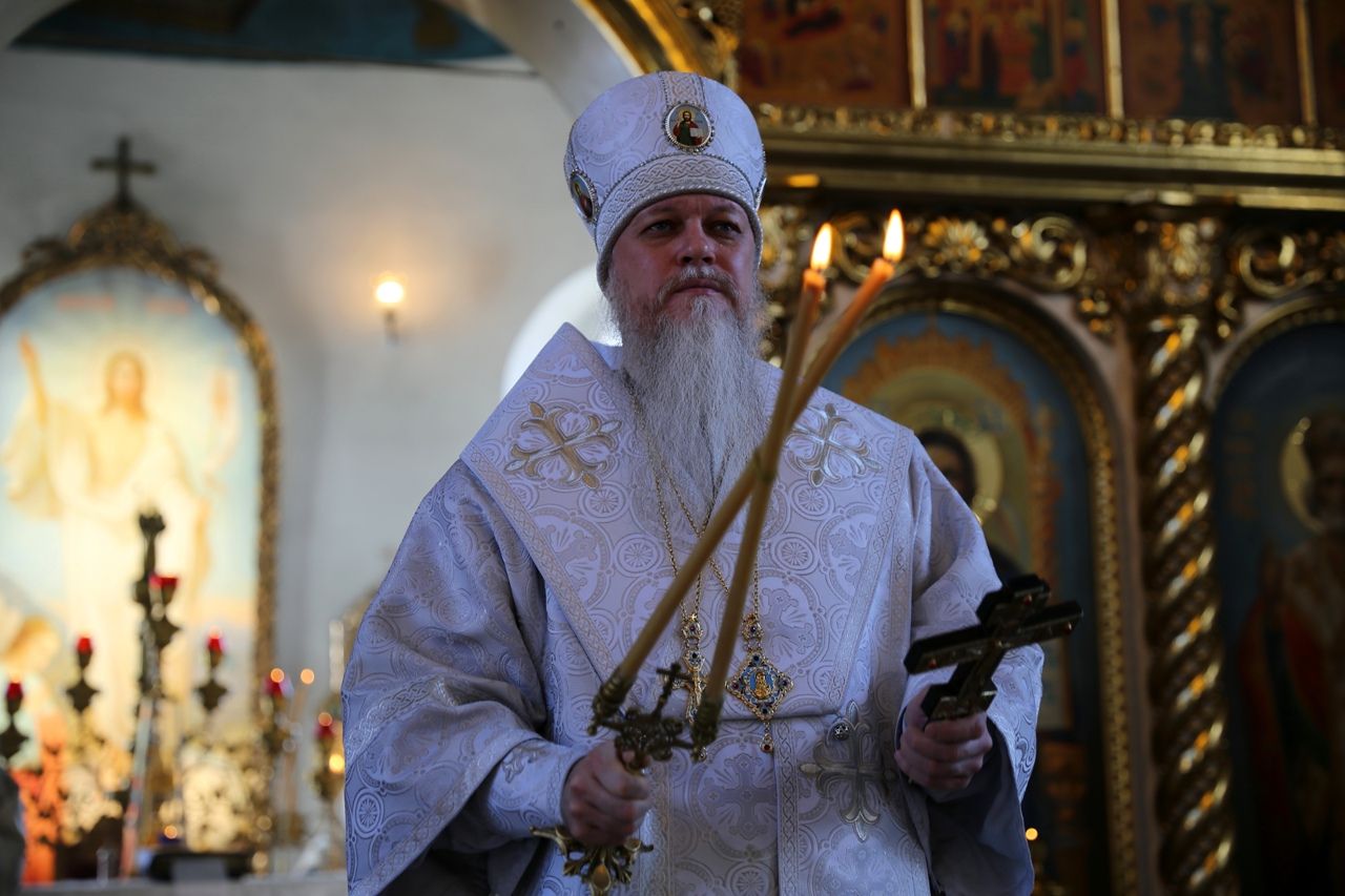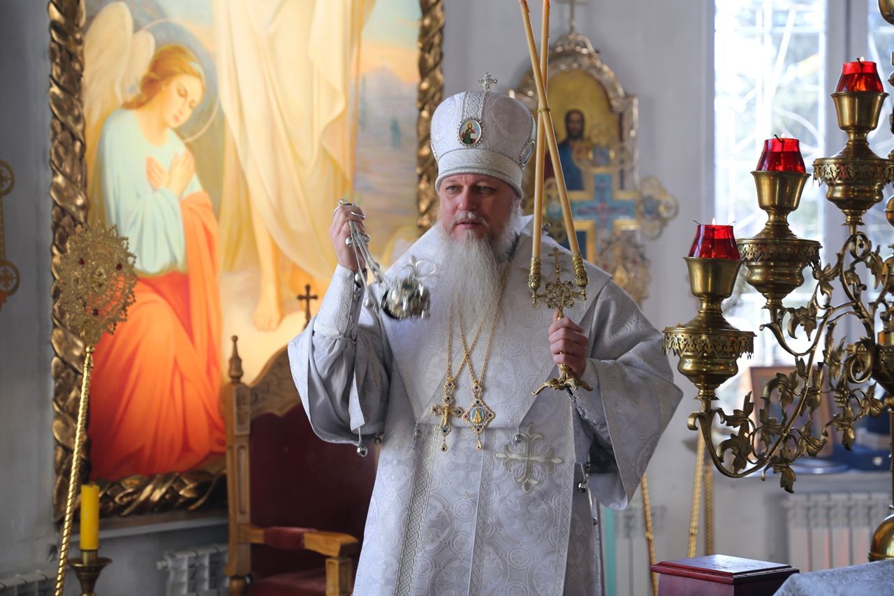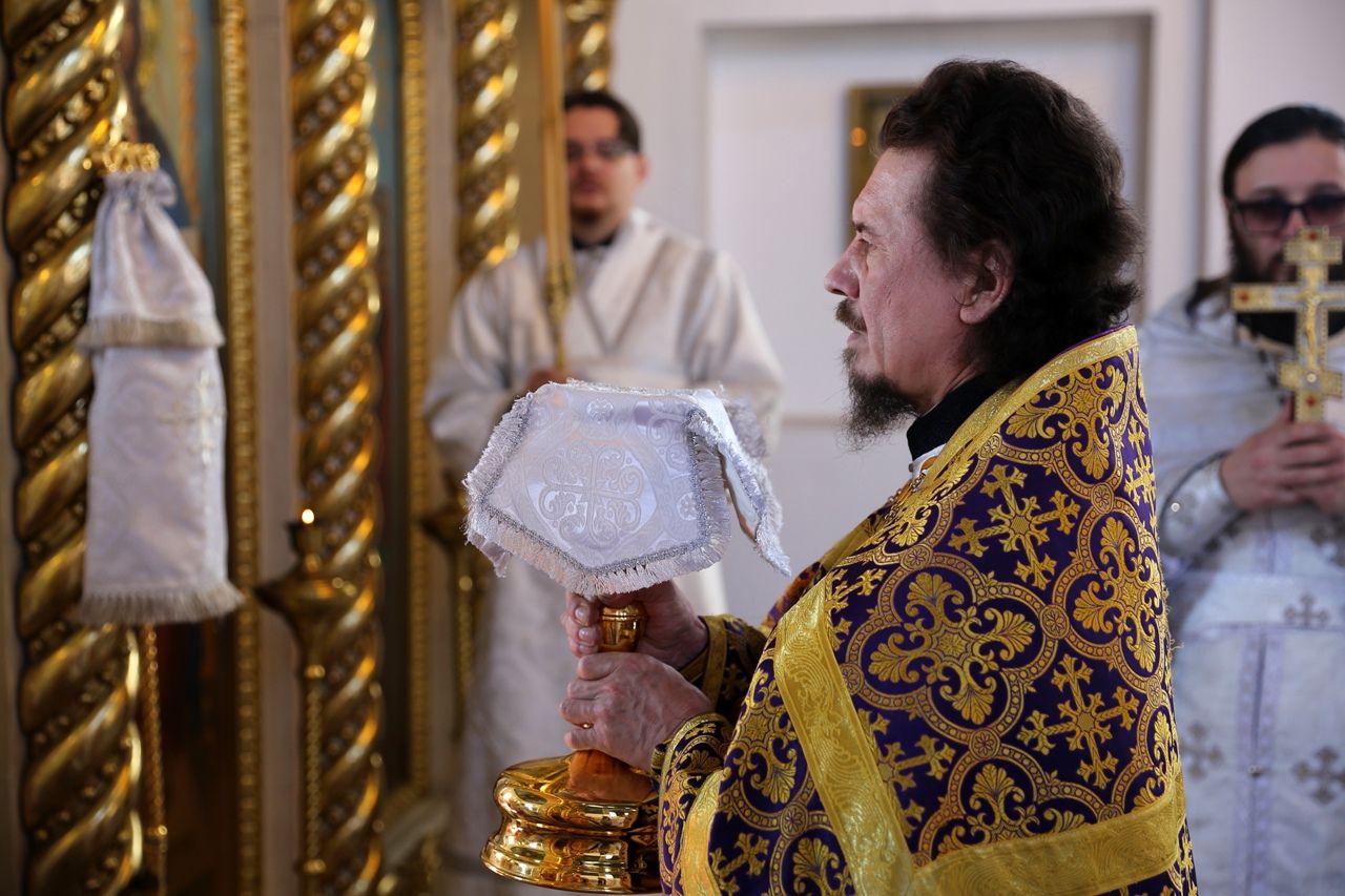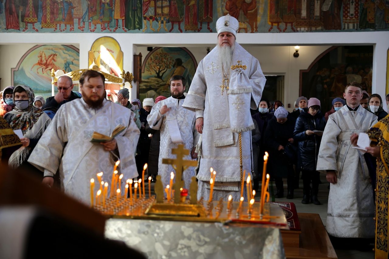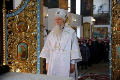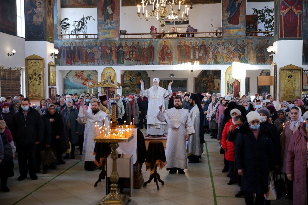 Его Преосвященству сослужили клирики кафедрального собора. Песнопения исполнял архиерейский хор.