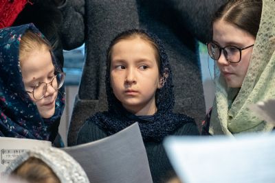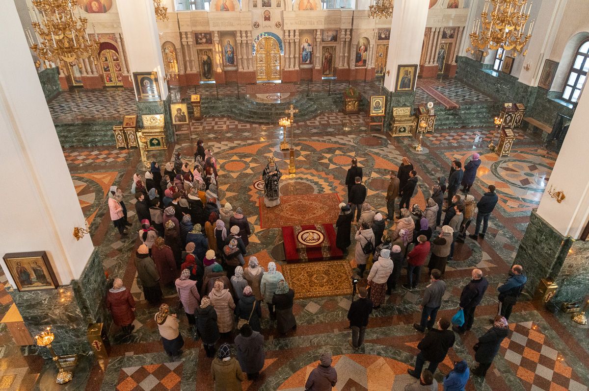 Его Высокопреосвященству сослужили секретарь Йошкар-Олинского епархиального управления иеромонах Серафим (Пасанаев), ключарь кафедрального собора протоиерей Сергий Поглазов, клирики собора и клирик храма Рождества Пресвятой Богородицы с. Семеновка протодиакон Михаил Козловский. Песнопения исполняли хор «Благовест» под управлением Татьяны Черновой и вокальный квартет кафедрального собора под управлением иерея Евгения Самойлова.