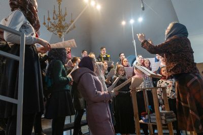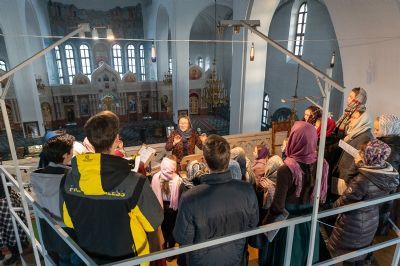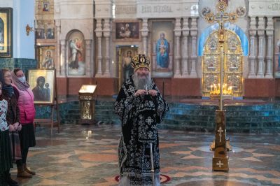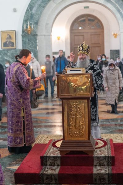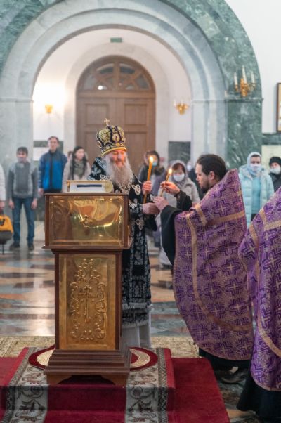 В центре храма митрополит Иоанн читал главы из Евангелия от Марка о предании Иудой Иисуса Христа, страданиях и распятии Спасителя. После чтения Евангелия Владыка обратился с проповедью к собравшимся: