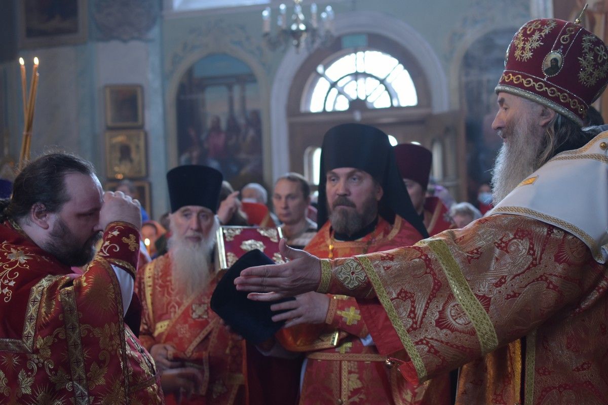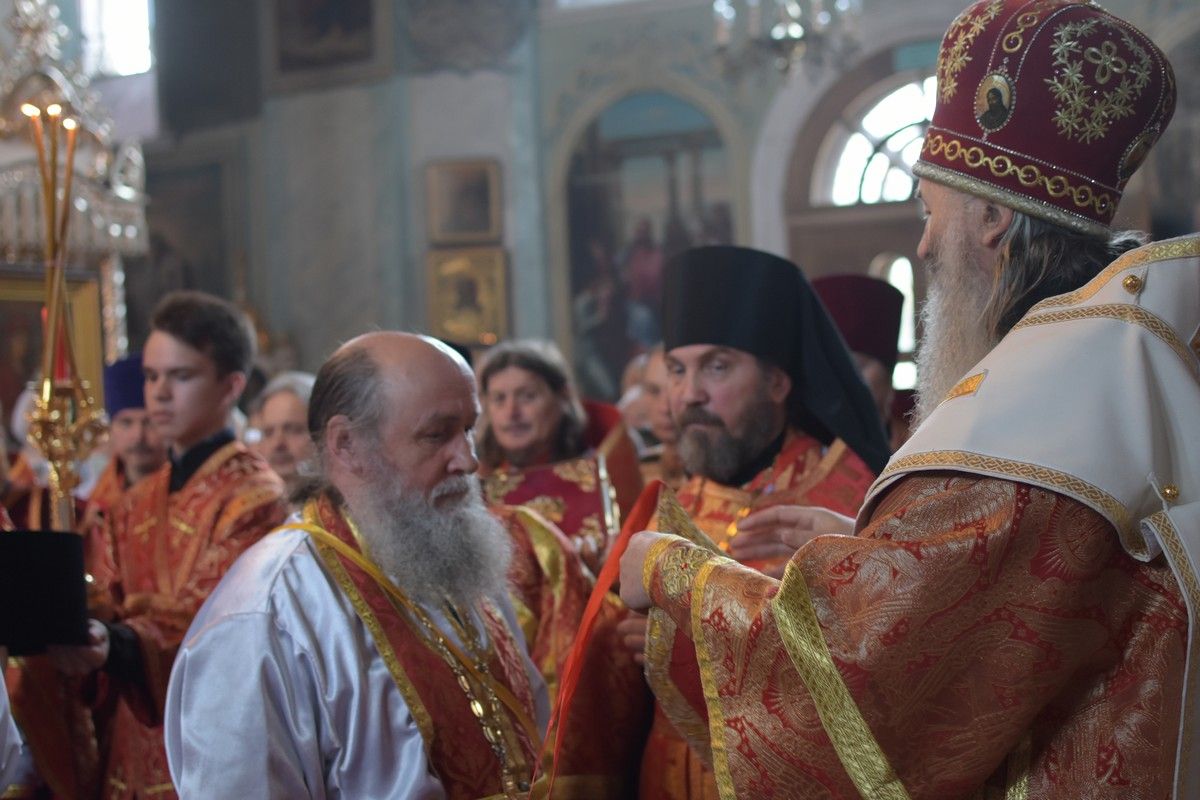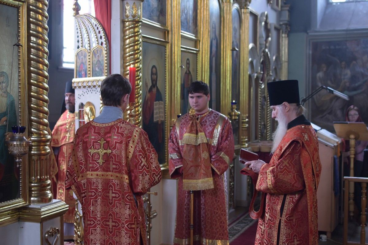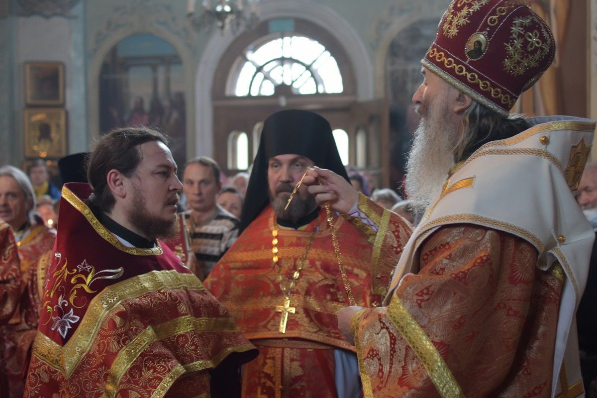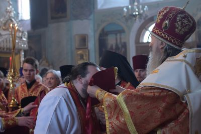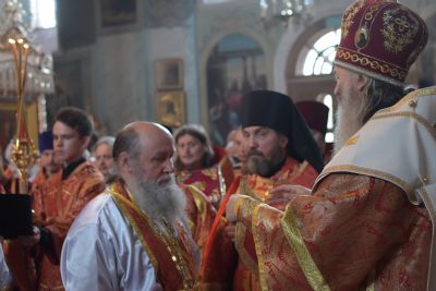 На входе с Евангелием митрополит Иоанн вручил богослужебно-иерархические награды клирикам Горномарийского благочиния: права служения Литургии с открытыми Царскими вратами до «Иже херувимы» удостоен протоиерей Николай Барсуков, права ношения палицы – протоиерей Алексий Сущев и протоиерей Николай Соколов, права ношения наперсного креста – иерей Алексий Семенов.