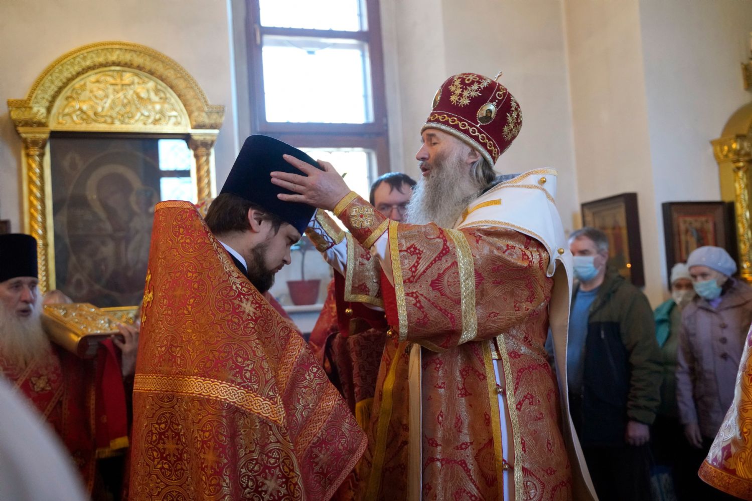 На входе с Евангелием митрополит Иоанн вручил богослужебно-иерархические награды клирикам Успенского храма: иерей Никита Иванов удостоен права ношения камилавки, иерей Вячеслав Булычев – права ношения набедренника.
