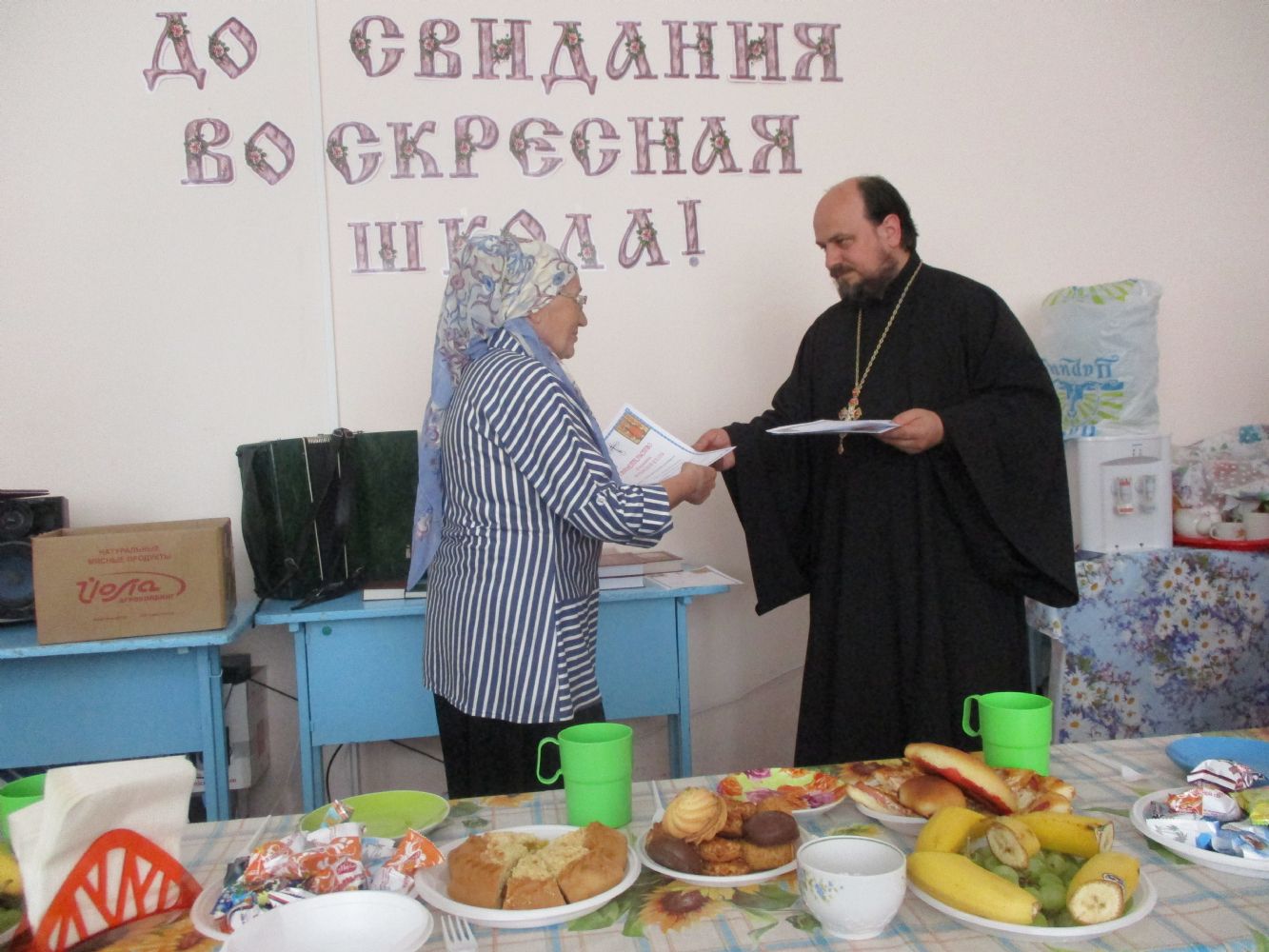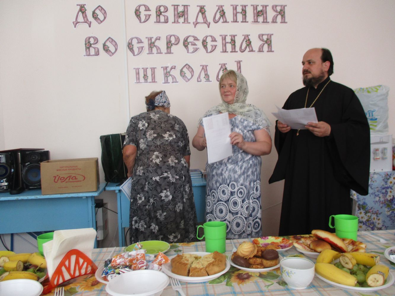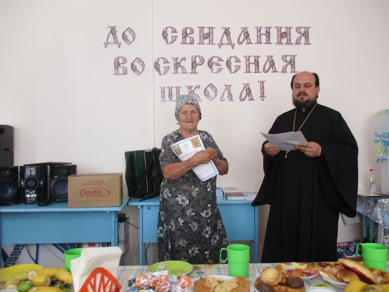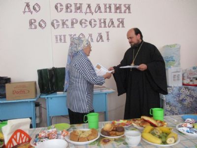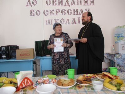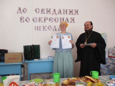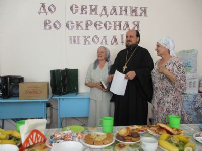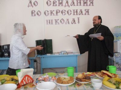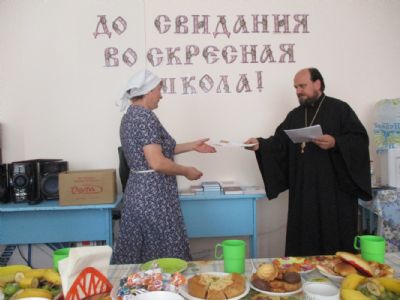 Праздничное мероприятие состоялось в здании Центра досуга п. Советский, в котором расположено помещение воскресной школы. К собравшимся обратился с приветственным и одновременно напутственным словом настоятель храма Всех святых в земле Российской просиявших протоиерей Николай Ярошевич. Отец Николай также является бессменным учителем в обеих – взрослой и детской – школах. Он отметил, что воскресная школа дает не только религиозное образование, но призвана формировать и православное мировоззрение с вытекающим отсюда изменением образа жизни. Выпускник взрослой воскресной школы должен стать образцом поведения для родных, близких и всех людей, с которыми сталкивают нас жизненные обстоятельства. Батюшка пожелал всем духовных и физических сил следовать по избранному ими жизненному пути, а также здоровья и иных жизненных благ. Выпускникам были вручены свидетельства об окончании воскресной школы и вручены подарки (книги).