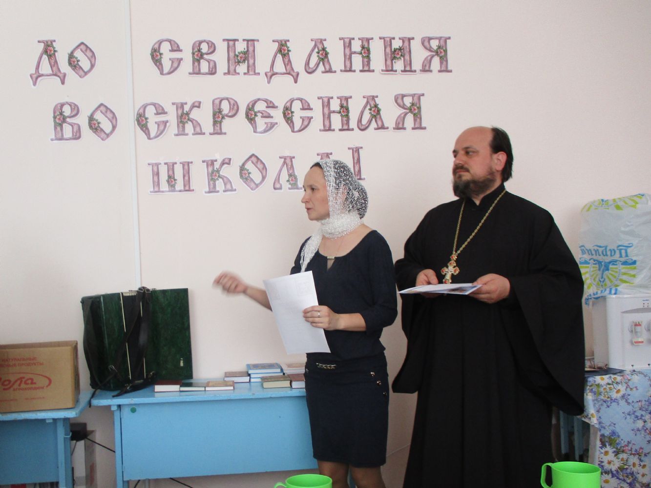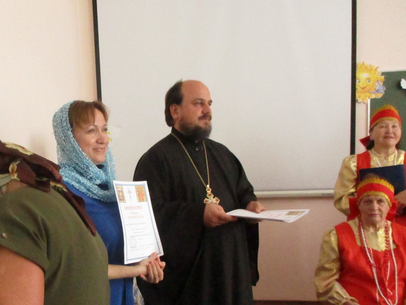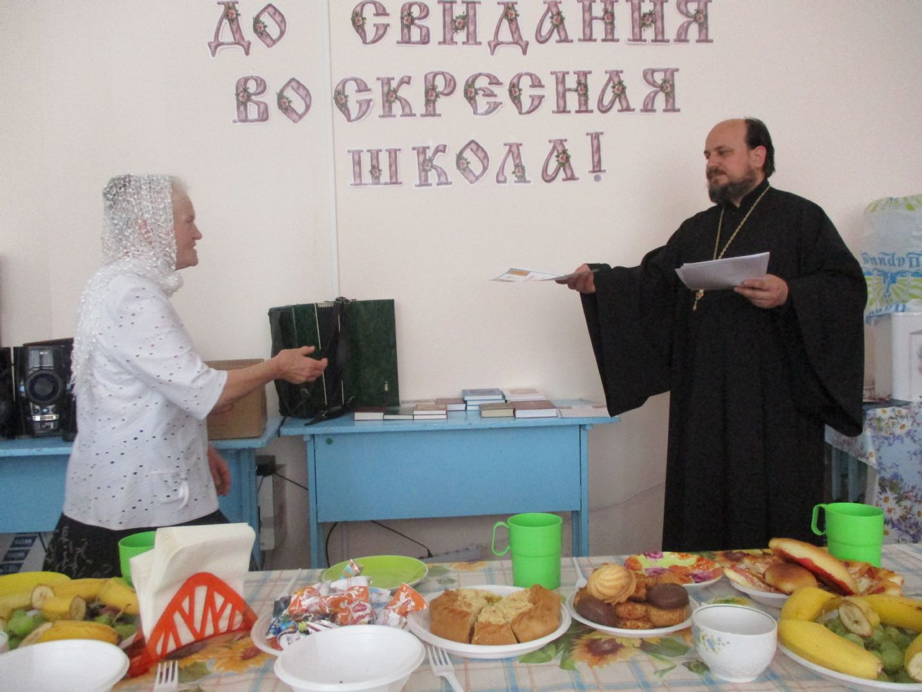 Праздничное мероприятие состоялось в здании Центра досуга п. Советский, в котором расположено помещение воскресной школы. К собравшимся обратился с приветственным и одновременно напутственным словом настоятель храма Всех святых в земле Российской просиявших протоиерей Николай Ярошевич. Отец Николай также является бессменным учителем в обеих – взрослой и детской – школах. Он отметил, что воскресная школа дает не только религиозное образование, но призвана формировать и православное мировоззрение с вытекающим отсюда изменением образа жизни. Выпускник взрослой воскресной школы должен стать образцом поведения для родных, близких и всех людей, с которыми сталкивают нас жизненные обстоятельства. Батюшка пожелал всем духовных и физических сил следовать по избранному ими жизненному пути, а также здоровья и иных жизненных благ. Выпускникам были вручены свидетельства об окончании воскресной школы и вручены подарки (книги).