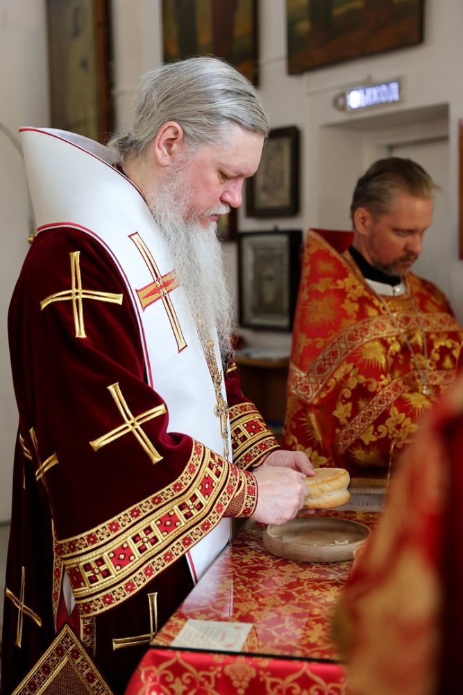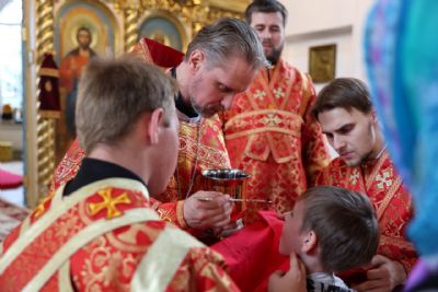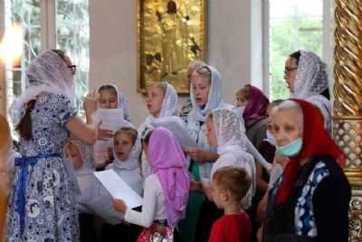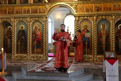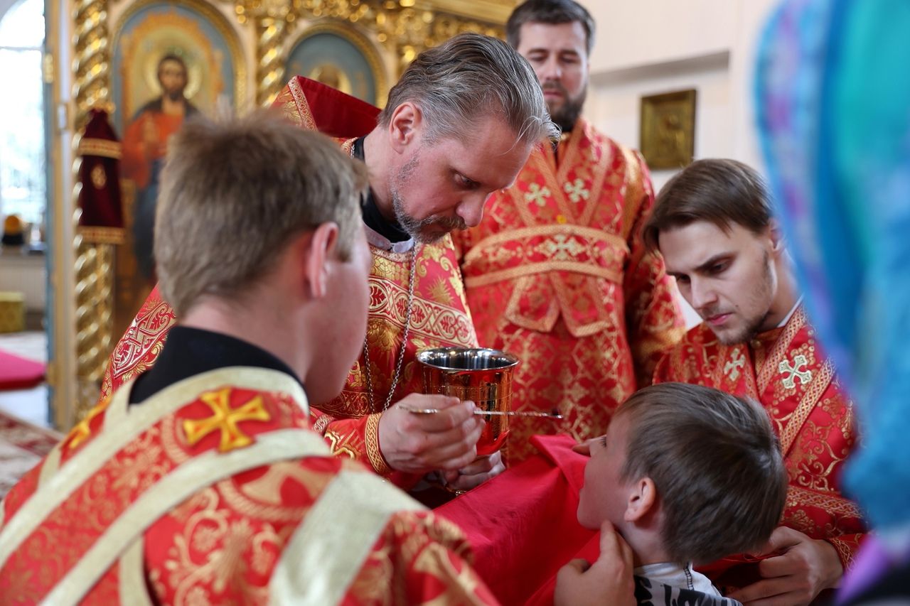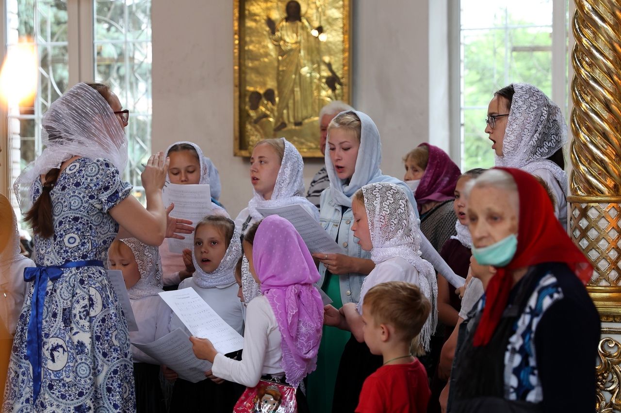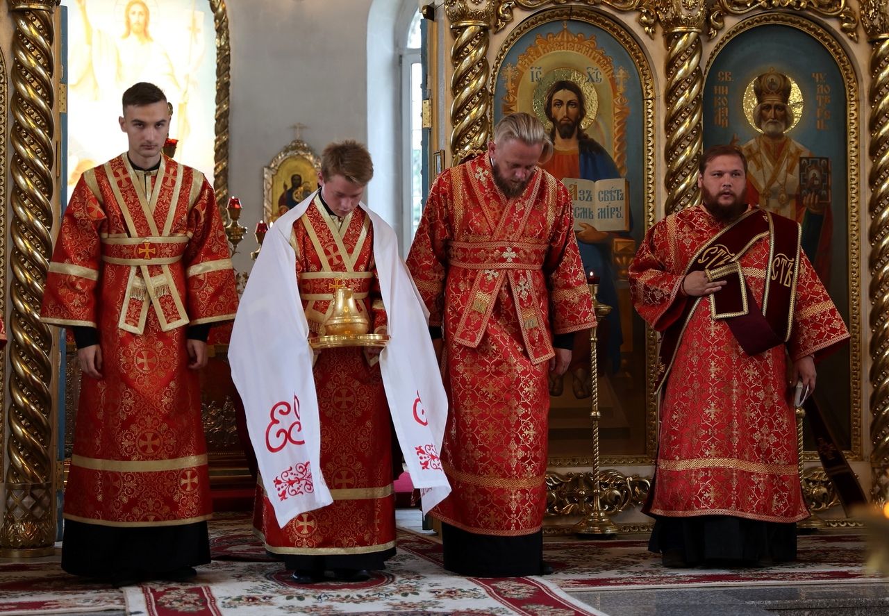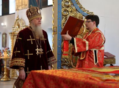 Его Преосвященству сослужили клирики кафедрального собора. Богослужебные песнопения исполняли певчие архиерейского хора и детско-юношеского хора.