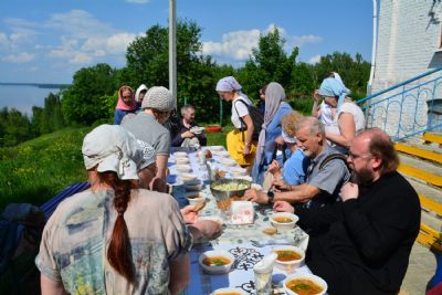 Настоятель храма протоиерей Виктор Соловьев вместе со своей семьей встретили паломников, среди которых были и выпускники курсов, которые после экзаменационных испытаний захотели прикоснуться к святыне, поговорить с настоятелем, вознести благодарственные молитвы и просто полюбоваться красотой тех мест. А любоваться есть чем – с крутого берега открываются потрясающие виды. Само соединение трех рек поражает своим величием. А на противоположном берегу Юнги стоит возрождающийся белоснежный Покровский храм.