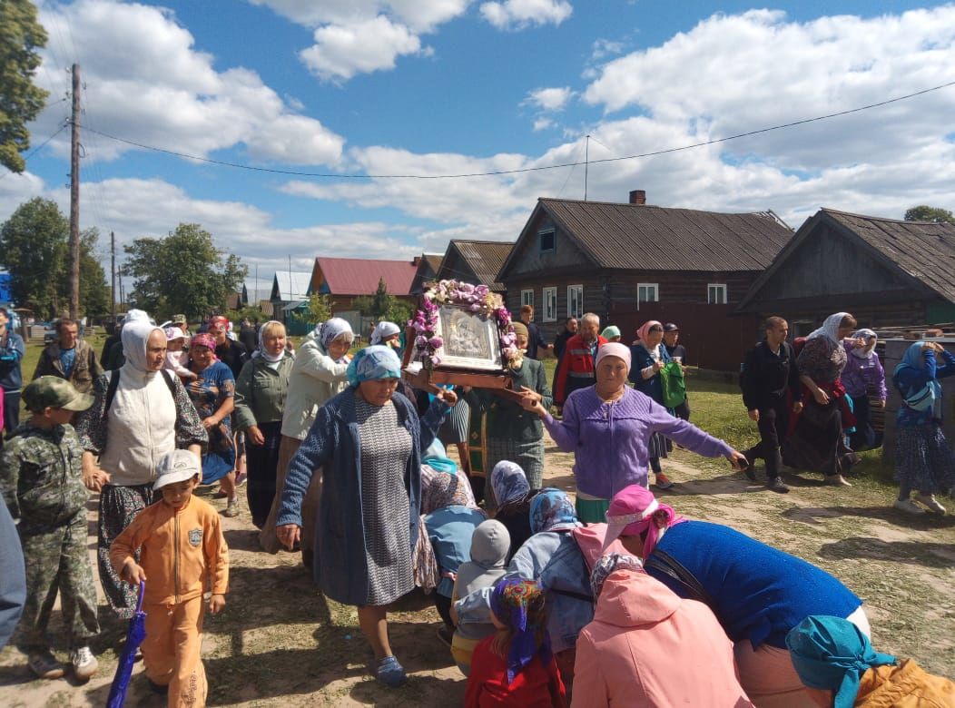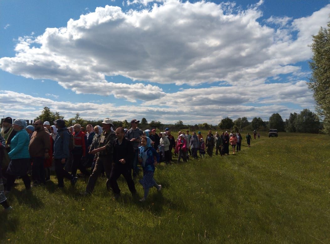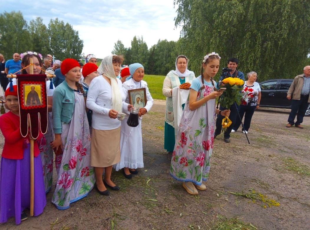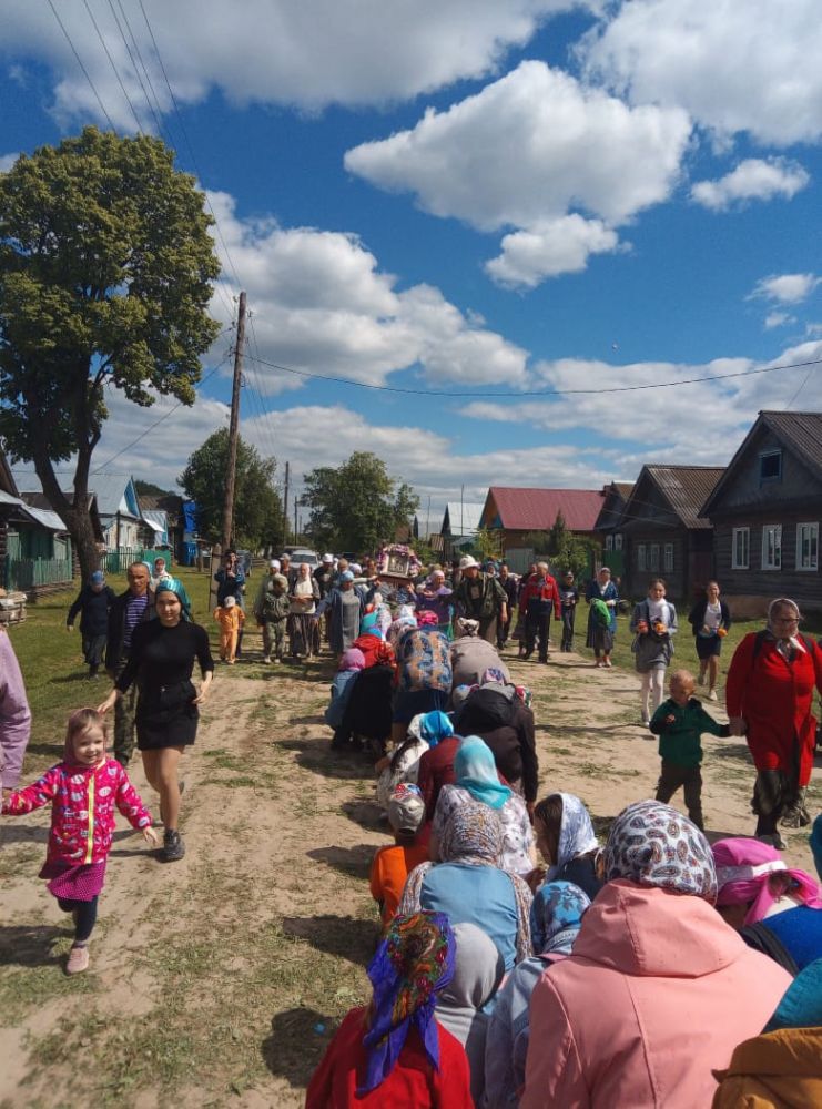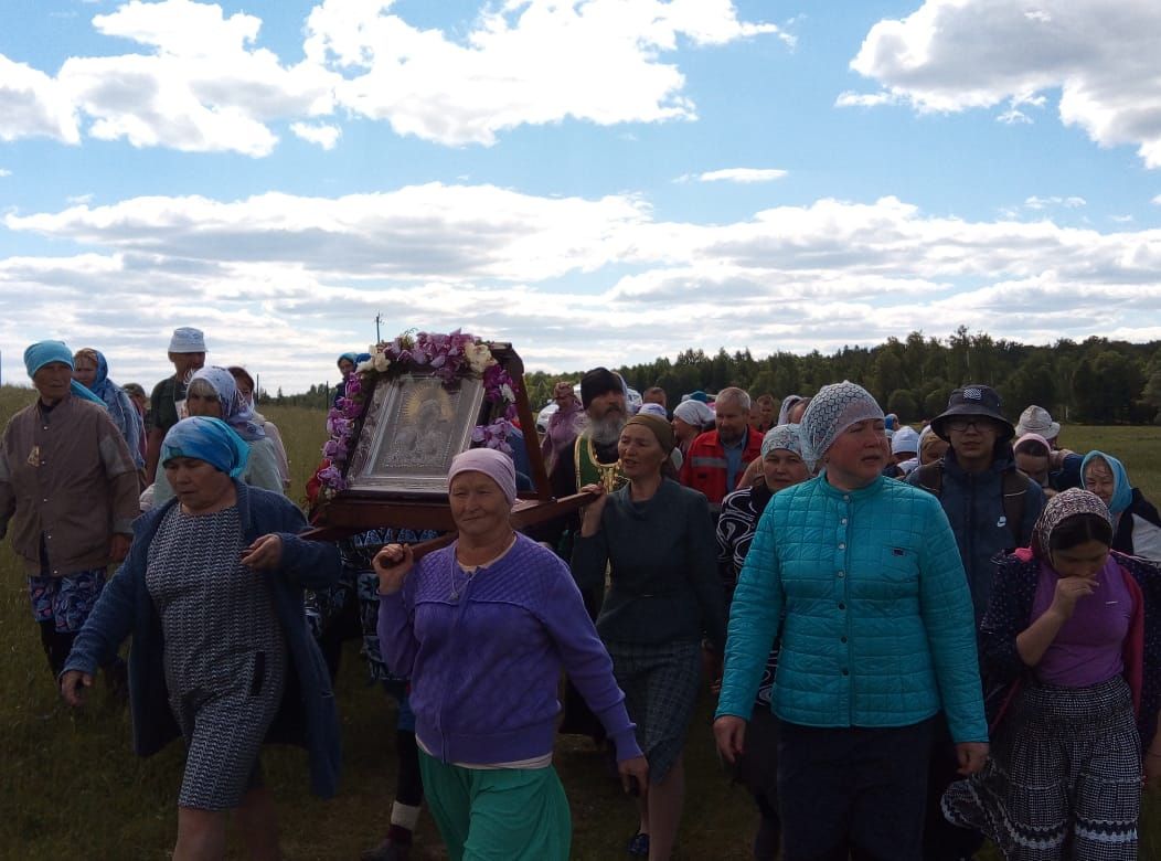 Затем крестный ход во главе с духовными окормителями – протоиереем Николаем Чузаевым, иереем Евгением Шамаевым и иереем Игорем Сапаевым – двинулся дальше, преодолев за день путь до с. Кӱчык-Эҥер. Утром следующего дня после молебна Пресвятой Богородице крестоходцы направились по маршруту в п. Ильинский.