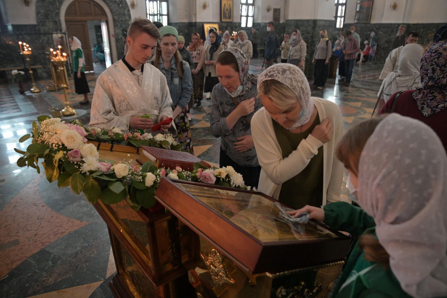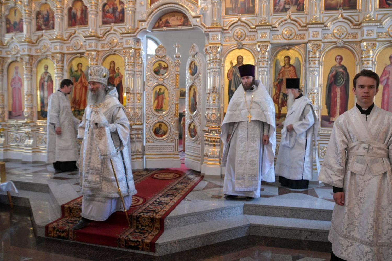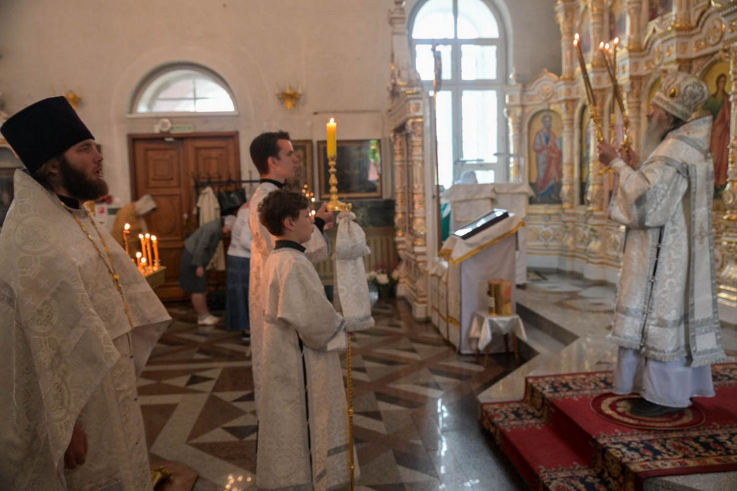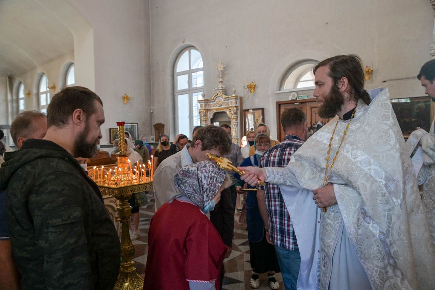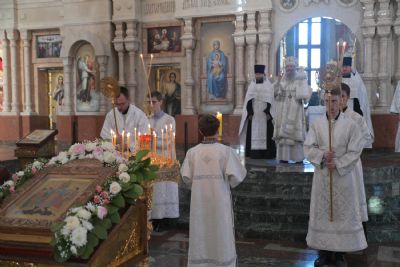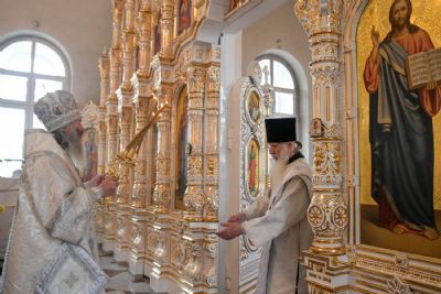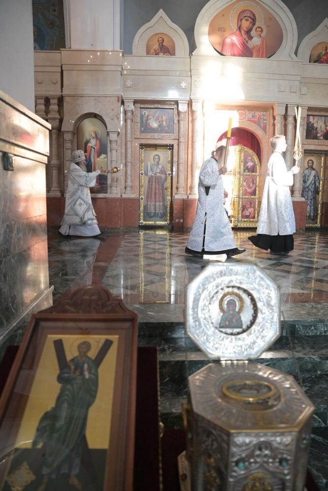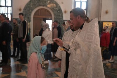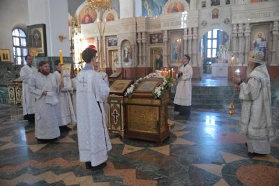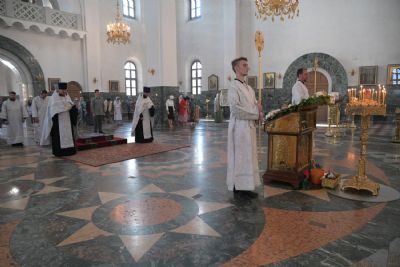За Литургией Его Высокопреосвященству сослужили настоятель Воскресенского собора иерей Алексий Кирюшкин, клирики собора и протодиакон Михаил Козловский. Песнопения исполнял хор собора под руководством регента Алисы Вылегжаниной.