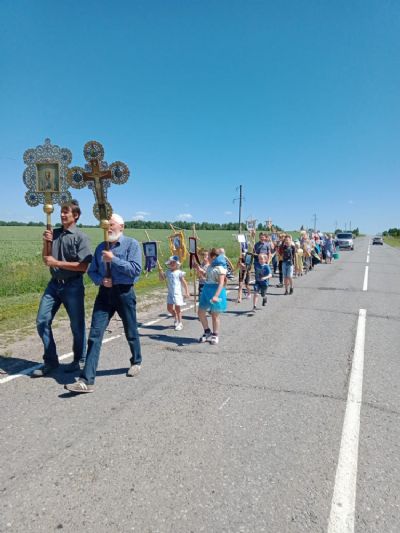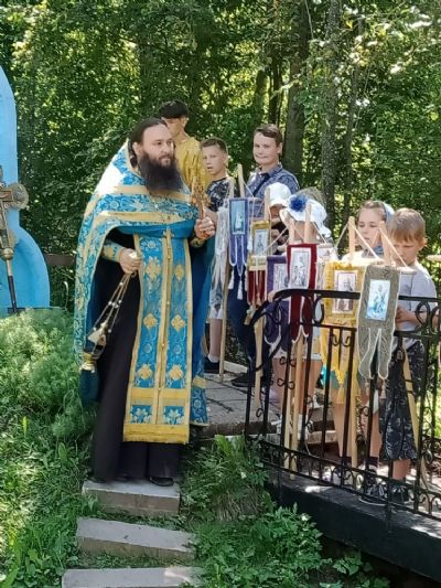 После совместной трапезы от Сретенского храма прошел крестный ход до источника Владимирской иконы Пресвятой Богородицы. Крестным ходом шли дети и их родители. Все ребята несли хоругви, которые изготовили специально к этому крестному ходу.