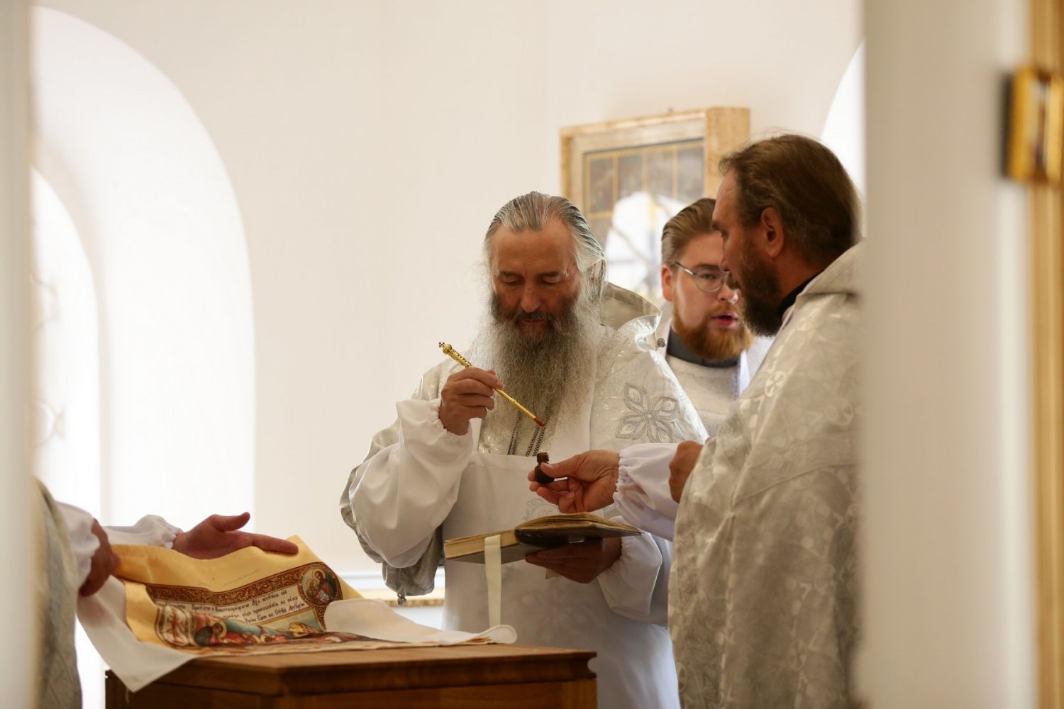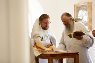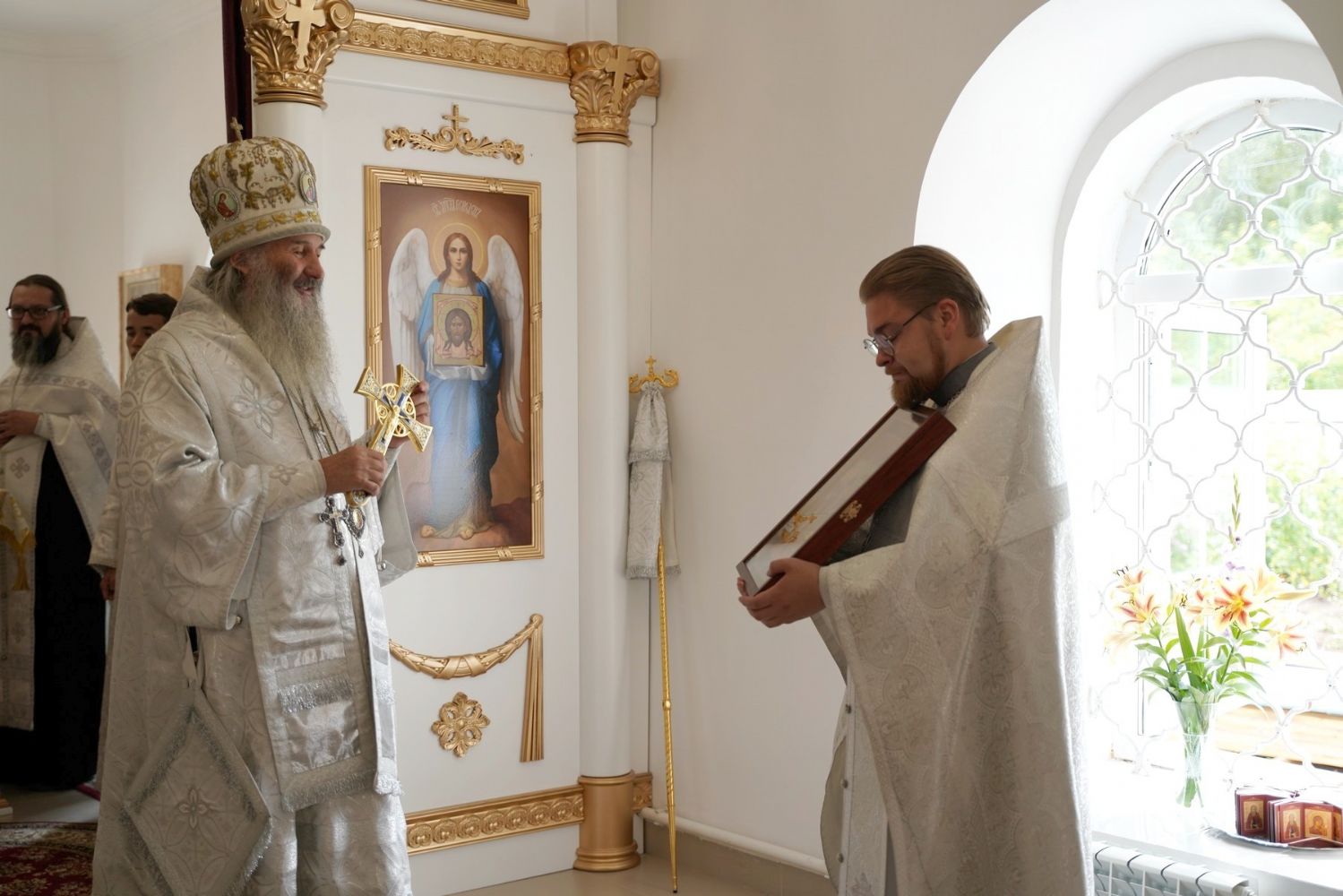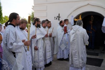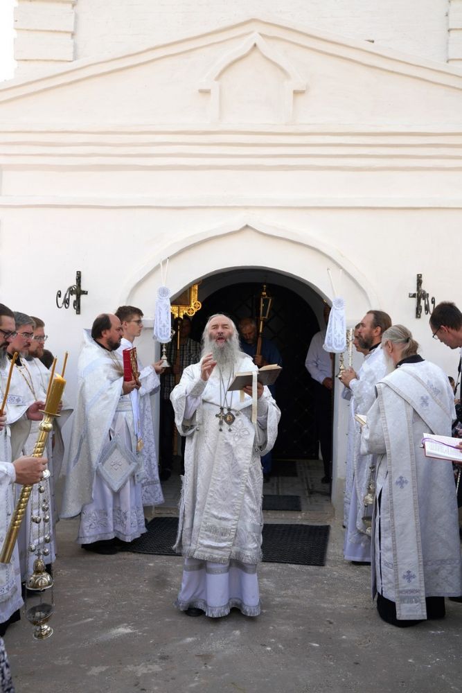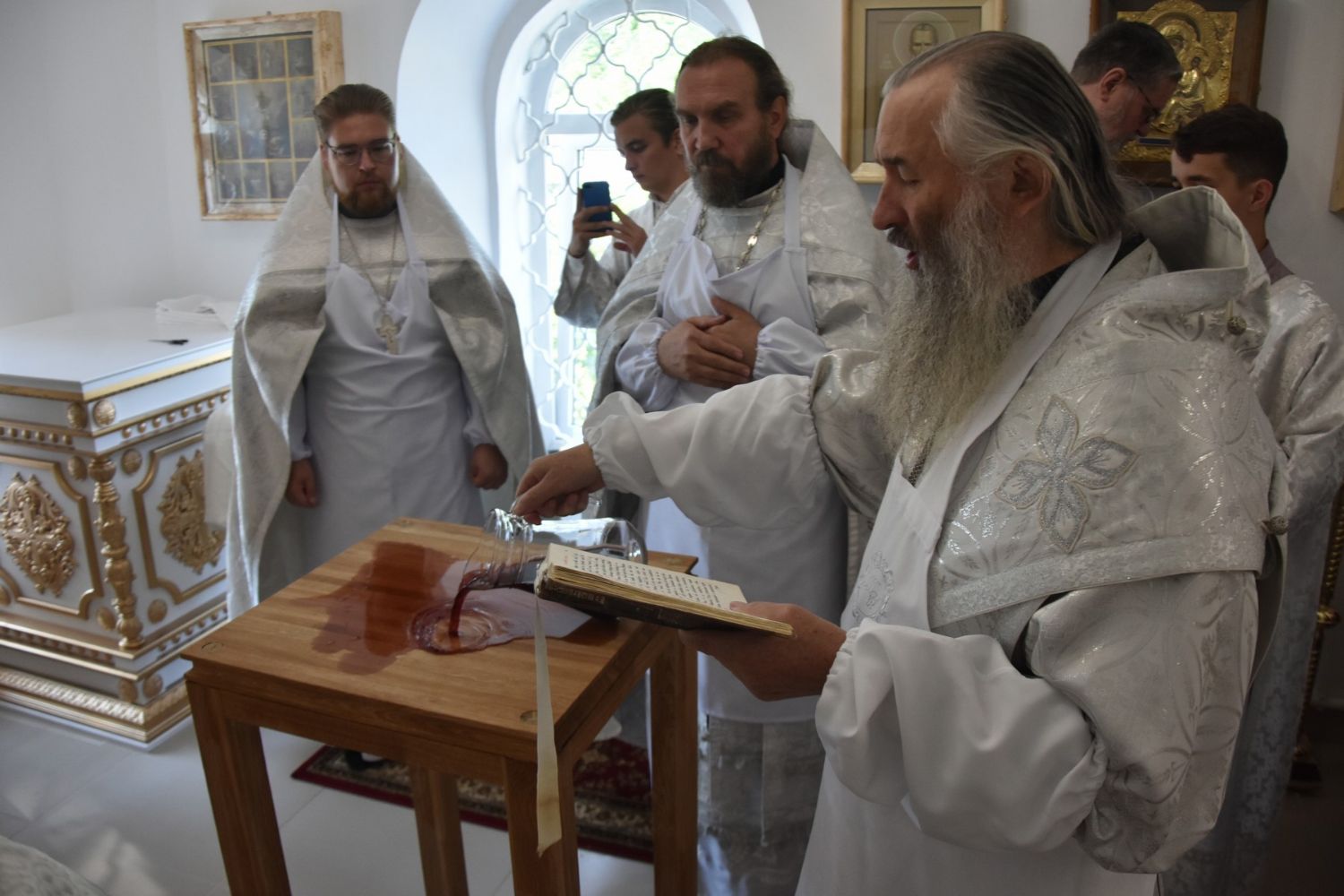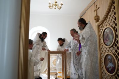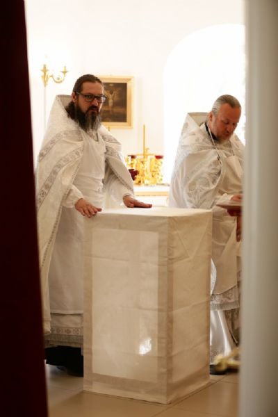 Освящение храма началось с торжественной встречи митрополита Иоанна, который под пение тропарей внес в храм частицы мощей святых Вифлеемских мучеников-младенцев и священномученика Владимира Четверина (память 2 сентября), которые были вложены в два престола и в антиминсы.