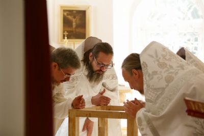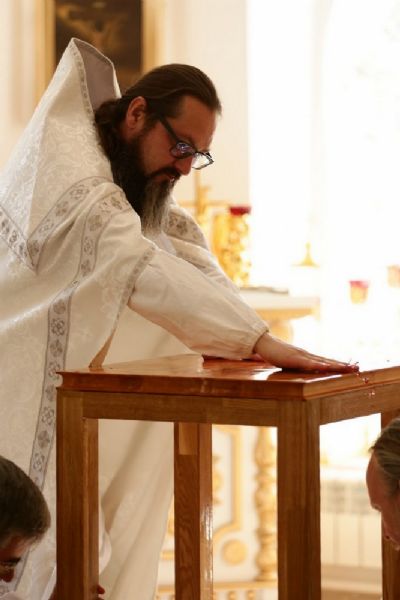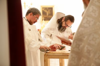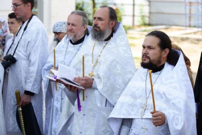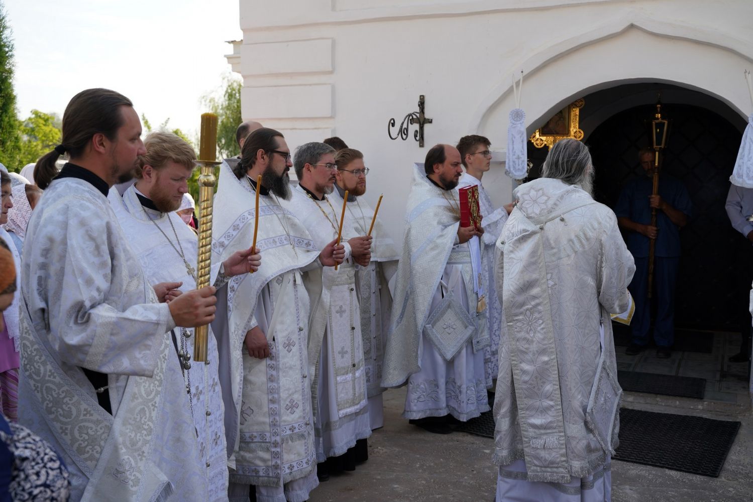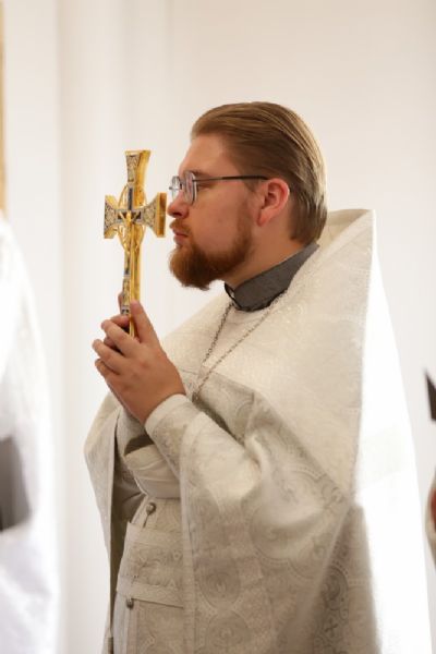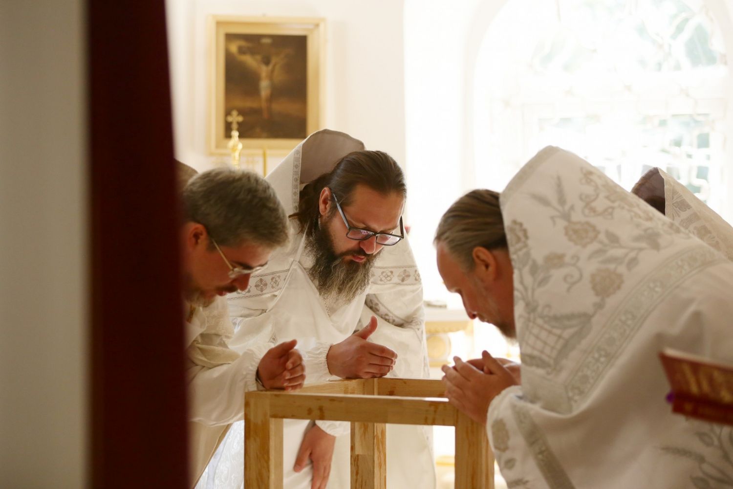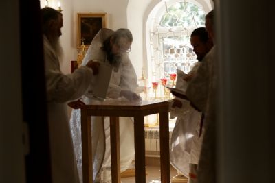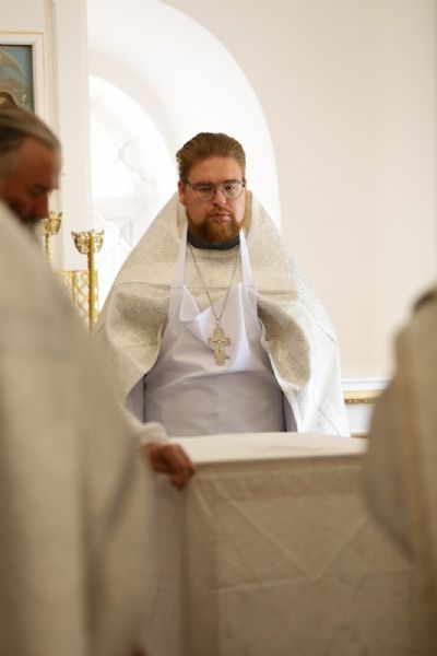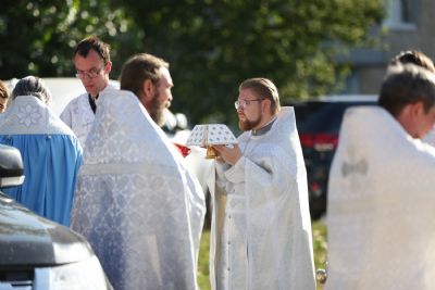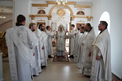 Освящение храма началось с торжественной встречи митрополита Иоанна, который под пение тропарей внес в храм частицы мощей святых Вифлеемских мучеников-младенцев и священномученика Владимира Четверина (память 2 сентября), которые были вложены в два престола и в антиминсы.