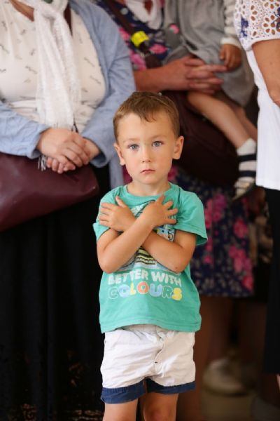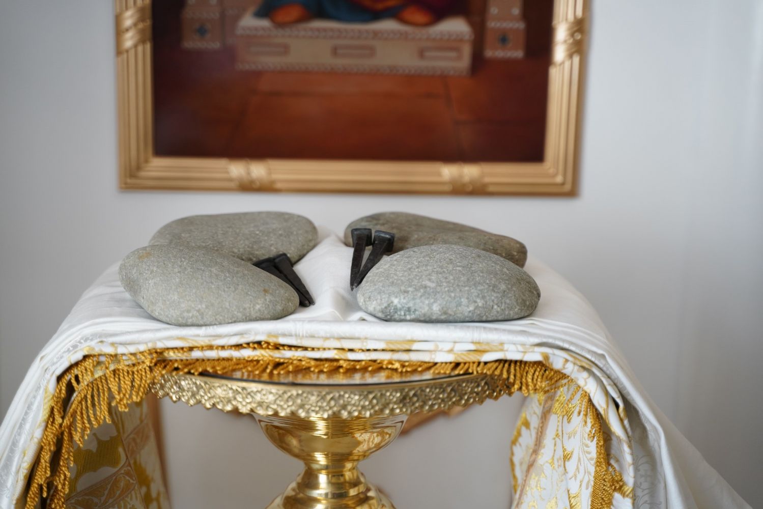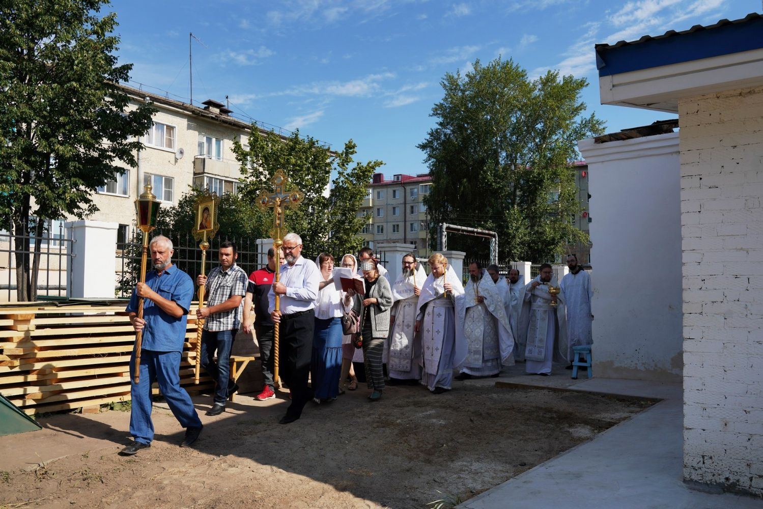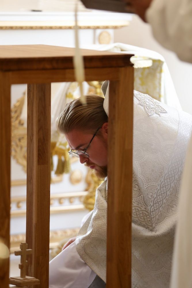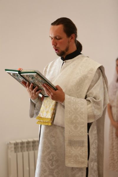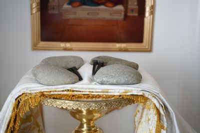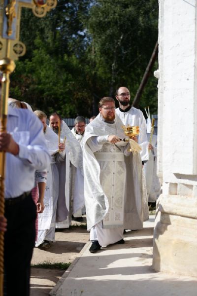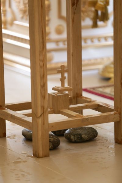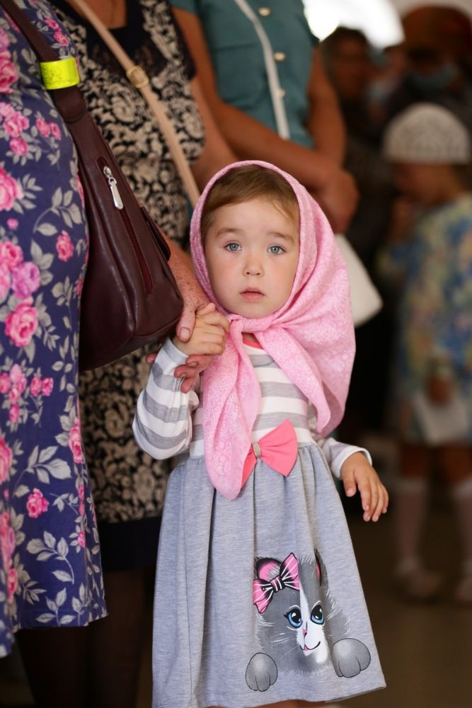 Освящение храма началось с торжественной встречи митрополита Иоанна, который под пение тропарей внес в храм частицы мощей святых Вифлеемских мучеников-младенцев и священномученика Владимира Четверина (память 2 сентября), которые были вложены в два престола и в антиминсы.