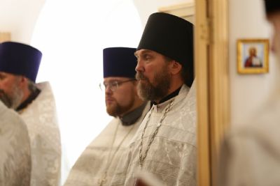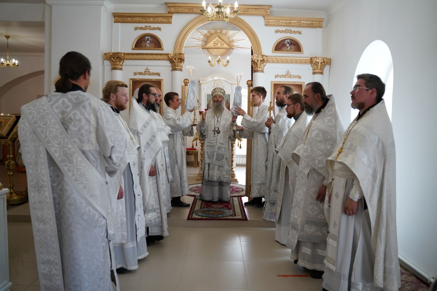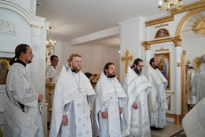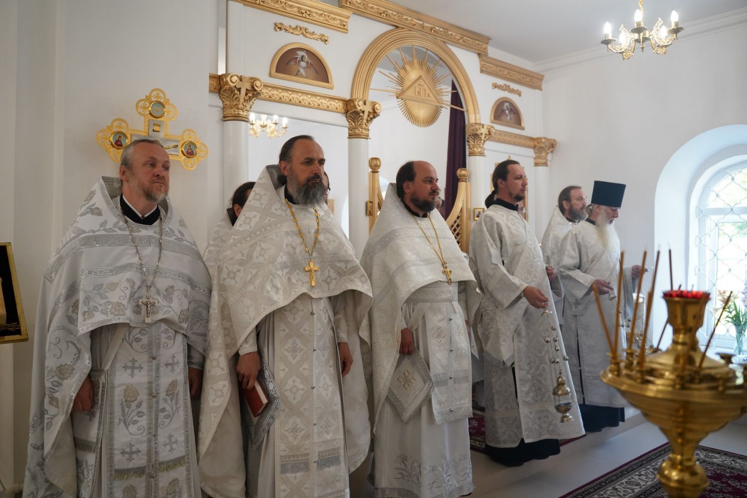 Архипастырю сослужили: секретарь Йошкар-Олинского епархиального управления иеромонах Серафим (Пасанаев), благочинный Пригородного церковного округа протоиерей Николай Ярошевич, настоятель Сретенского храма иерей Артемий Промович, настоятель храма Рождества Иоанна Предтечи с. Оршанка протоиерей Димитрий Вылекжанин, настоятель храма Казанской иконы Божией Матери с. Нурма иерей Александр Коваль, клирик Вознесенского собора г. Йошкар-Олы иерей Александр Козлов, клирики Благовещенского кафедрального собора иерей Никифор Захаров и диакон Игорь Коваль, клирик храма Рождества Христова г. Йошкар-Олы иерей Димитрий Дьяков, клирик Успенского храма г. Йошкар-Олы иерей Вячеслав Булычев, протодиакон Михаил Козловский. Богослужебные песнопения исполнял хор Троицкого храма г. Йошкар-Олы под управлением регента Анны Ярошевич.