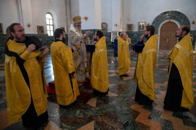 Его Высокопреосвященству сослужили секретарь Йошкар-Олинского епархиального управления иеромонах Серафим (Пасанаев), клирики Благовещенского собора иерей Александр Староверов, диакон Игорь Коваль, клирик Серафимовского храма диакон Иоанн Милютин и протодиакон Михаил Козловский.