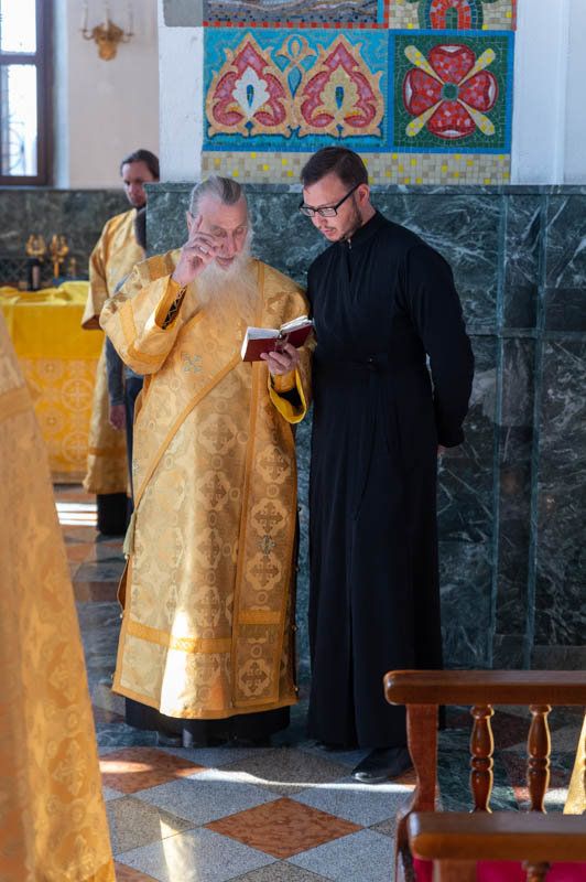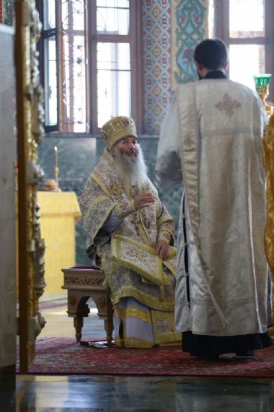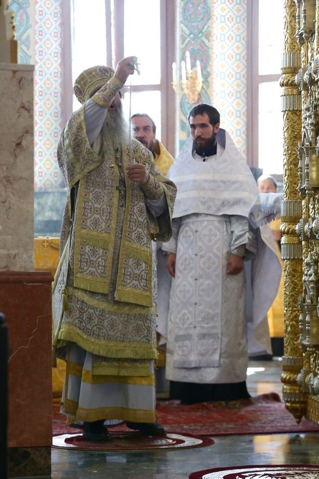 Архипастырю сослужили: секретарь Йошкар-Олинского епархиального управления иеромонах Серафим (Пасанаев), клирик Вятской митрополии настоятель храма вмц. Екатерины с. Кичмы архимандрит Тихон (Меркушев), клирики Благовещенского собора иерей Никифор Захаров, иерей Евгений Самойлов, иерей Александр Староверов, диакон Игорь Коваль, клирик Серафимовского храма диакон Иоанн Милютин и протодиакон Михаил Козловский.