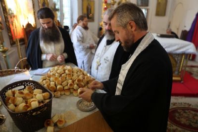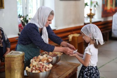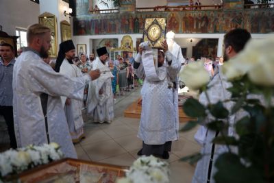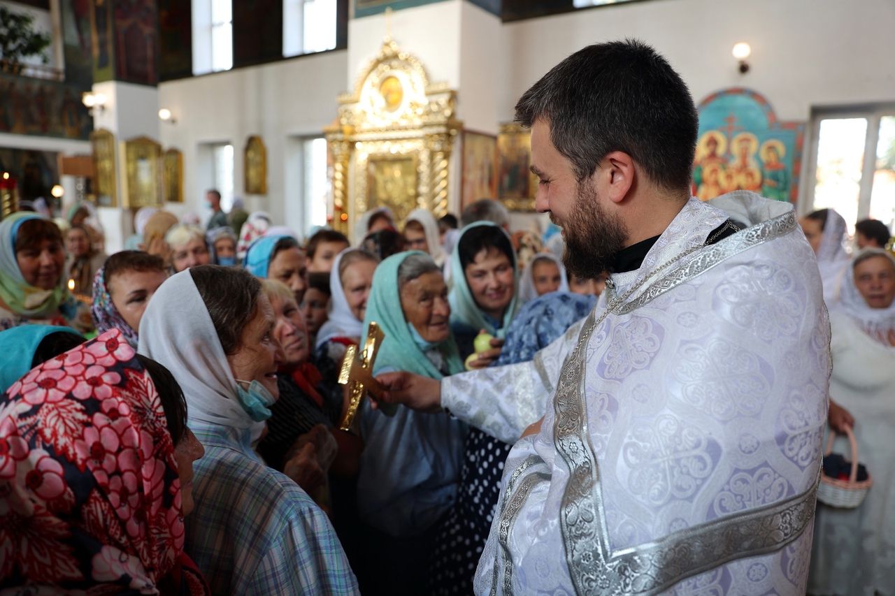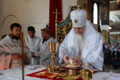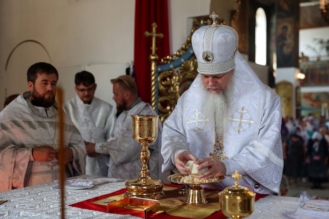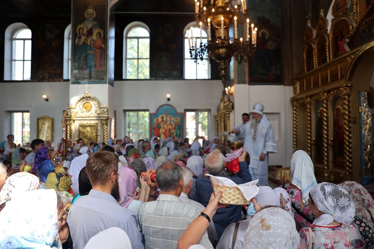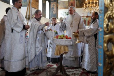 После Литургии владыка освятил плоды нового урожая и обратился к верующим с архипастырским словом, раскрыв духовный смысл праздника Преображения Господня.