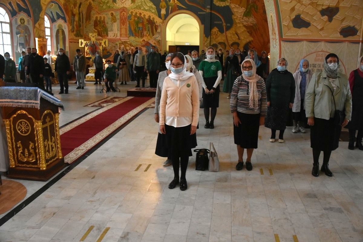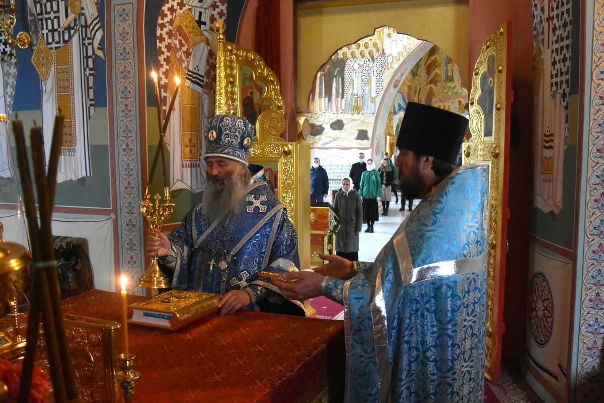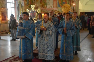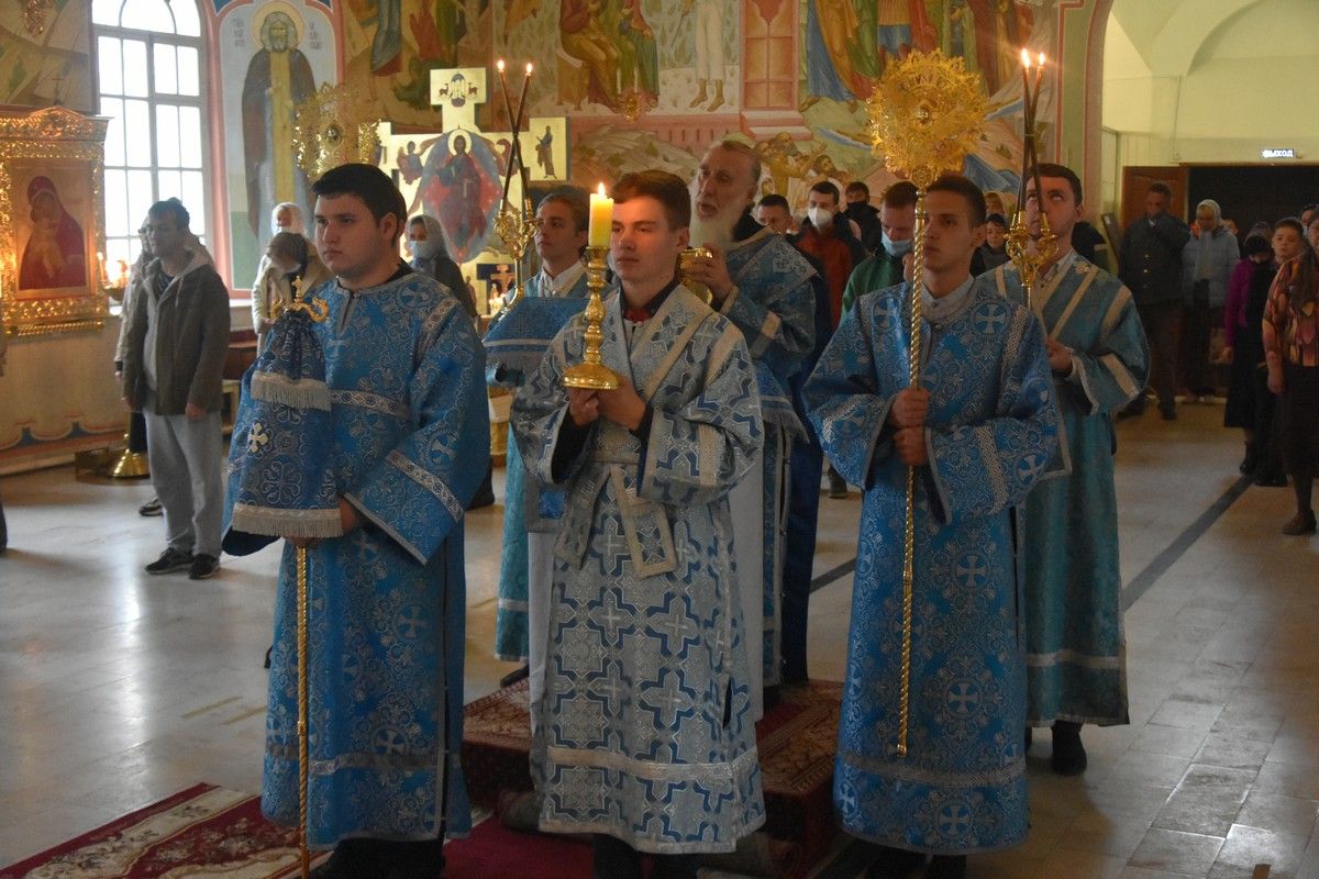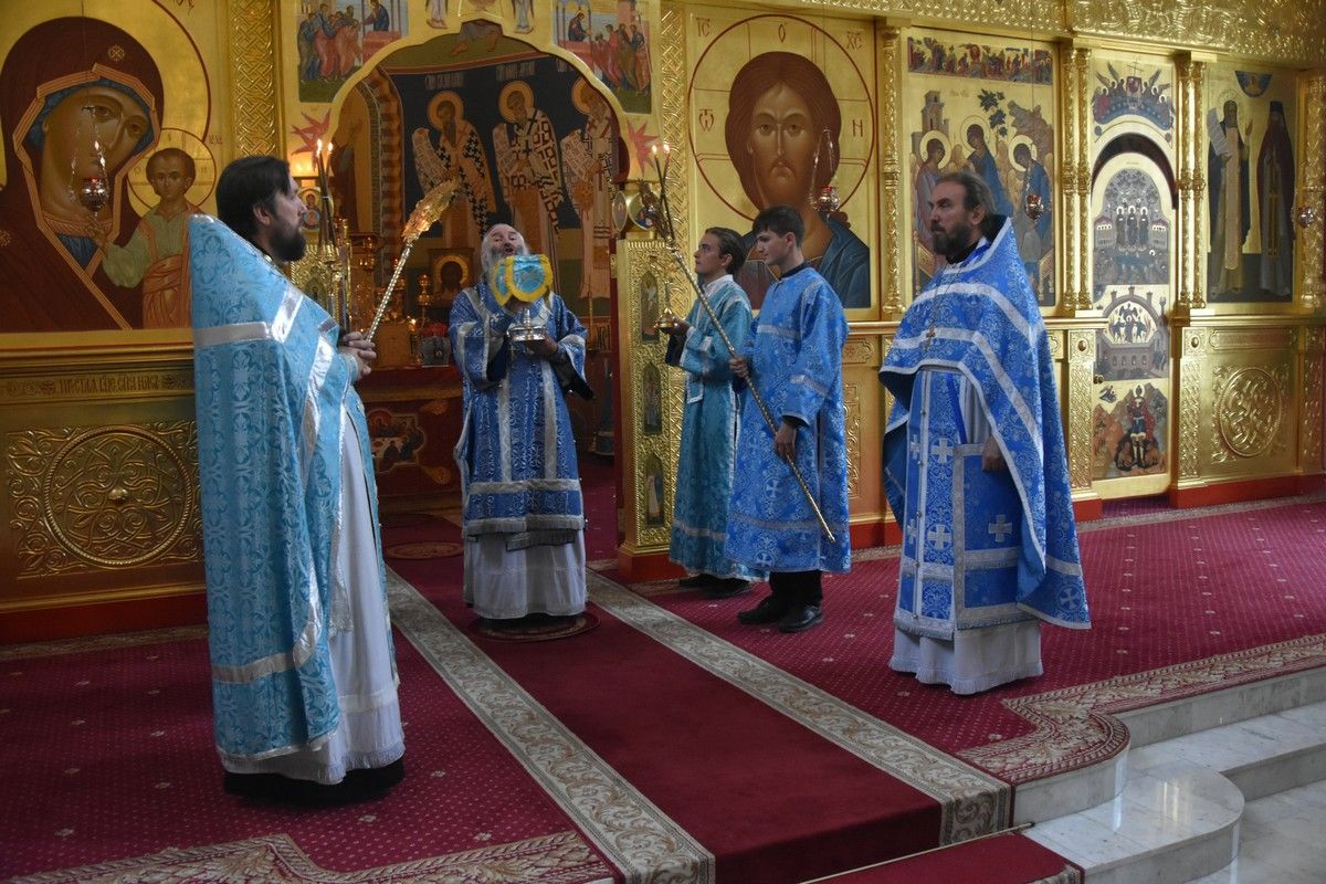 Архипастырям сослужили клирик Успенского храма иерей Алексий Михеев и протодиакон Михаил Козловский. Песнопения исполнял детско-юношеский хор «Благовест» под управлением Надежды Поздеевой. Традиционно, акафист со священством и хором пели все прихожане.
