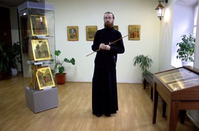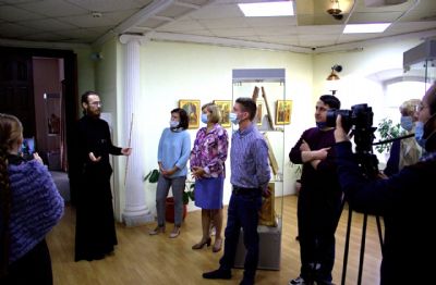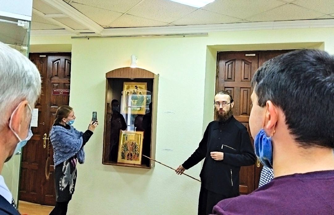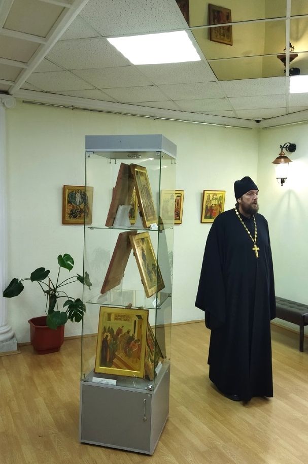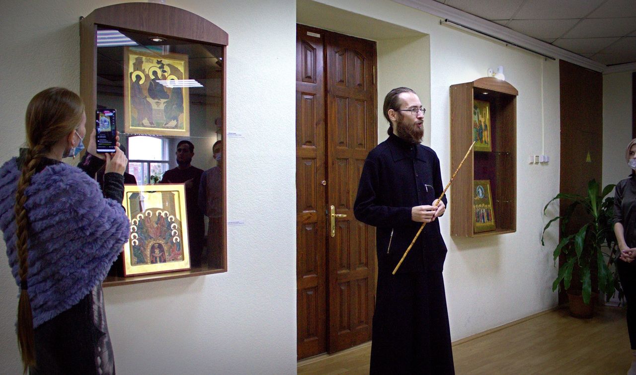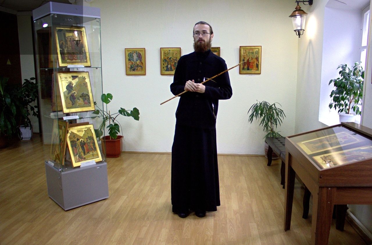 Далее чтец Вознесенского собора Григорий Михеев провел для гостей экскурсию по выставке, раскрыв на примерах экспозиции основные сюжеты евангельской истории, связанные с земной жизнью, Крестной смертью и Воскресением Господа нашего Иисуса Христа.