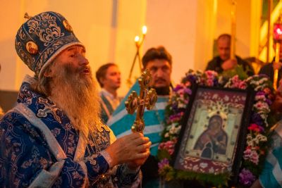По окончании всенощного бдения крестный ход с Мироносицкой иконой Богородицы продолжился и, обойдя вокруг домового храма, отправился к Вознесенскому собору, где святыню встретили духовенство и прихожане собора.