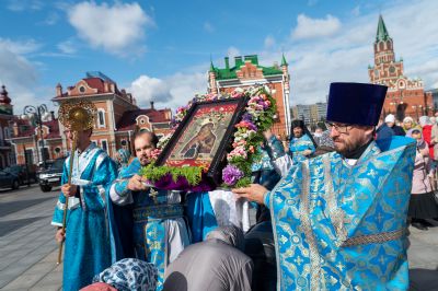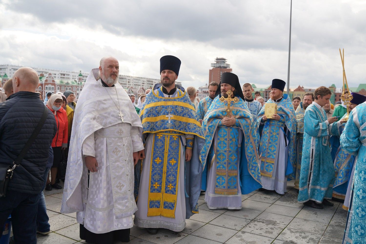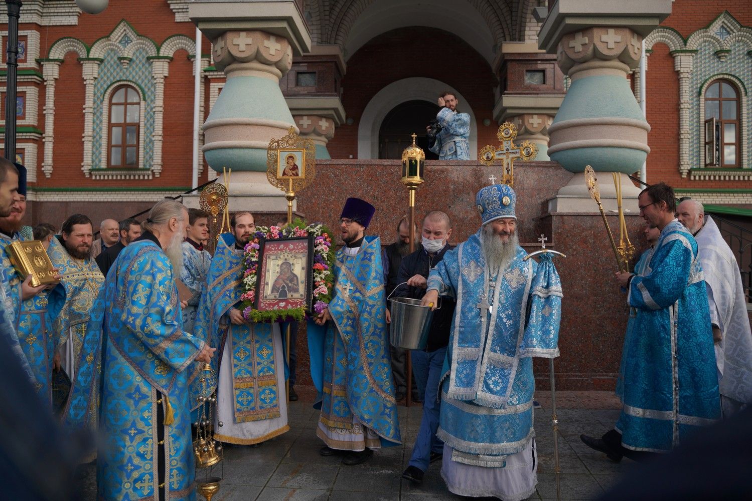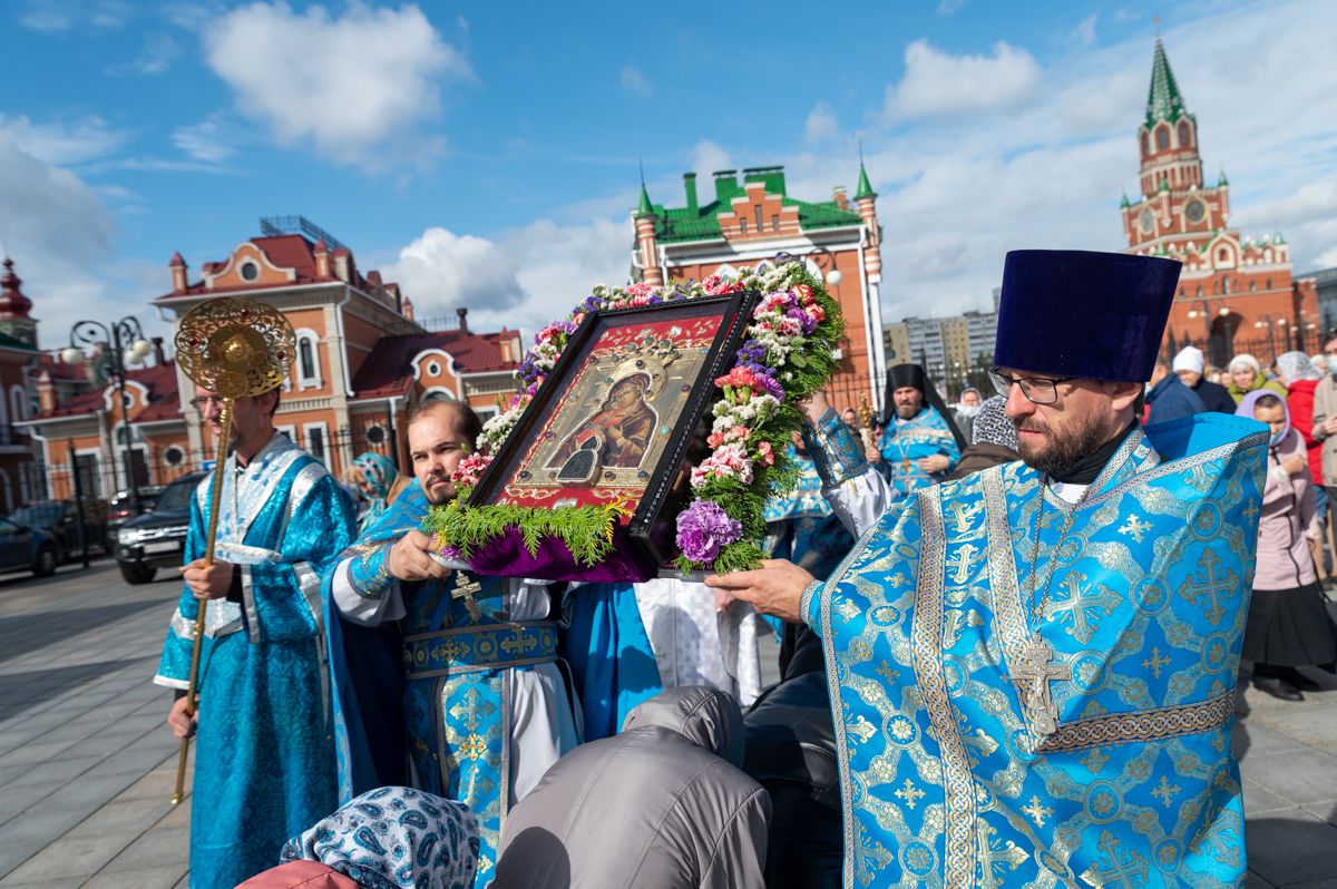 После Литургии был совершен молебен на новолетие и крестный ход вокруг кафедрального собора со чтением Евангелия и кроплением святой водой. Затем Мироносицкая икона Божией Матери была отправлена в Успенский храм г. Йошкар-Олы.