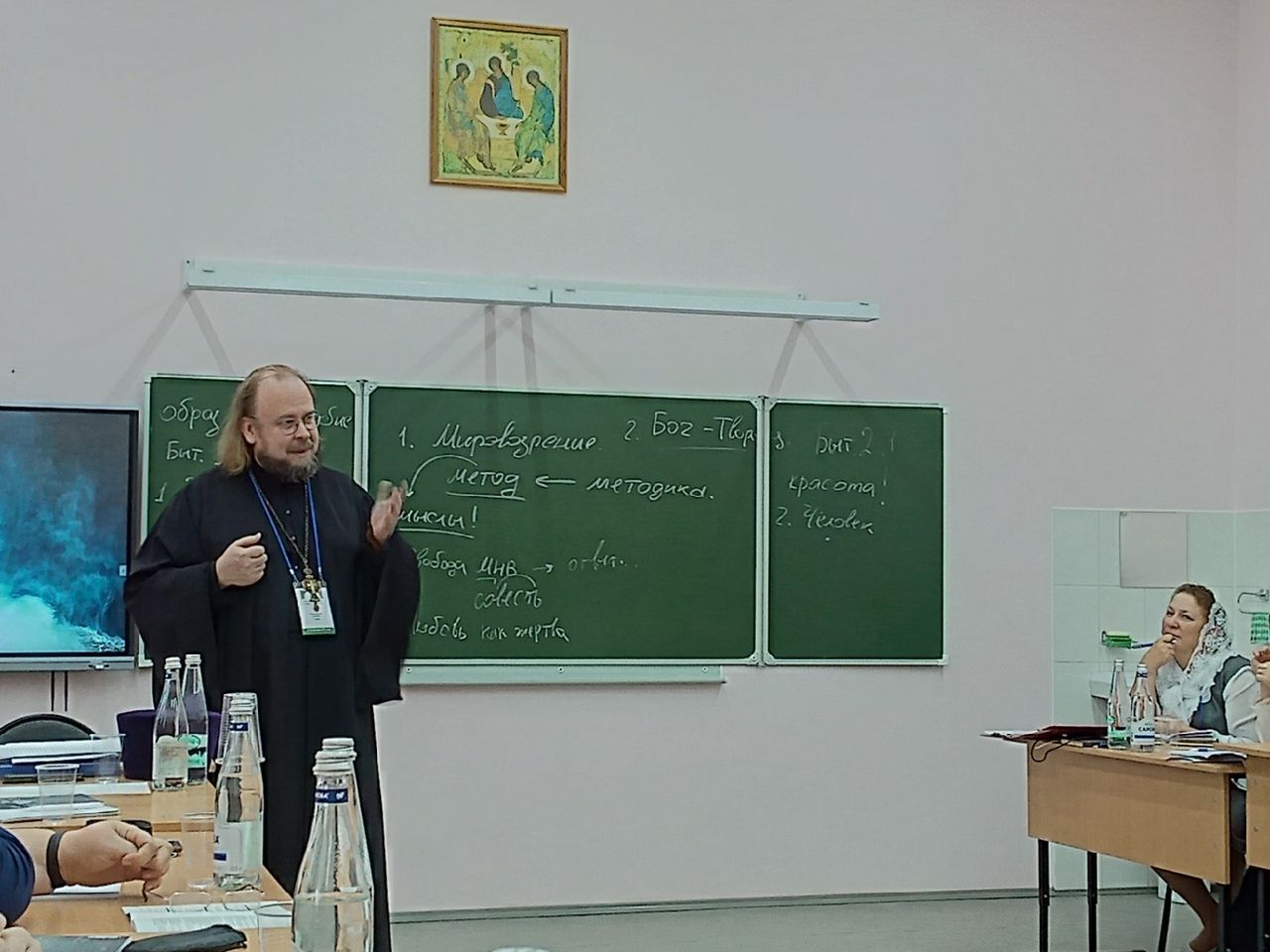От имени председателя Синодального отдела религиозного образования и катехизации РПЦ митрополита Екатеринбургского и Верхотурского Евгения собравшихся приветствовал руководитель аппарата этого отдела Вячеслав Серегин. Он зачитал приветственное письмо от председателя Синодального отдела.