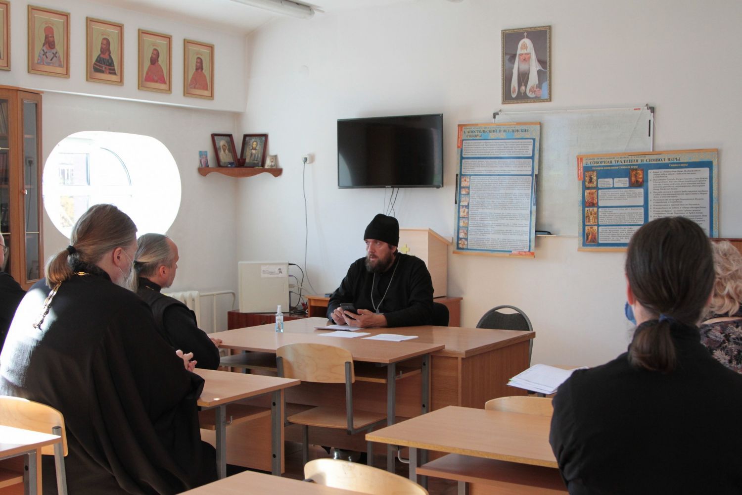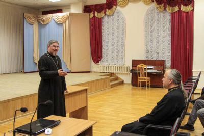После молебна курсанты поднялись в актовый зал, где для них было проведено организационное собрание. Иерей Александр Козлов, многие годы возглавлявший курсы и преподававший на них катехизис, представил нового руководителя – отца Леонида Вылекжанина и нового преподавателя катехизиса диакона Владимира Лихачева. Сам отец Александр сложил с себя эти полномочия в связи с назначением его благочинным Медведевского церковного округа и, следовательно, большой служебной загрузкой.