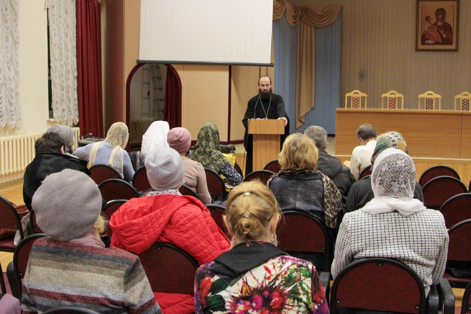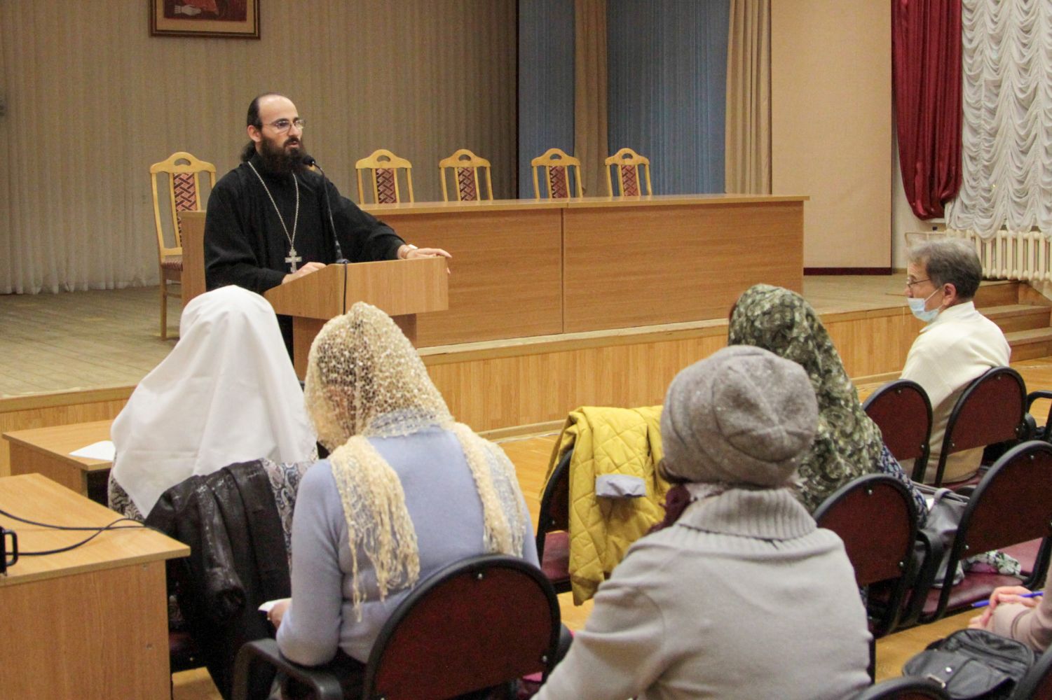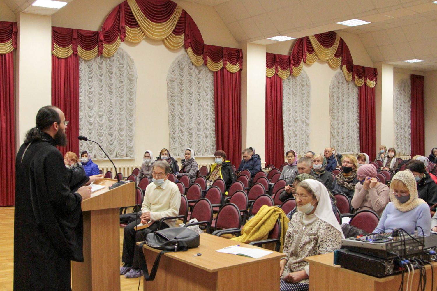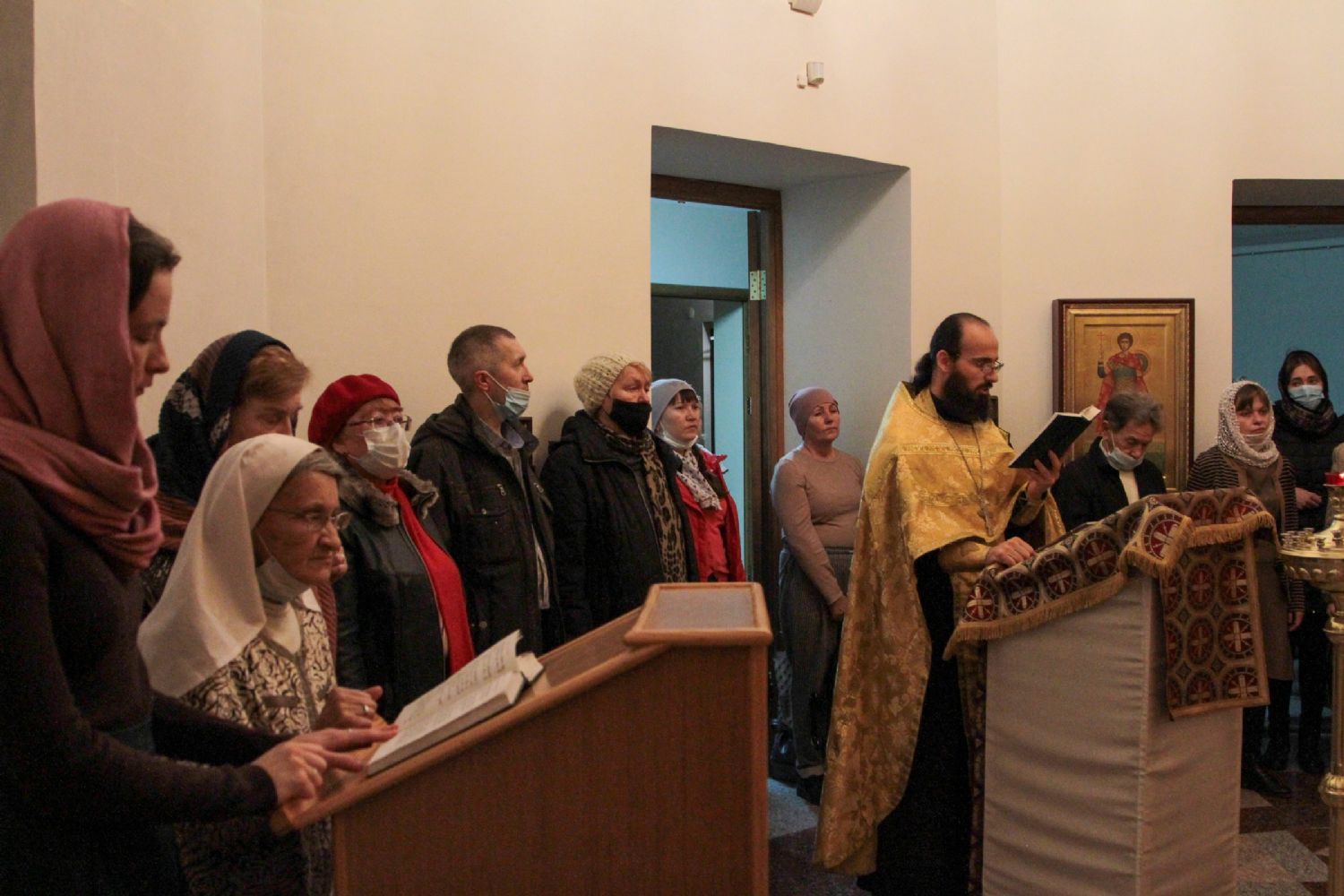 Руководитель кружка иерей Иоанн Кристев отслужил молебен на начало учебного года в домовом храме в честь преподобномученицы великой княгини Елисаветы. После этого все поднялись в актовый зал и продолжили разбор духовного смысла Евангелия от Марка.