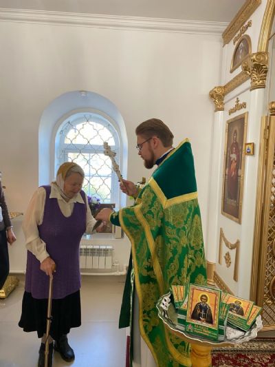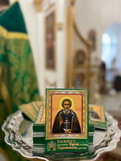 Поздравив собравшихся с престольным праздником, отец Артемий рассказал им о житии и подвигах преподобного Сергия, его роли в истории России, и вручил всем на память книжечки с акафистом преподобному.