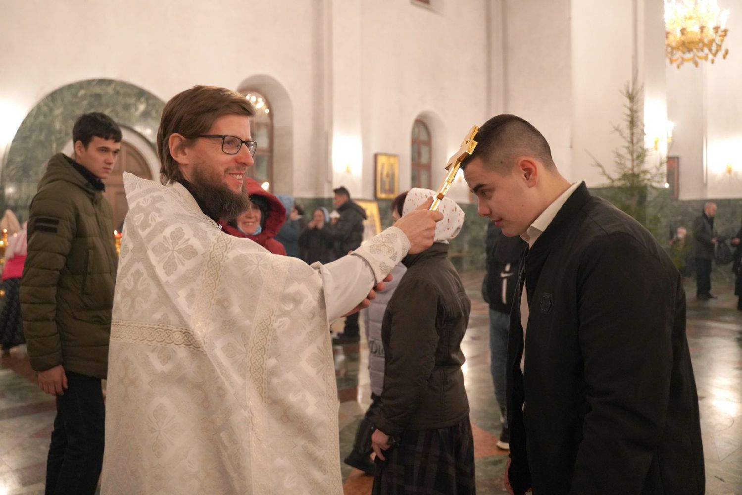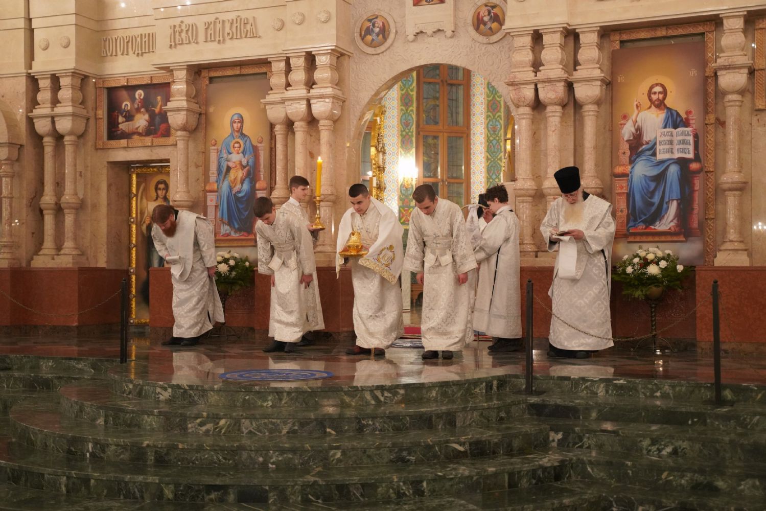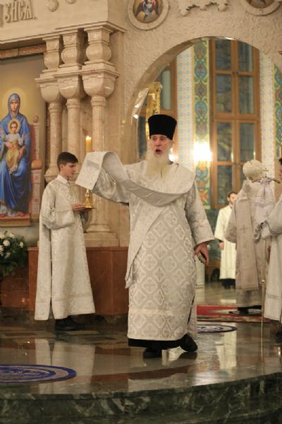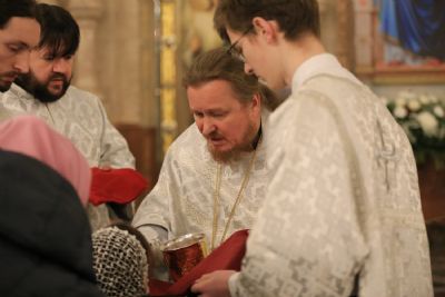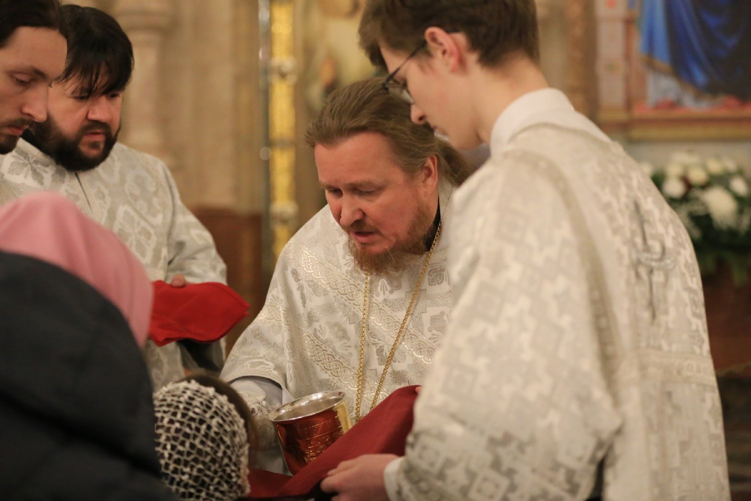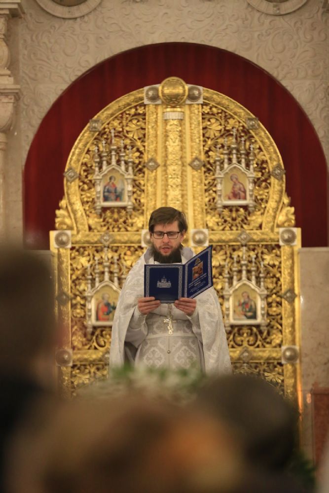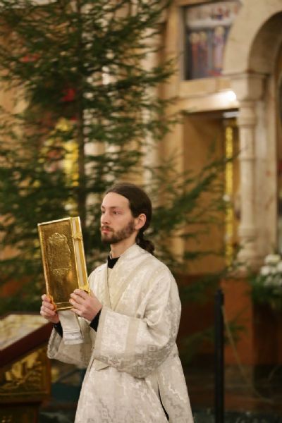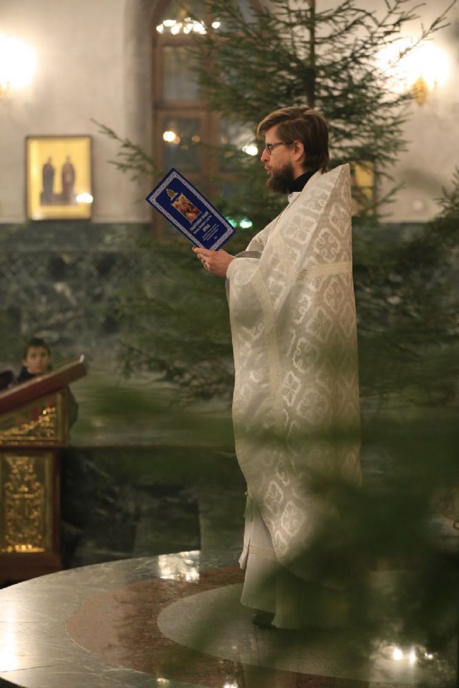 По запричастном стихе клирик кафедрального собора иерей Евгений Самойлов зачитал Рождественское послание Патриарха Московского и всея Руси Кирилла верным чадам Русской Православной Церкви.
