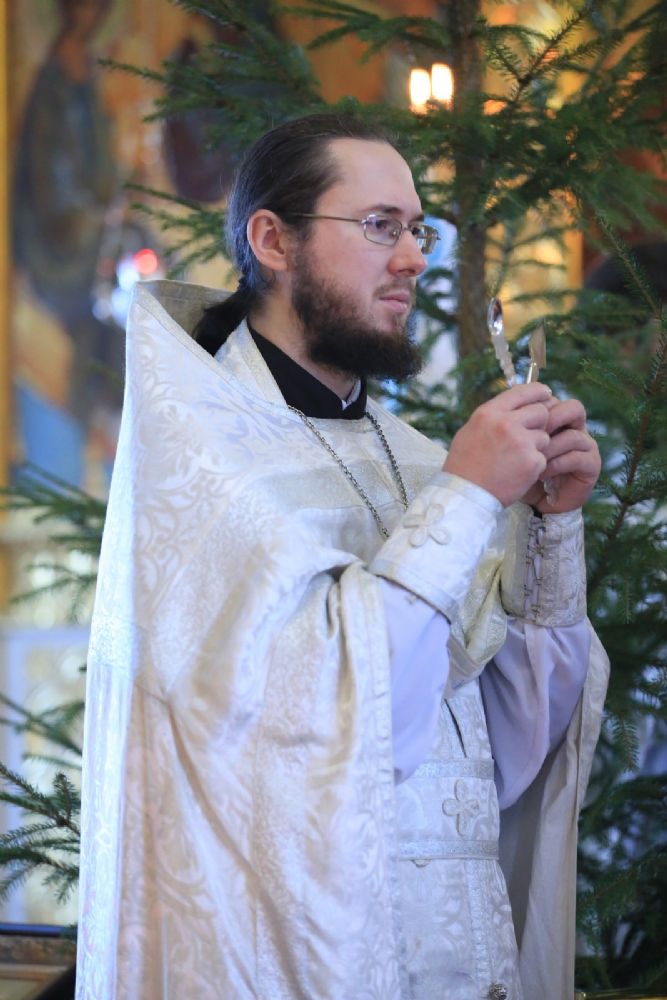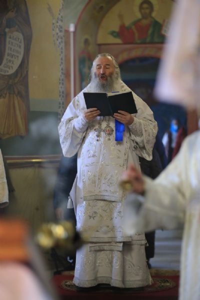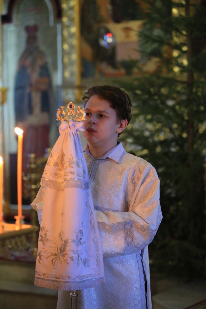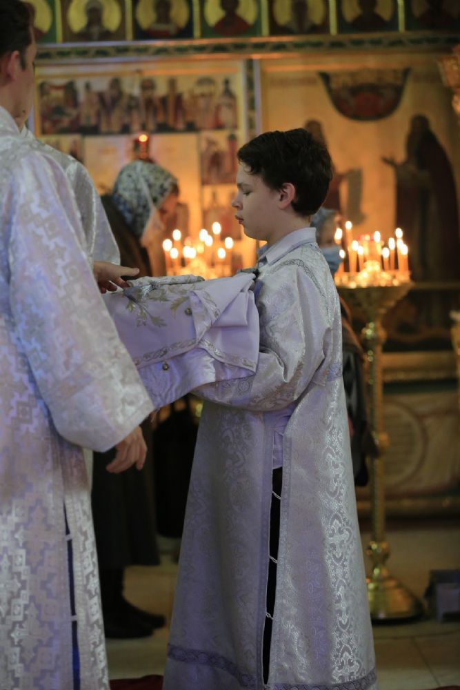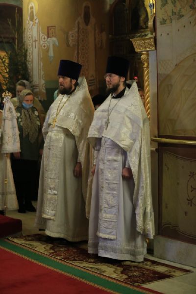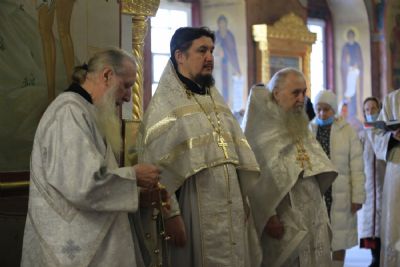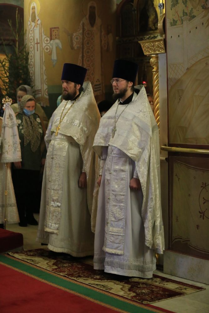 Архипастырю сослужили секретарь Йошкар-Олинского епархиального управления иеромонах Серафим (Пасанаев), настоятель собора протоиерей Евгений Кутырев, благочинный Йошкар-Олинского церковного округа протоиерей Андрей Норкин, клирики собора и протодиакон Михаил Козловский. Песнопения исполнял хор собора под управлением Ангелины Бабиной.