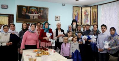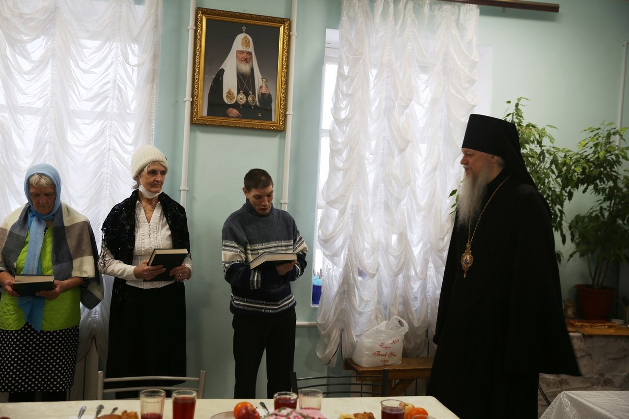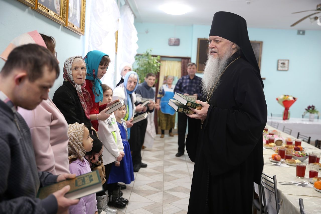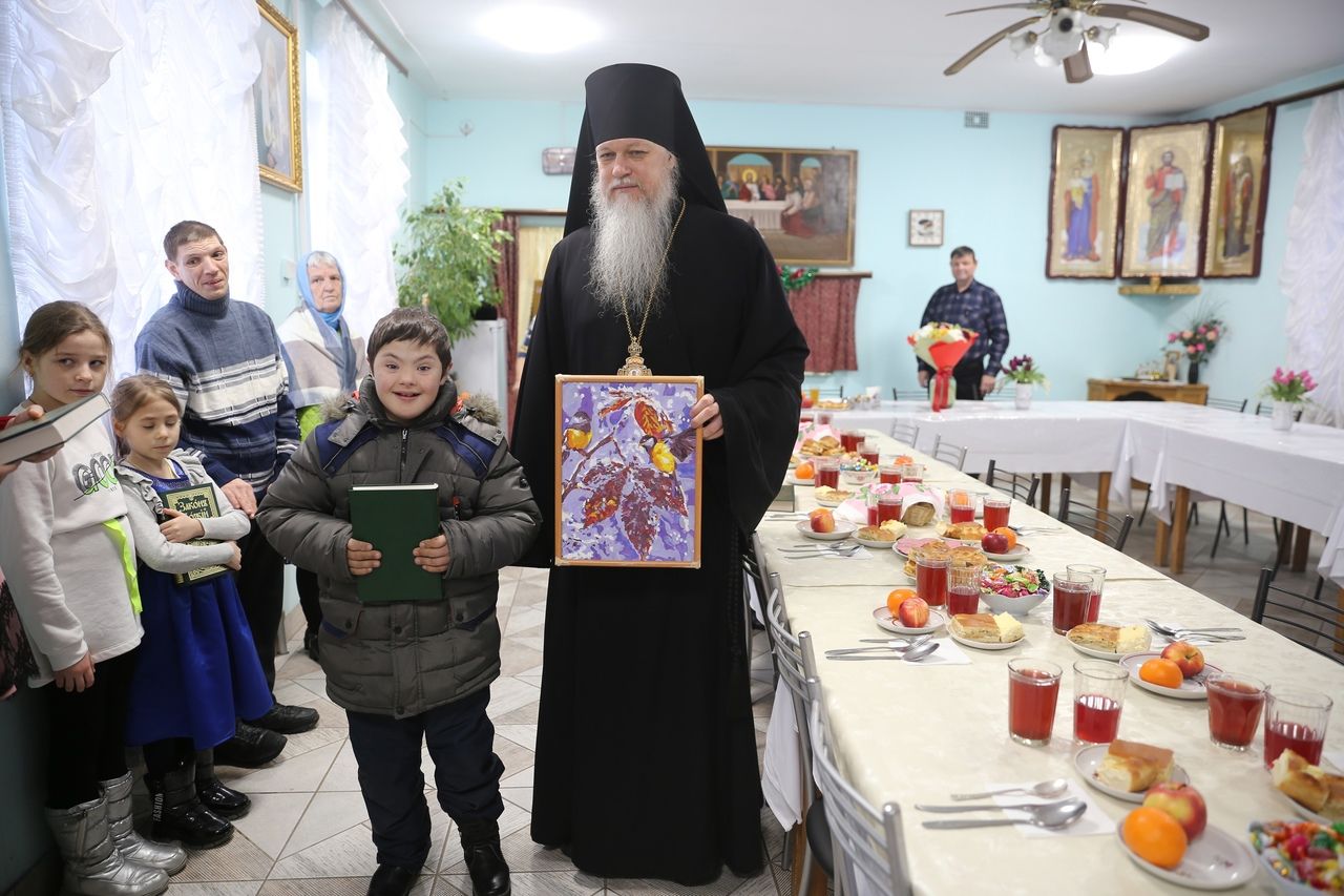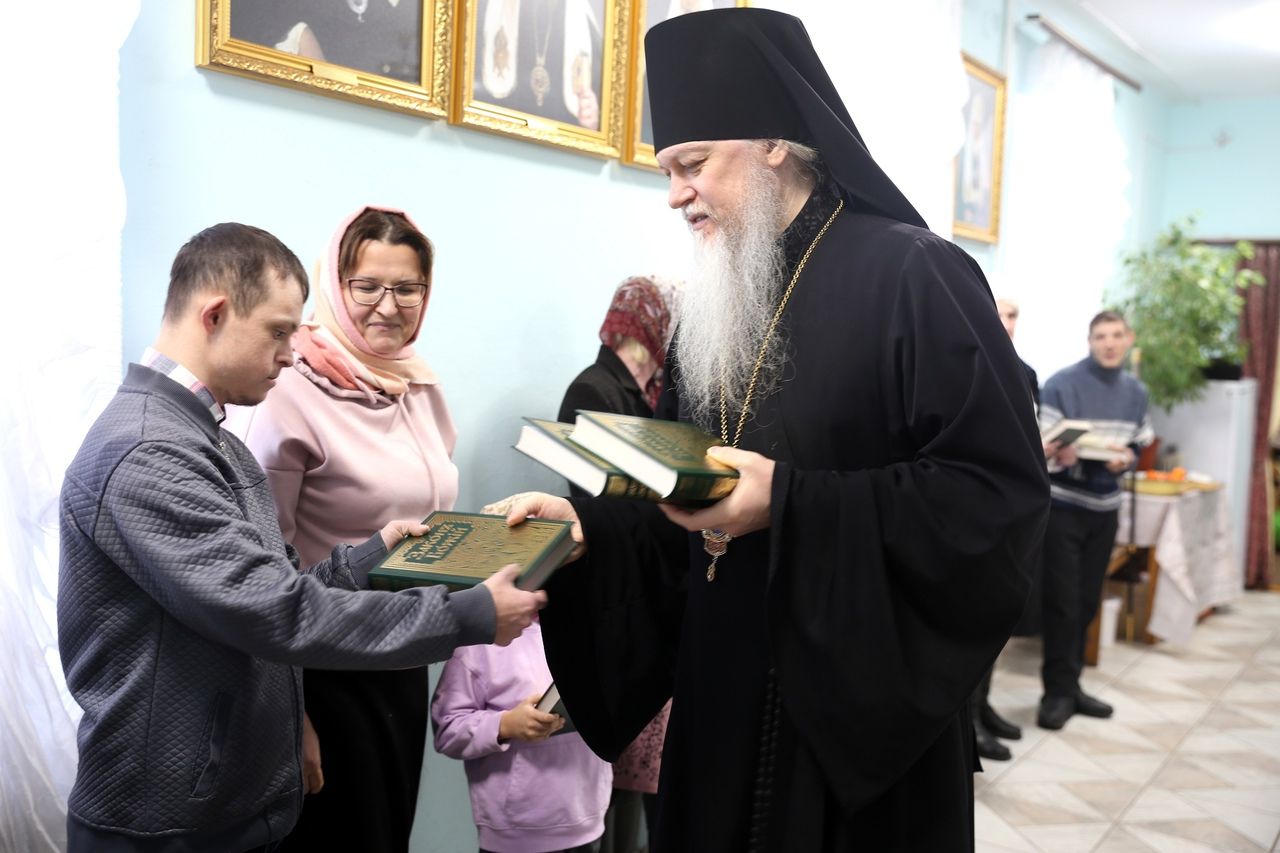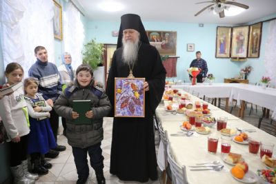 Общение прошло в теплой обстановке за чаепитием. Владыка поздравил присутствующих с праздником Рождества Христова и подарил на молитвенную память книги «Закон Божий», а также сладкие подарки.