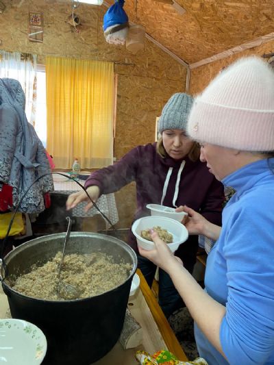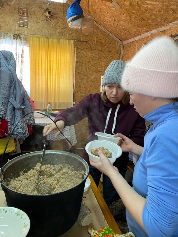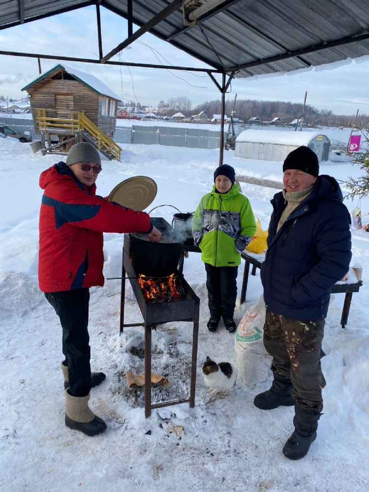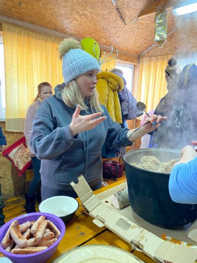 И вот, дети (и не только из воскресной школы) их родители и учителя организованно прибыли на место. Сразу образовалось два потока: детский – на высокую горку, родительский – в арендованный домик, чтобы накрыть праздничный стол. Пожарили на мангале сосиски, сварили кашу в котле – она получилась очень вкусной, с дымком.