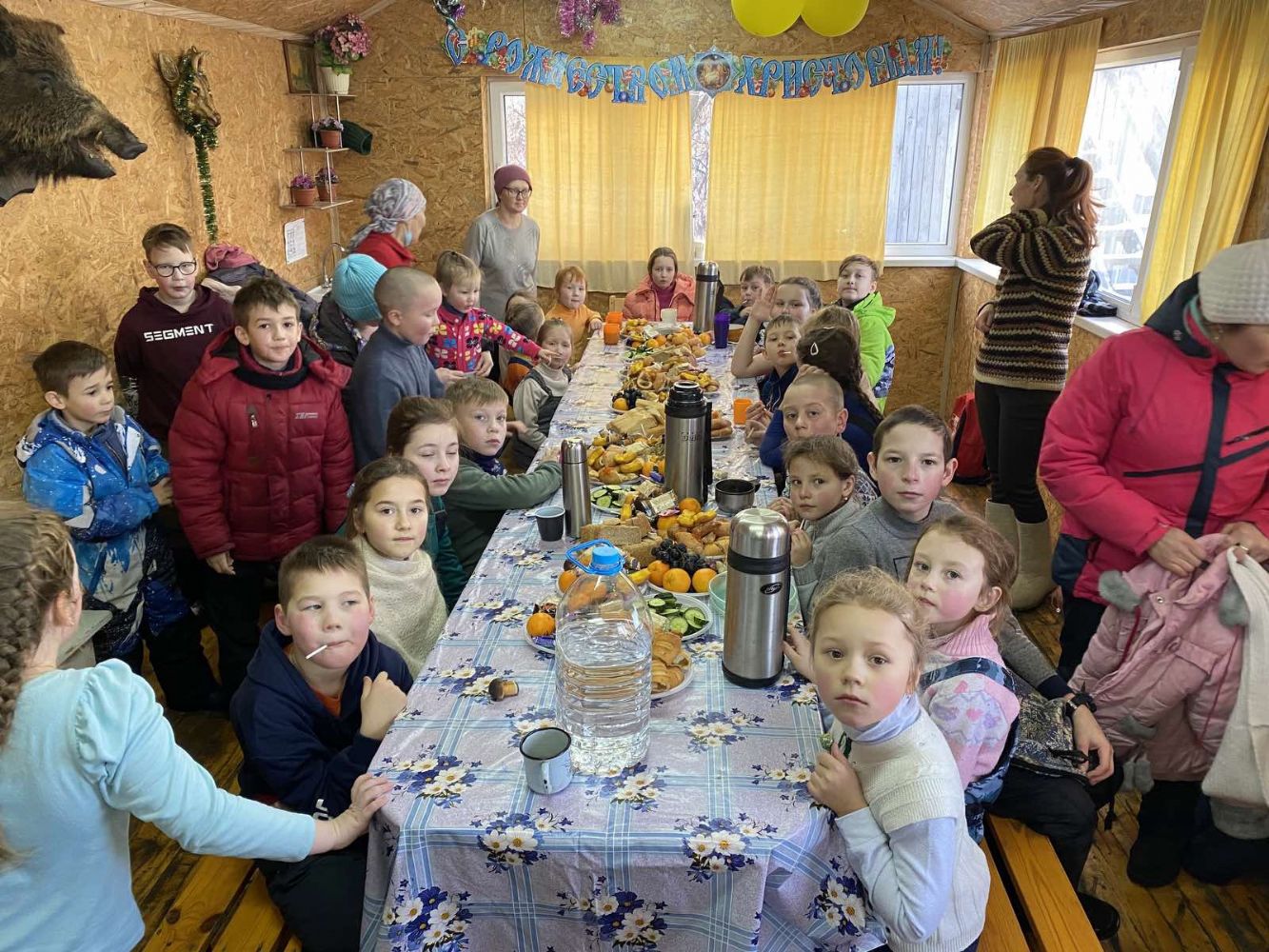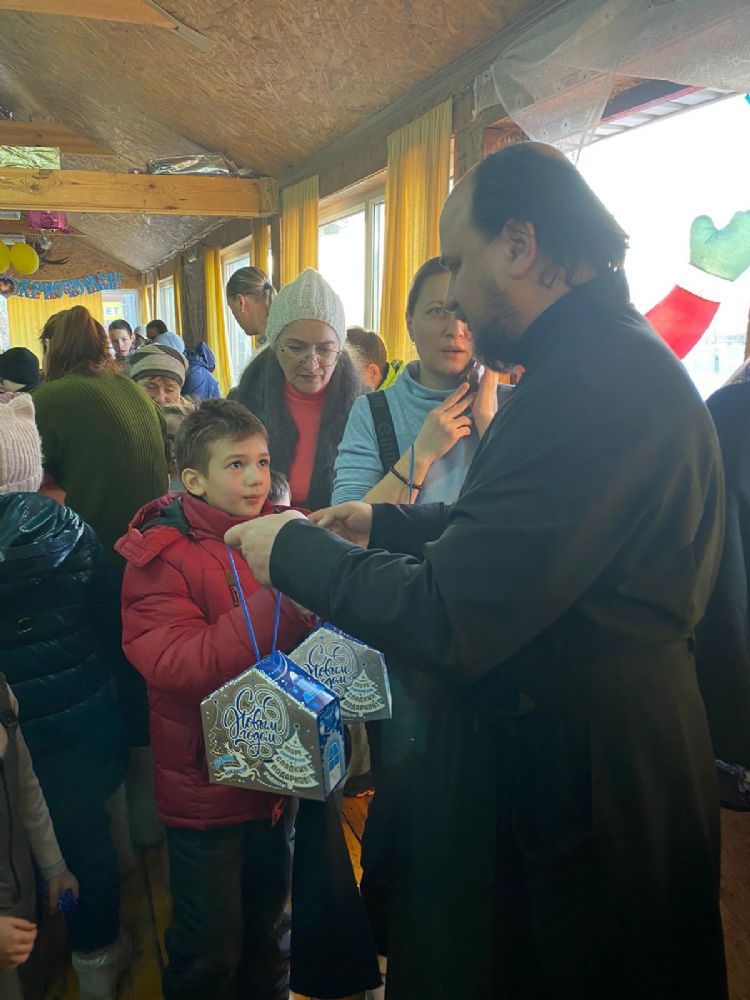 Ближе к 14 часам на праздник прибыл настоятель храма Всех святых в земле Российской просиявших протоиерей Николай Ярошевич, а вместе с батюшкой приехала наш учитель музыки, миссионер прихода Ирина Остапенко. Отец Николай поздравил присутствующих с праздником Рождества Христова. Ирина Леонидовна привезла гитару – и все, сидя уже за столом, пели рождественские и другие любимые песни, что создало теплую праздничную атмосферу.