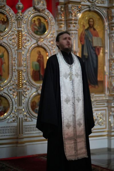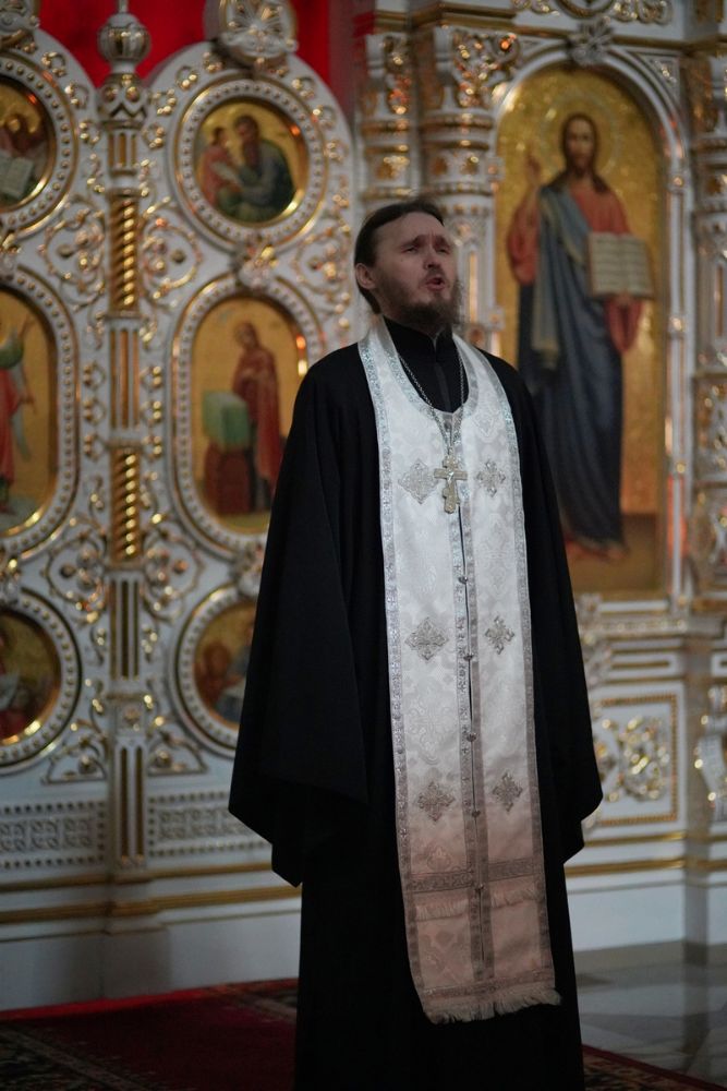 Владыке сослужили секретарь Йошкар-Олинского епархиального управления иеромонах Серафим (Пасанаев), настоятель собора иерей Алексий Кирюшкин, клирики собора и протодиакон Михаил Козловский. Песнопения исполнял хор собора под управлением регента Елены Поглазовой.
