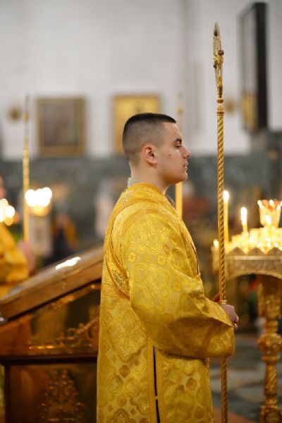 Владыке сослужили секретарь Йошкар-Олинского епархиального управления иеромонах Серафим (Пасанаев), ключарь кафедрального собора протоиерей Сергий Поглазов, клирики собора и протодиакон Михаил Козловский. Песнопения исполнял детско-юношеский хор «Благовест» под управлением регента Татьяны Черновой.