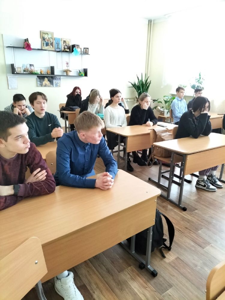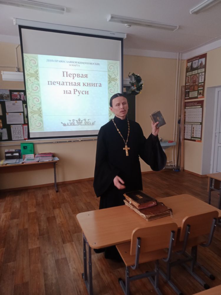Со старшеклассниками встретился настоятель храма Владимирской иконы Божией Матери с. Кузнецово иерей Василий Яшмолкин, окормляющий Свято-Илиинский приход д. Русский Кукмор. Была показана презентация по теме «Апостол» – первая печатная книга», рассказывающая об истории книгопечатания на Руси и о первопечатнике Иване Федорове, в 1564 году издавшего новозаветную книгу «Апостол» (это было 14 марта – отсюда и дата праздника).