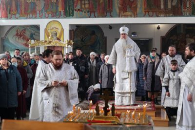 Владыке сослужили клирики собора, песнопения исполнял архиерейский хор.