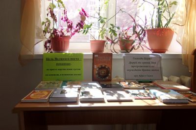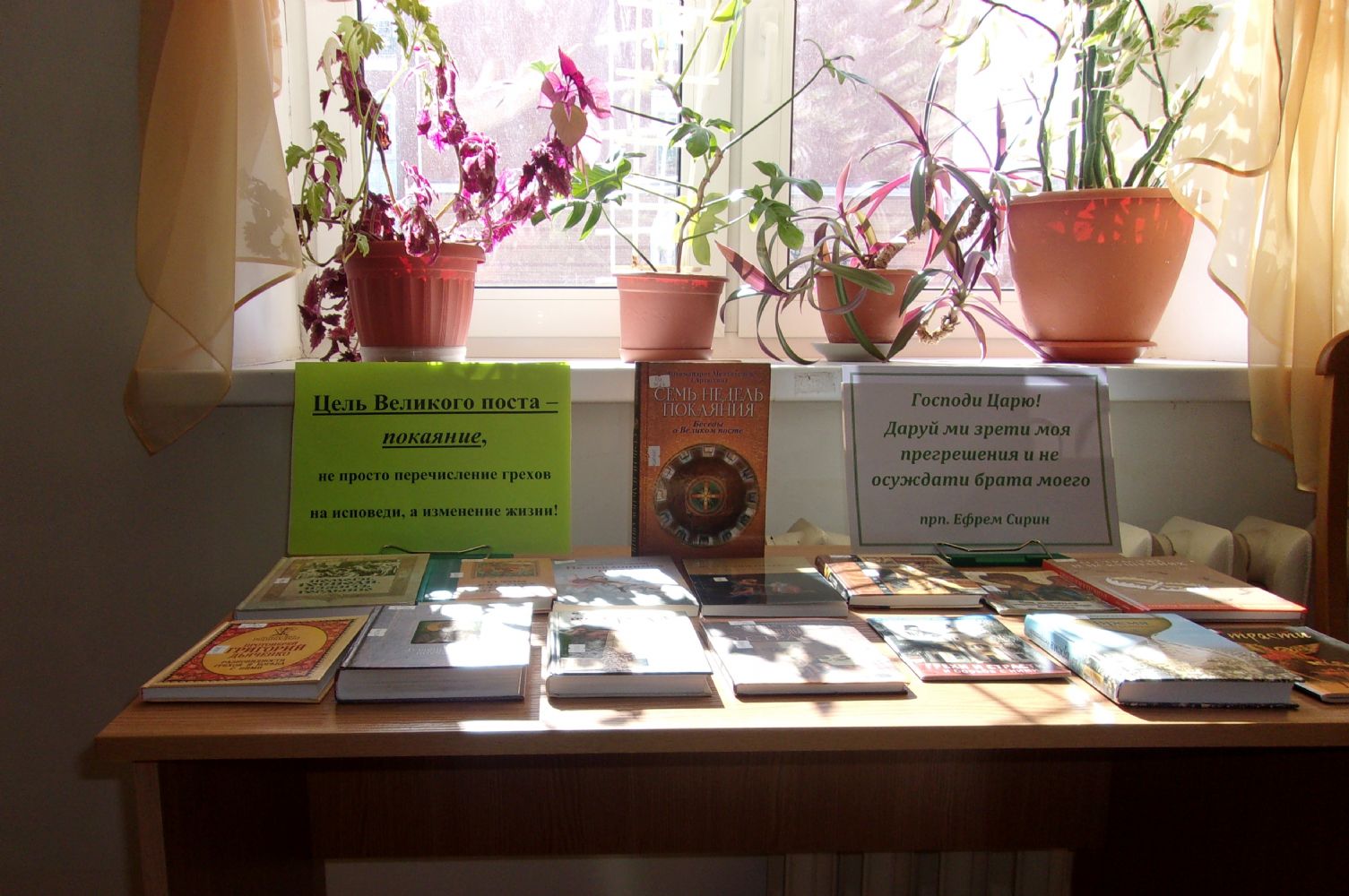 Для посетителей библиотеки были оформлены выставки «Книги монаха Варнавы (Евгения Санина)», «Так бывает… (книги Ирины Рогалевой)», «У Троицы окрыленные (о прп. Сергии Радонежском и Троице-Сергиевой лавре)», «Цель Великого поста – покаяние», «Навстречу детским сердцам (книги Бориса Ганаго)». В индивидуальных беседах с читателями им было рекомендовано немало православной душеполезной литературы.