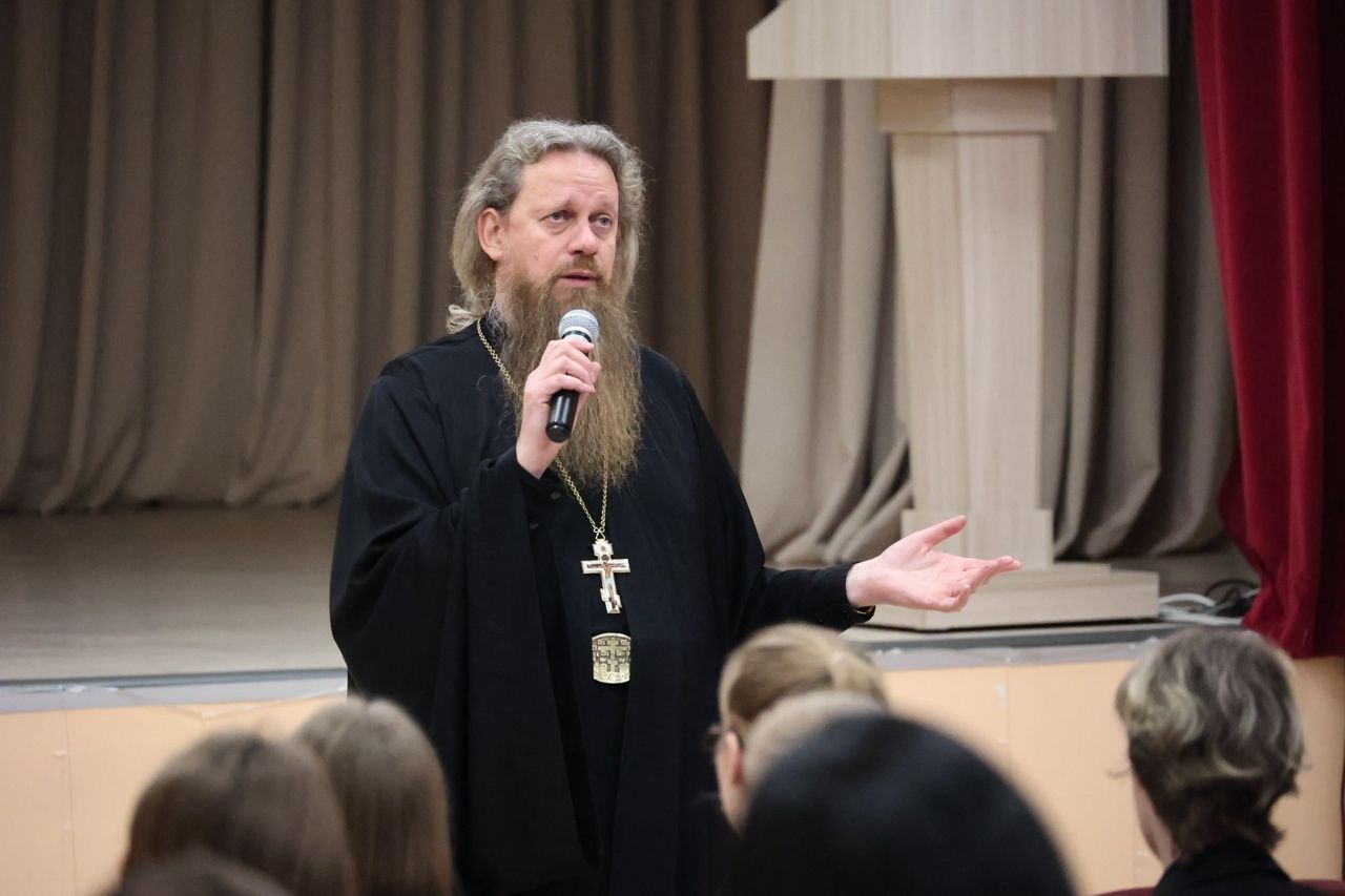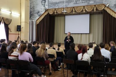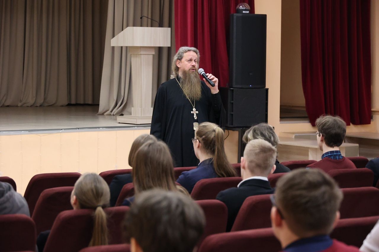 На эту же тему со старшеклассниками Большепаратской средней школы побеседовал исполняющий обязанности заведующего кафедры теологии РГУ, доцент, кандидат физико-математических наук протоиерей Сергий Рыбаков.