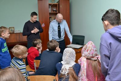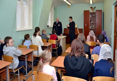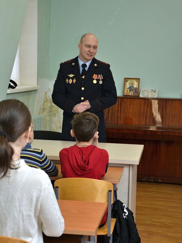 Храм этот – военный, гарнизонный, поэтому здесь большое особое внимание уделяется воспитанию у молодежи патриотизма и любви к Отечеству. В старшей и средней группах воскресной школы «Радость моя» регулярно проходят уроки мужества. В прошедшее воскресенье, 3 апреля, на урок мужества «Герои нашего времени» был приглашен сотрудник Управления внутренних дел по Республике Марий Эл, капитан полиции Павел Сергеевич Полушин.