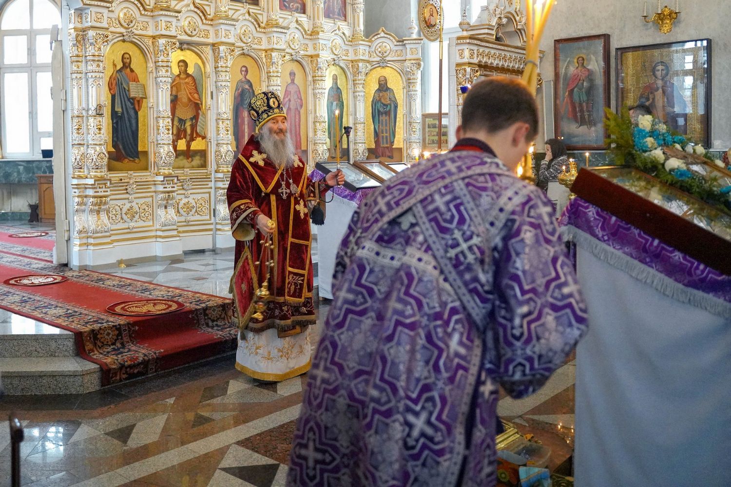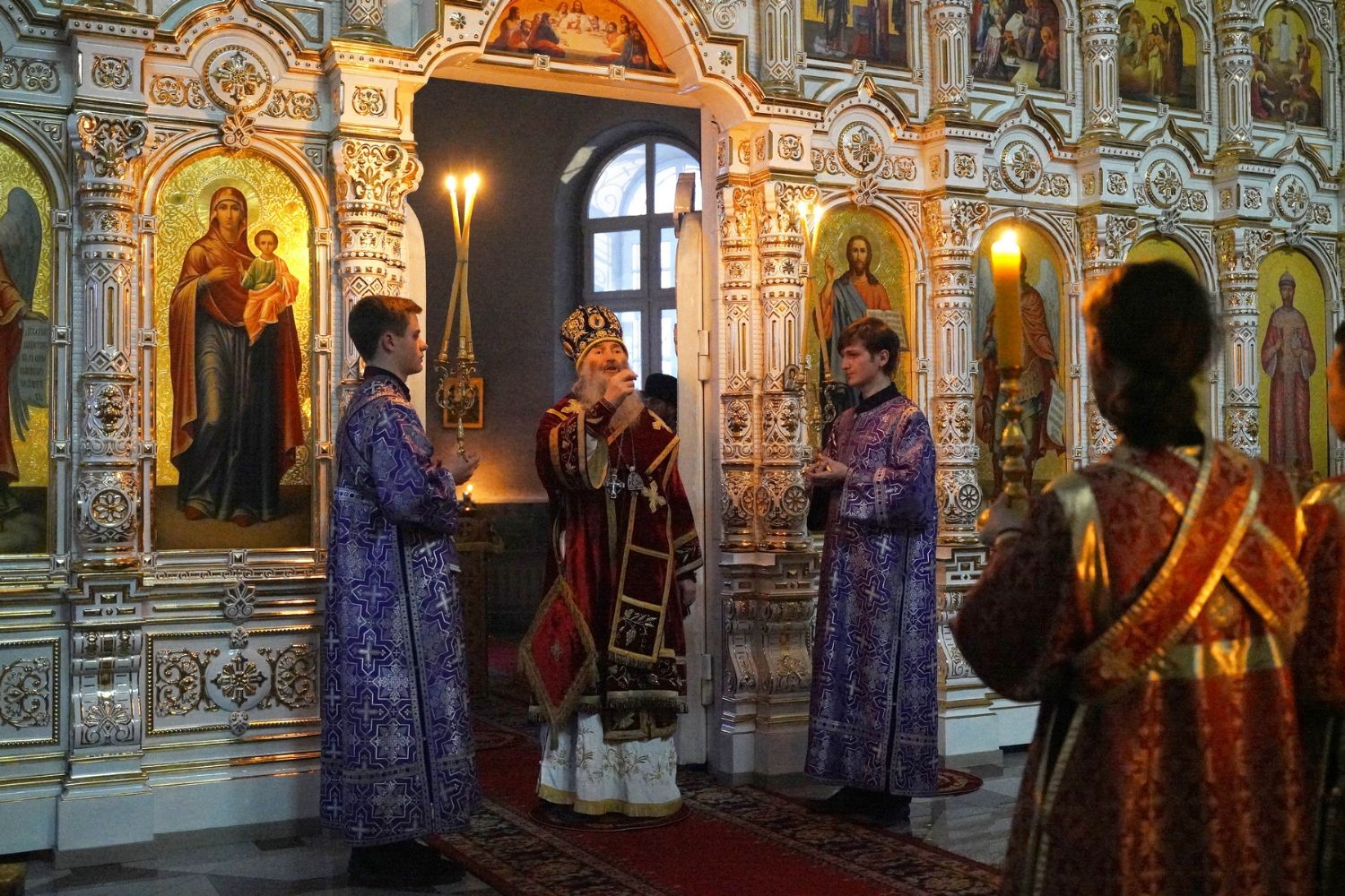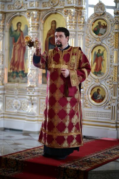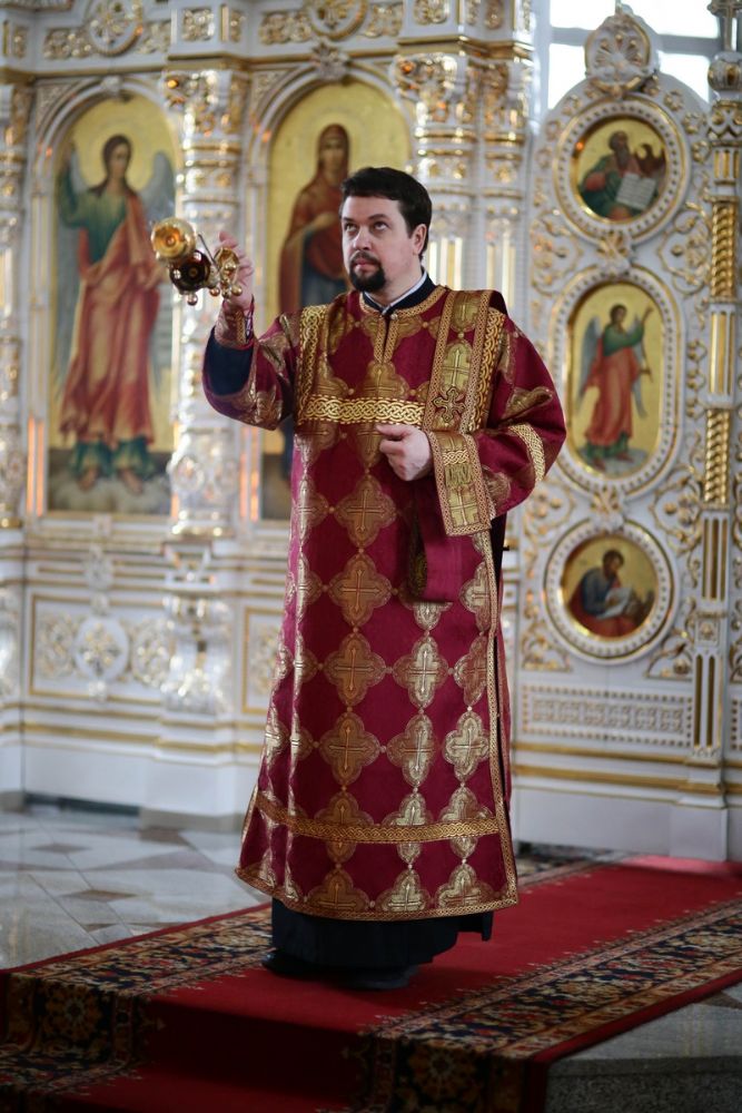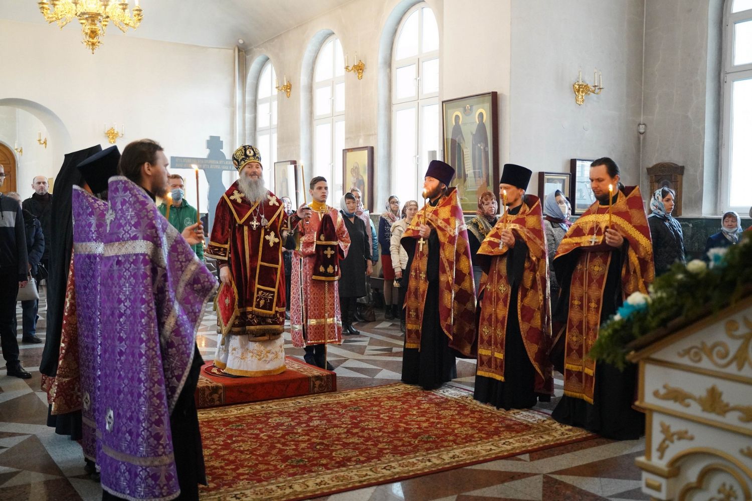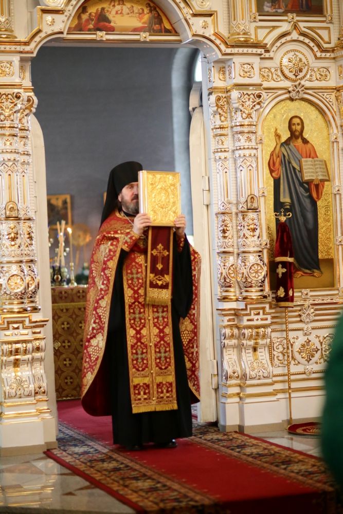 Владыке сослужили секретарь Йошкар-Олинского епархиального управления иеромонах Серафим (Пасанаев), настоятель собора иерей Алексий Кирюшкин, клирики собора и протодиакон Михаил Козловский. Песнопения исполнял хор собора под управлением регента Алисы Вылегжаниной.