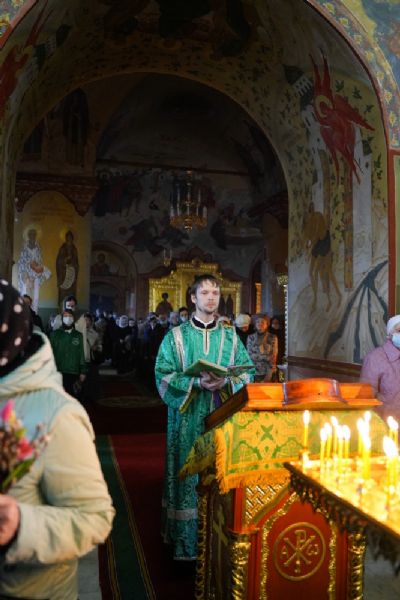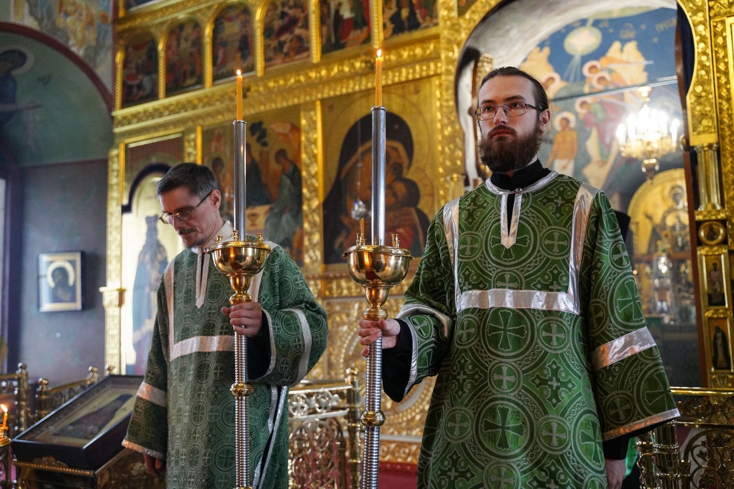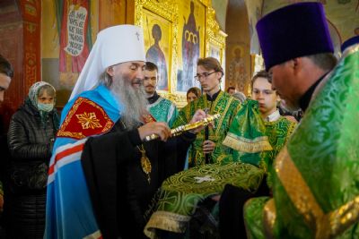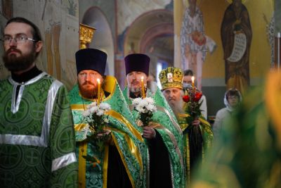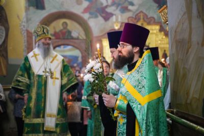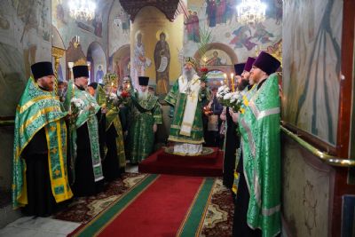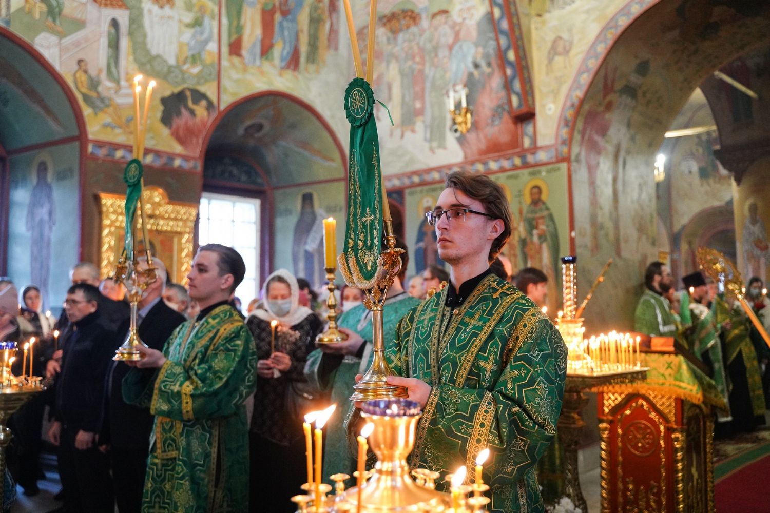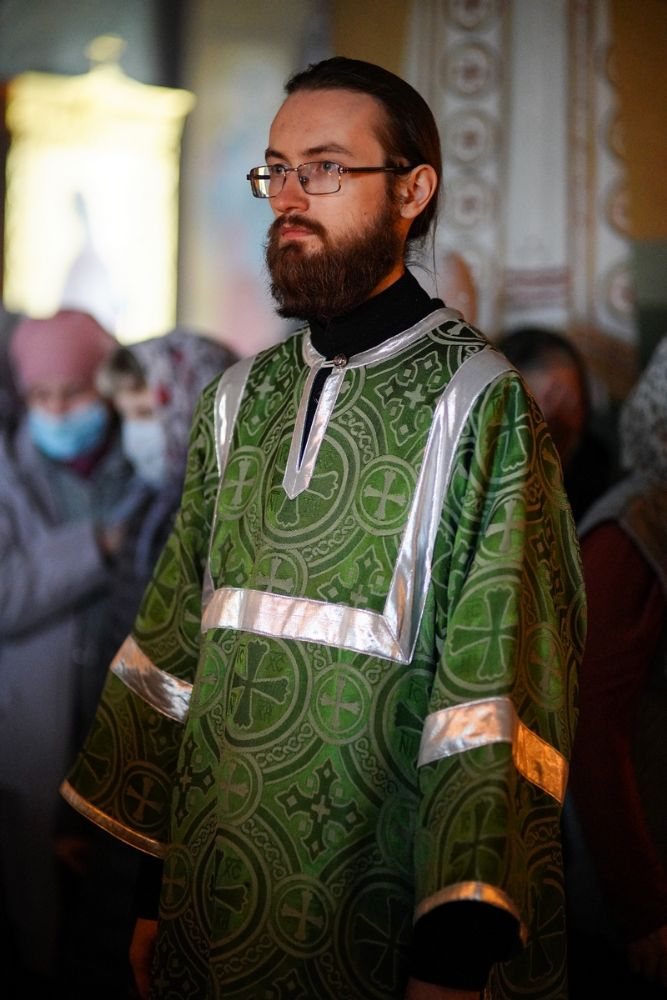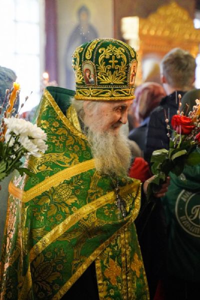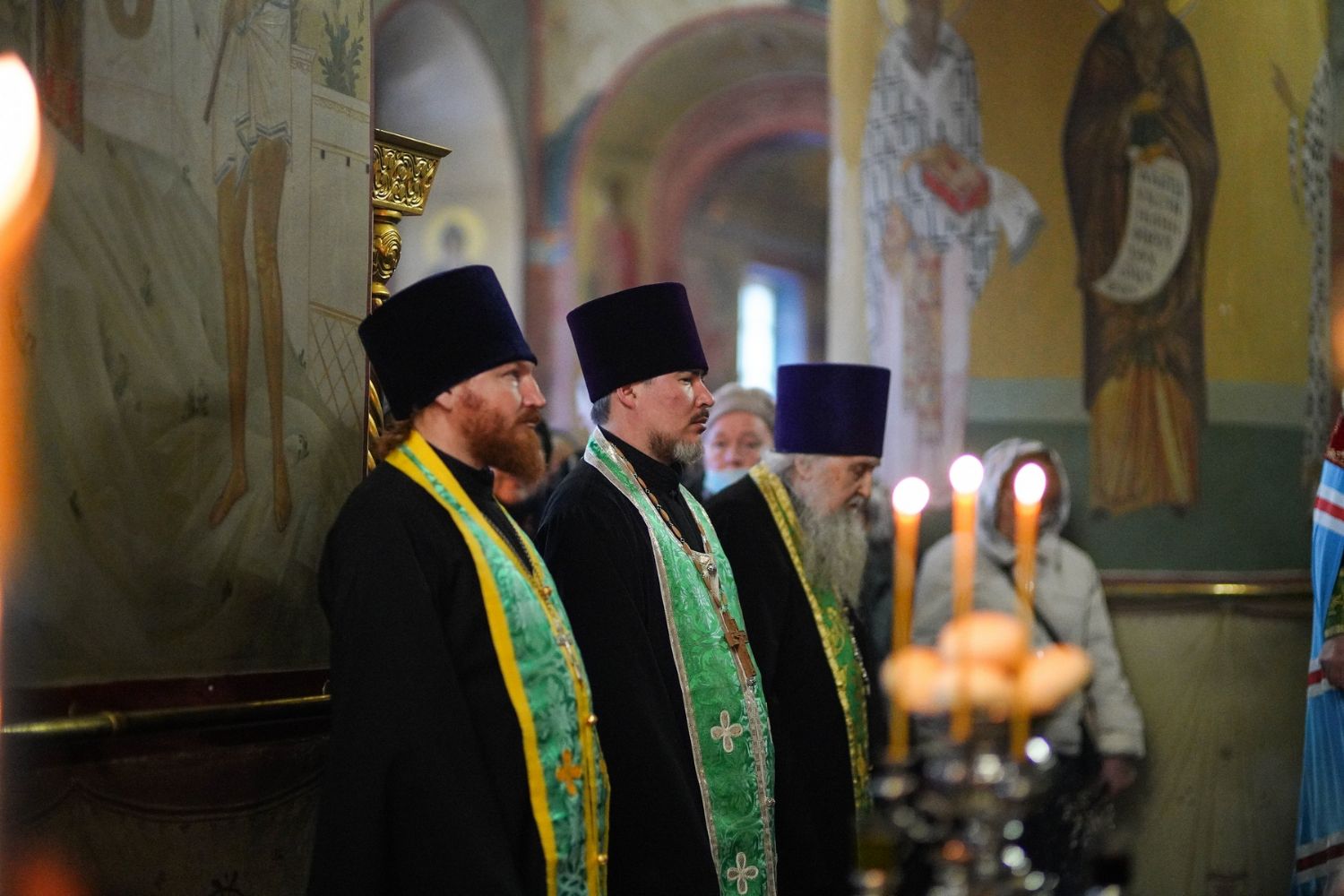 Владыке сослужили настоятель собора протоиерей Евгений Кутырев, клирики собора и протодиакон Михаил Козловский. Песнопения исполнял хор собора под управлением регента Ангелины Бабиной.