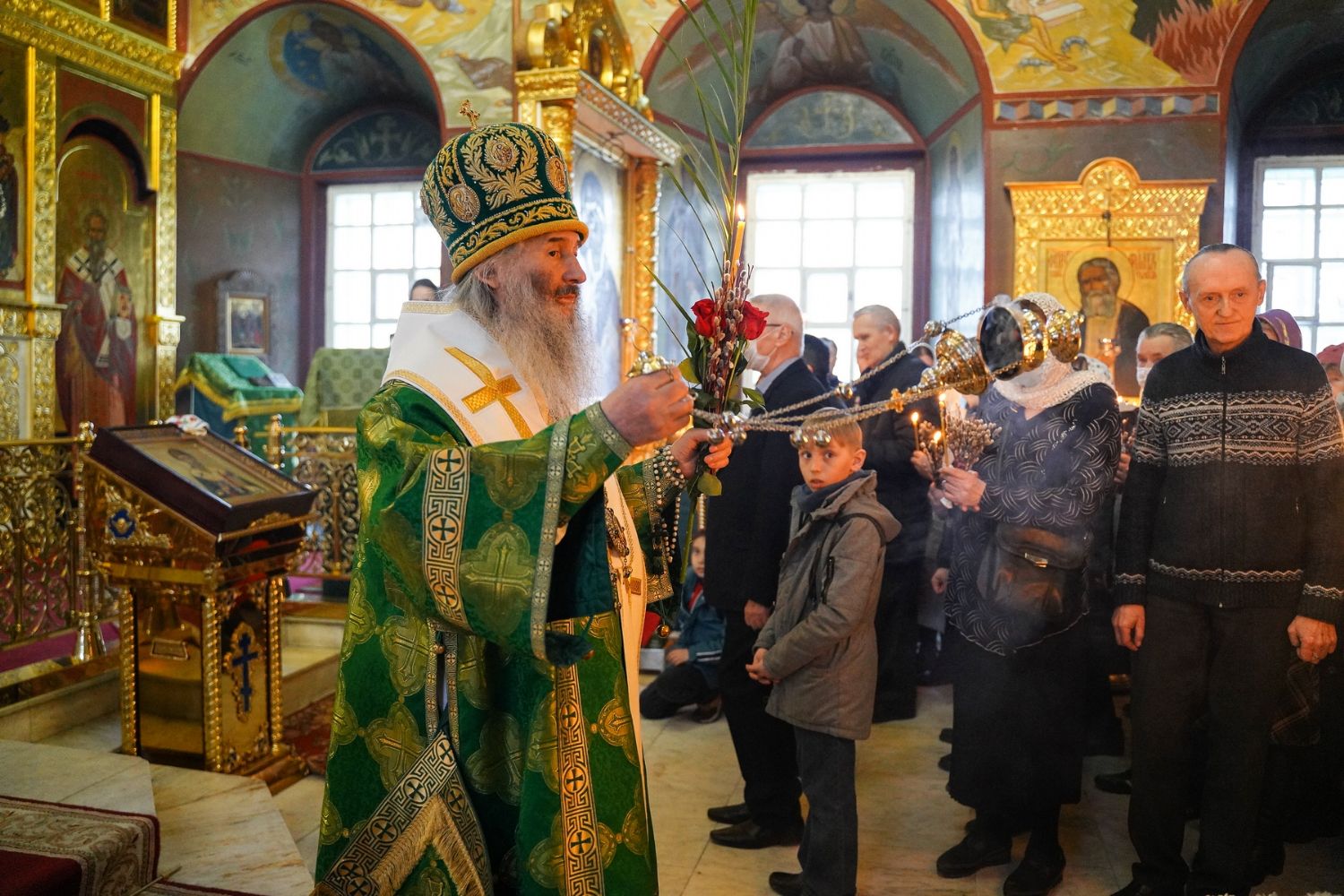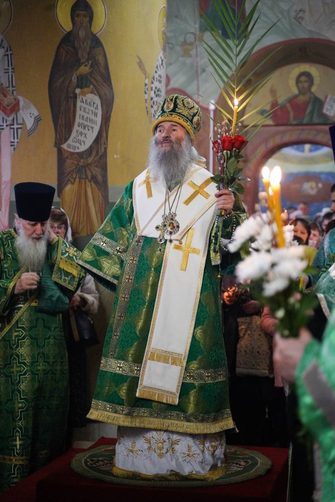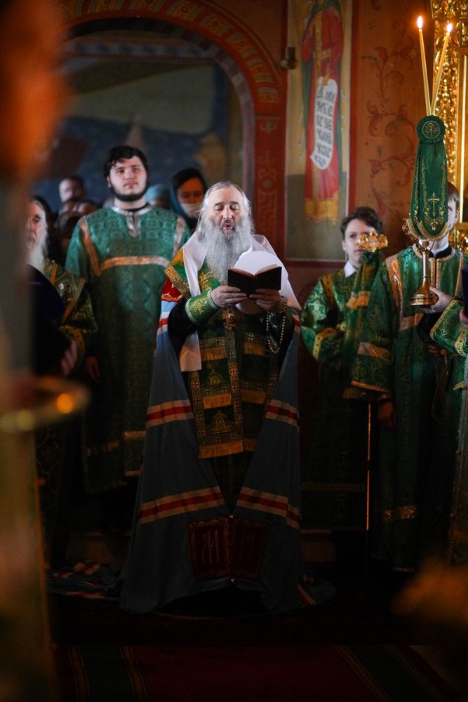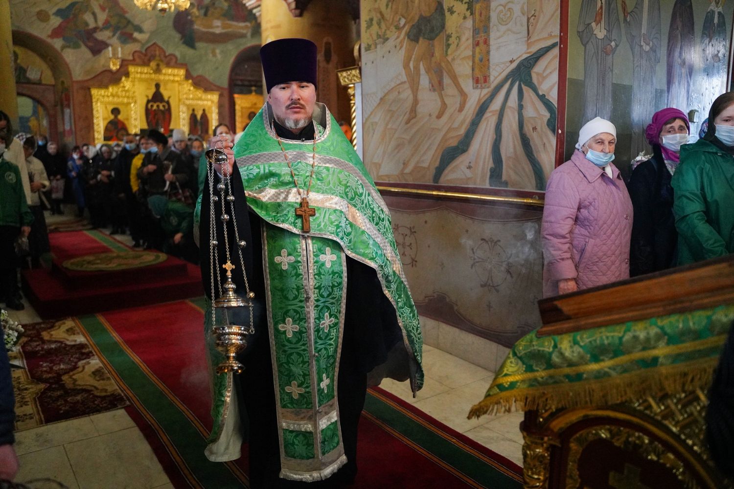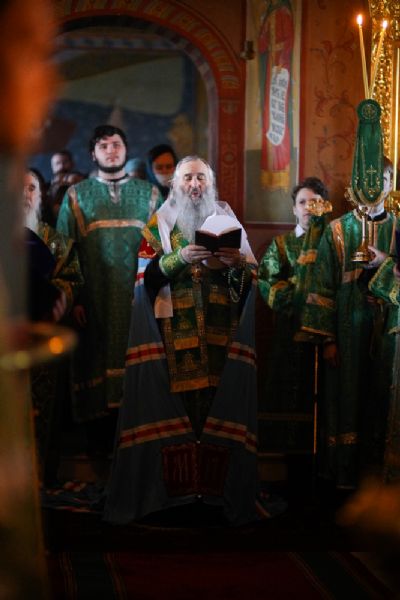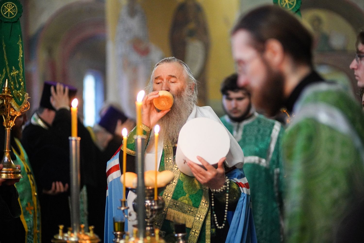 Владыке сослужили настоятель собора протоиерей Евгений Кутырев, клирики собора и протодиакон Михаил Козловский. Песнопения исполнял хор собора под управлением регента Ангелины Бабиной.