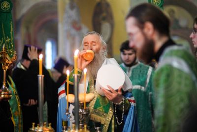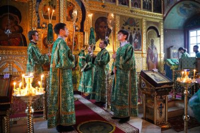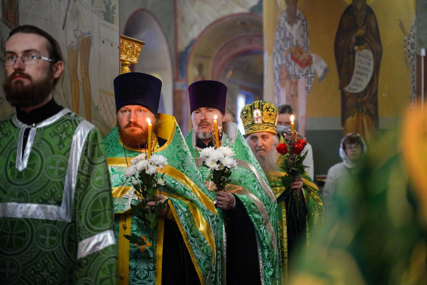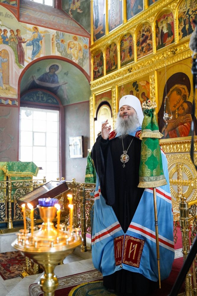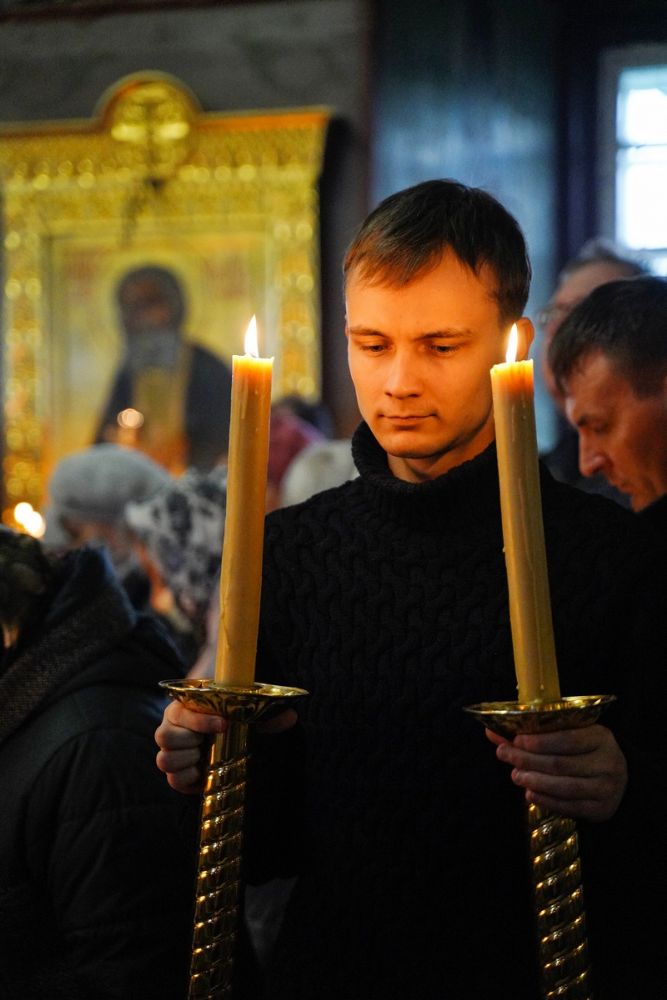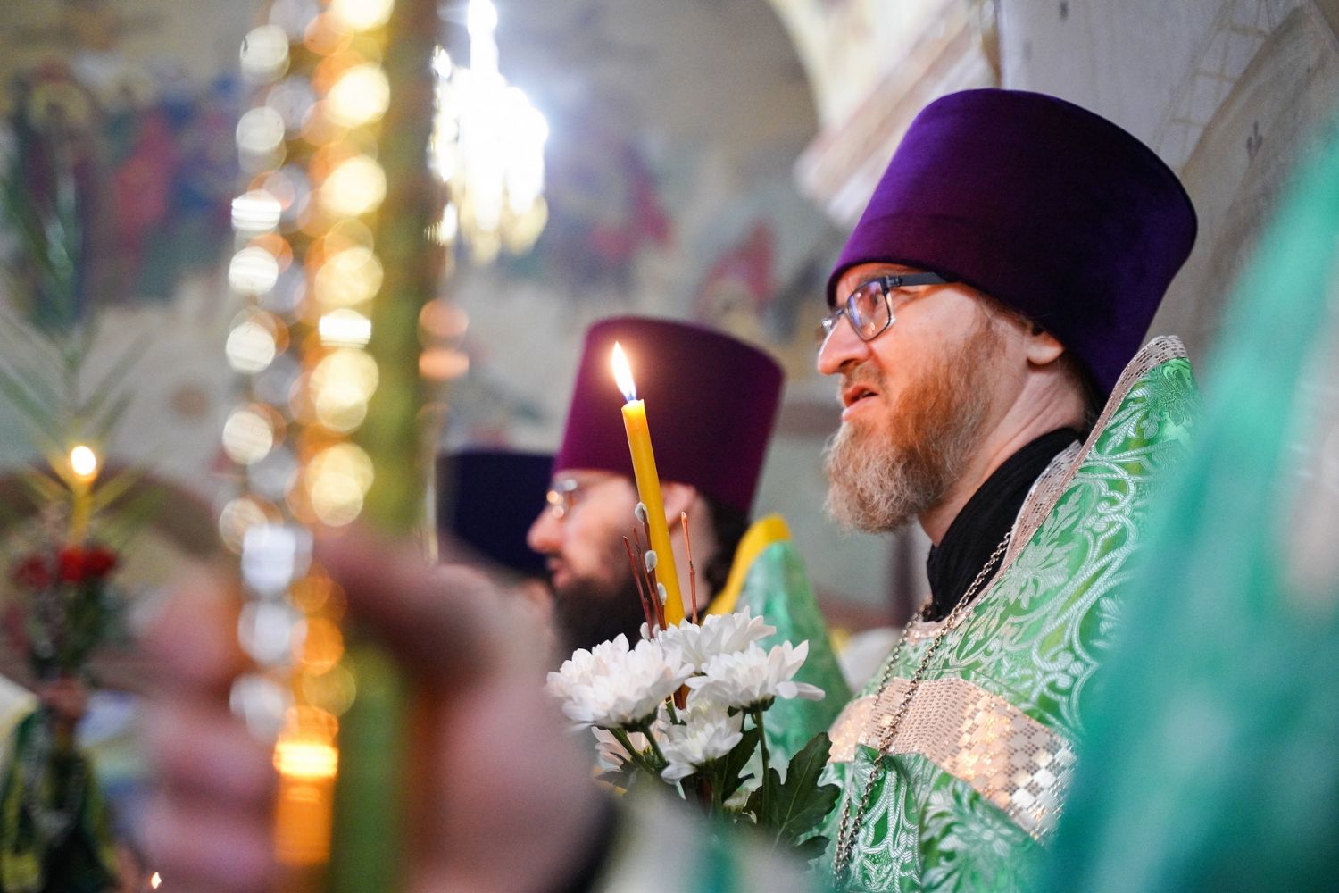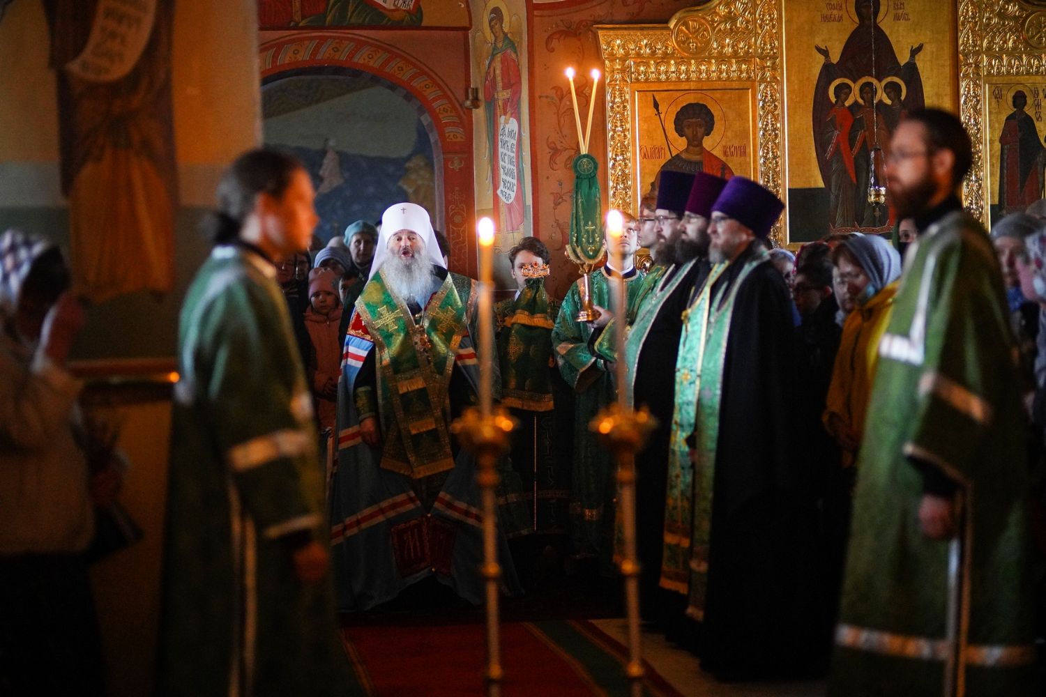 Владыке сослужили настоятель собора протоиерей Евгений Кутырев, клирики собора и протодиакон Михаил Козловский. Песнопения исполнял хор собора под управлением регента Ангелины Бабиной.