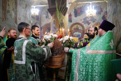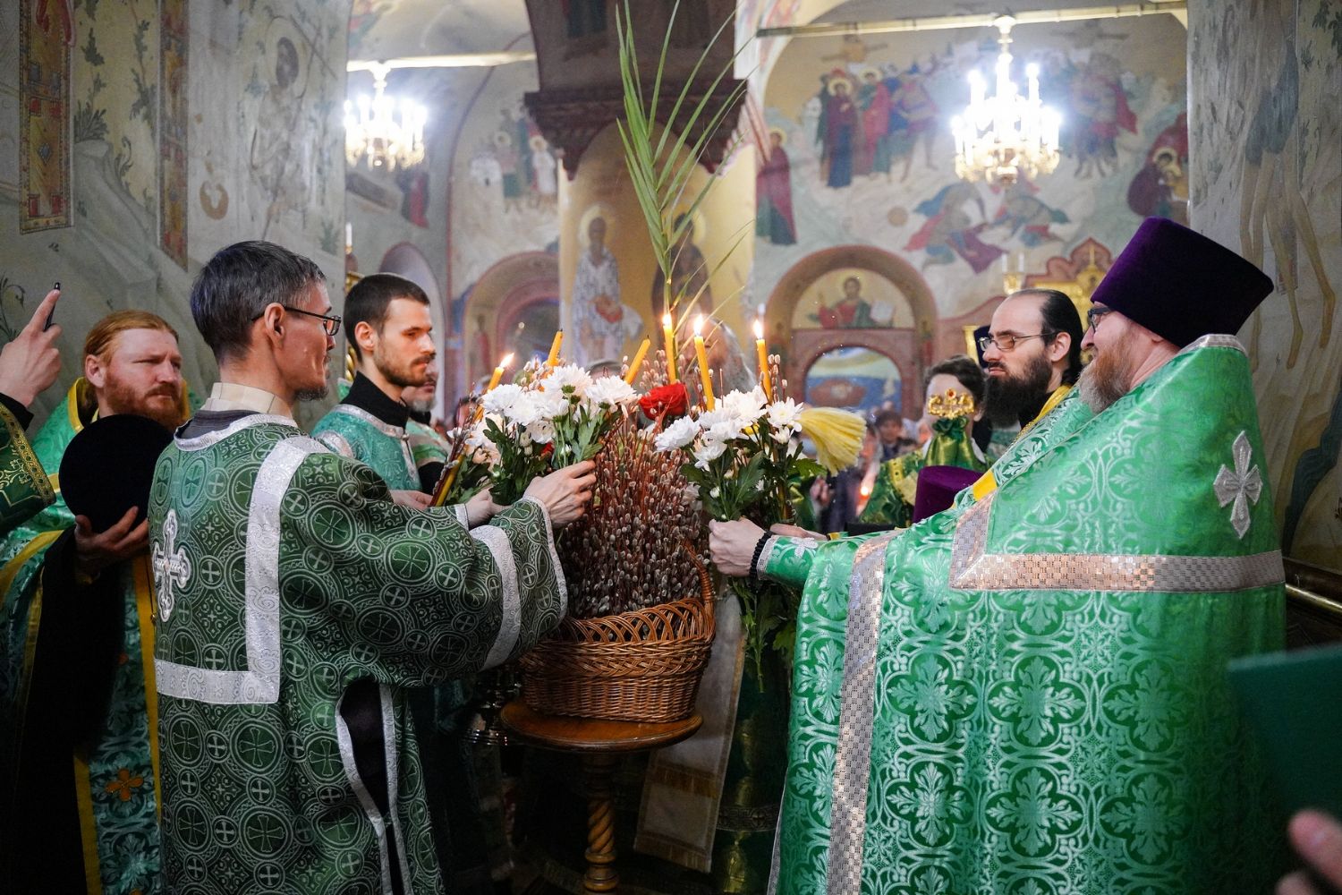За богослужением читались ветхозаветные паремии, прообразующие Вход Господень в Иерусалим, совершалась лития с освящением хлебов, вина, пшеницы и елея.