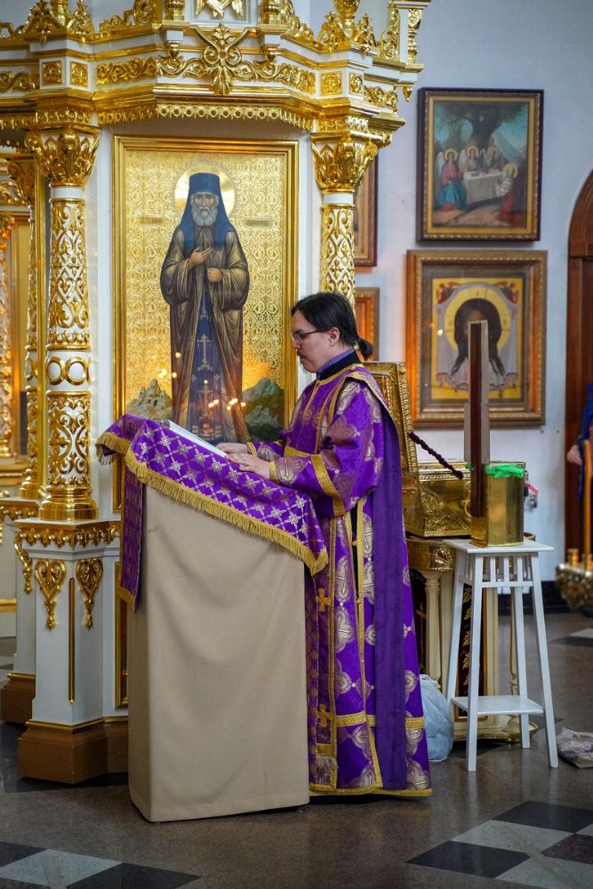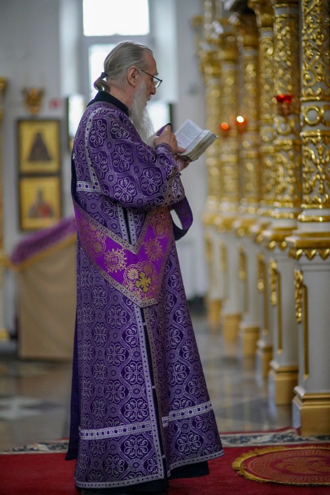После чтения трех кафизм на утрене в алтаре владыка прочитал отрывок из Евангелия от Иоанна (12 глава), повествующий о вольных страданиях и будущей славе Господа нашего Иисуса Христа и вере в Него.