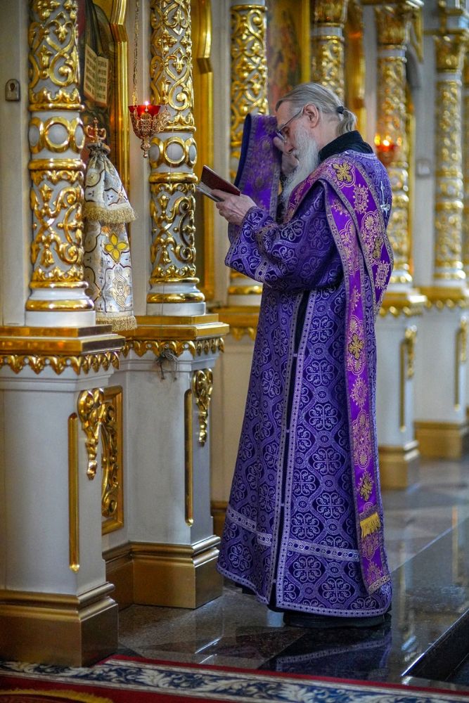 На Великом повечерии в центре храма митрополит Иоанн прочитал канон из трех песен, посвященный событиям Евангельских зачал, читаемых на службах Страстных понедельника и вторника.