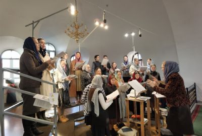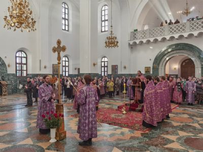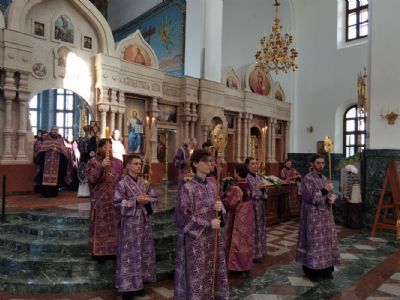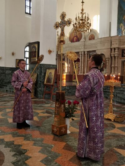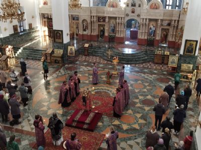 За богослужением пел детско-юношеский хор «Благовест» под руководством регента Татьяны Черновой. Песнопение «Днесь висит на древе...» исполнил перед Распятием иерей Евгений Самойлов. Тропарь «Искупил ны еси от смерти законныя...» и светилен «Разбойника благоразумного…» исполнял мужской хор священства кафедрального собора.