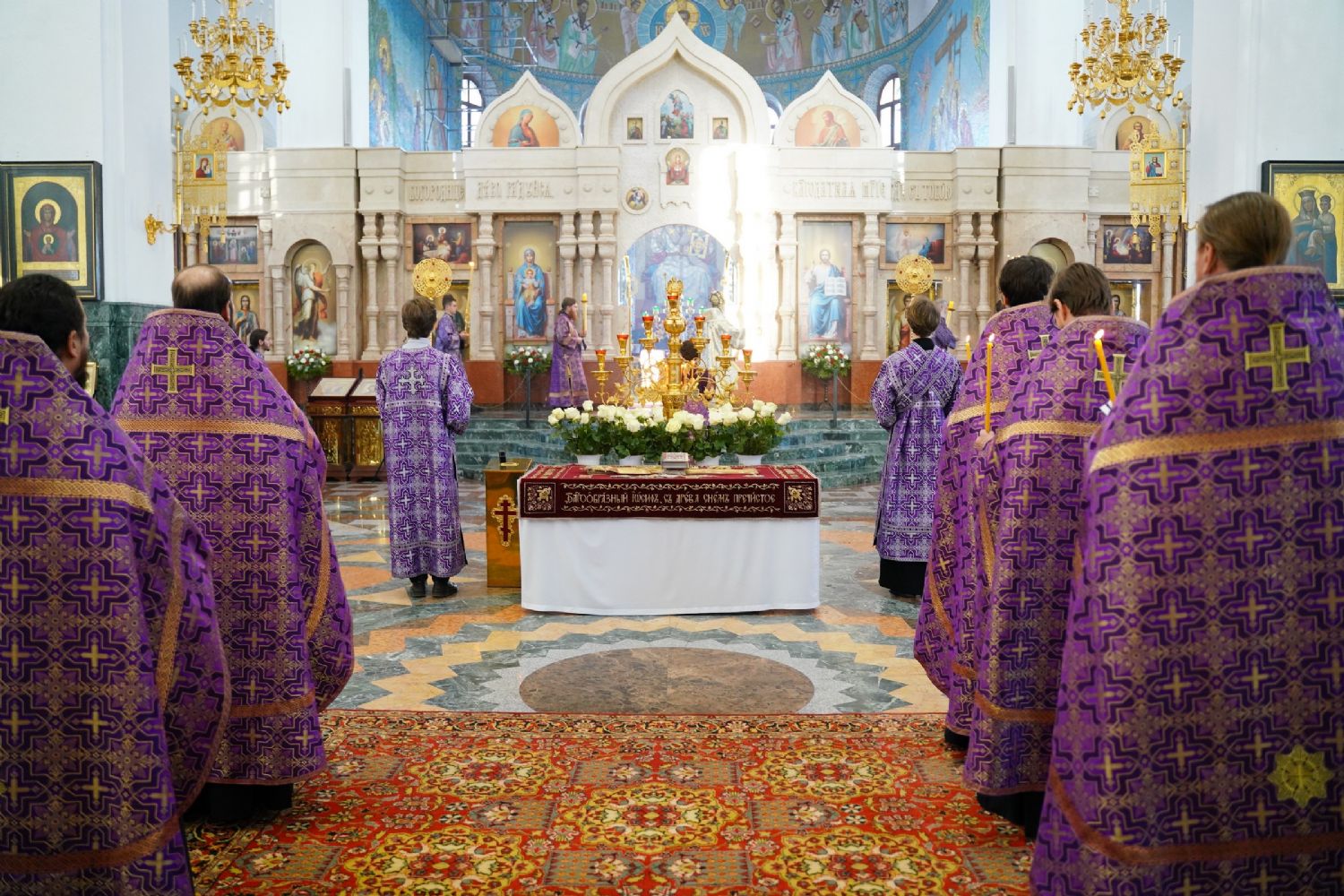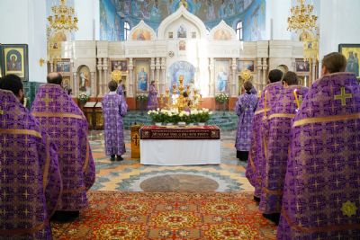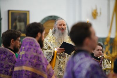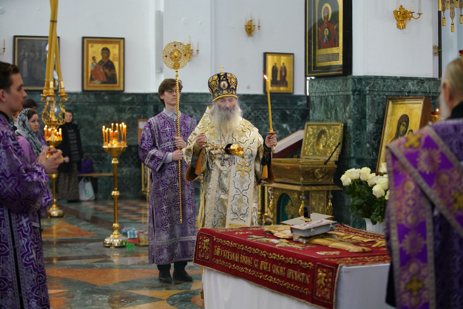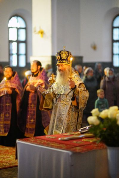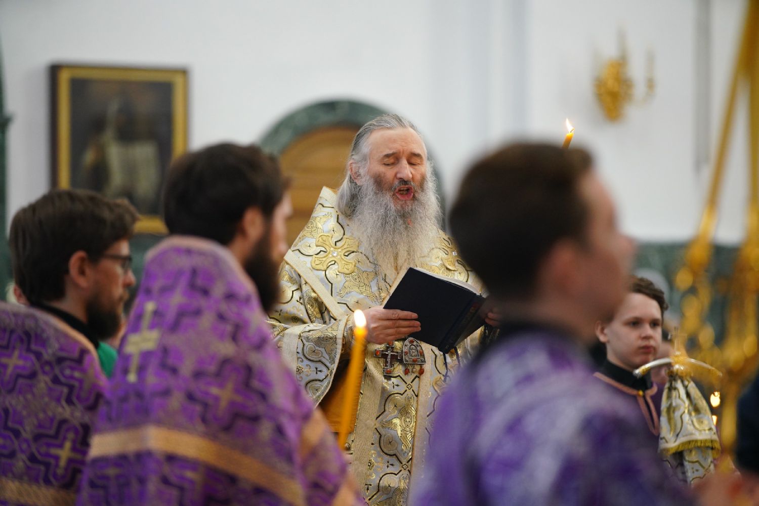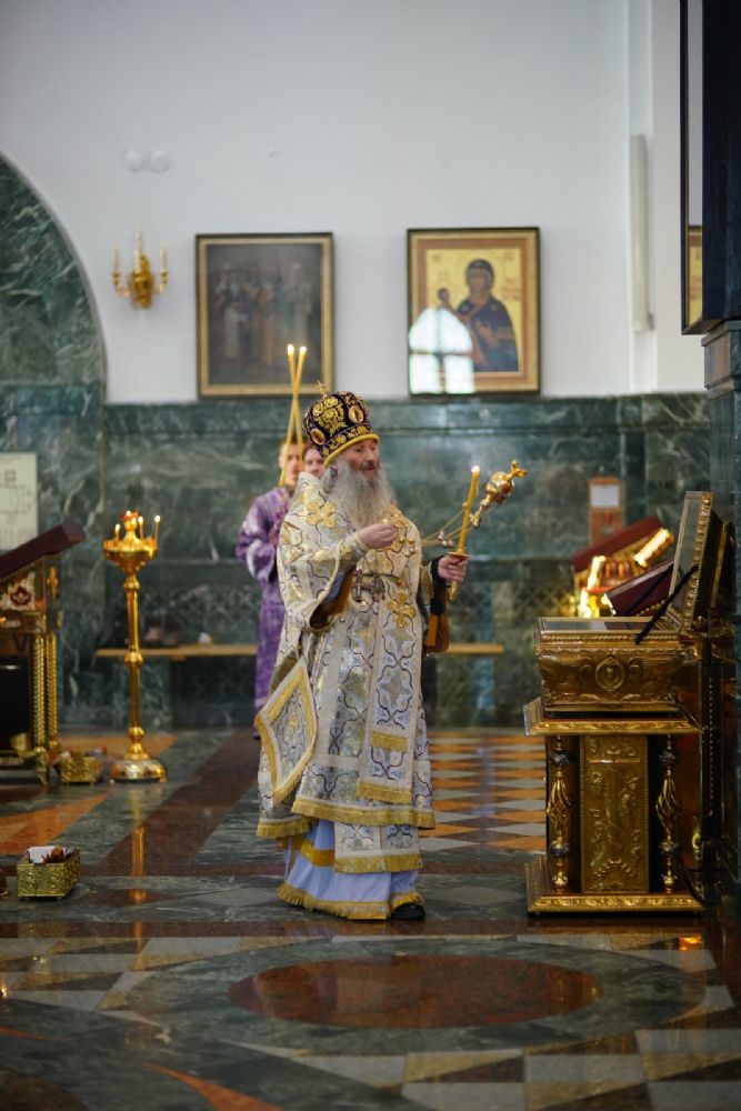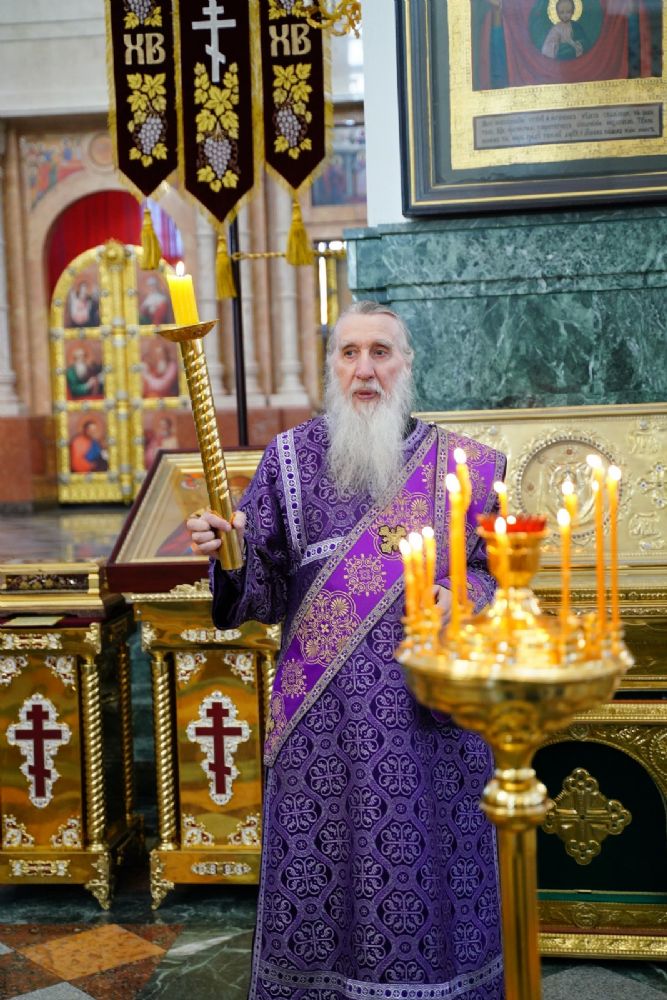 Его Высокопреосвященству сослужили ключарь кафедрального собора протоиерей Сергий Поглазов, протодиакон Михаил Козловский и клирики собора. Песнопения исполнял хор «Благовест» под руководством регента Татьяны Черновой.